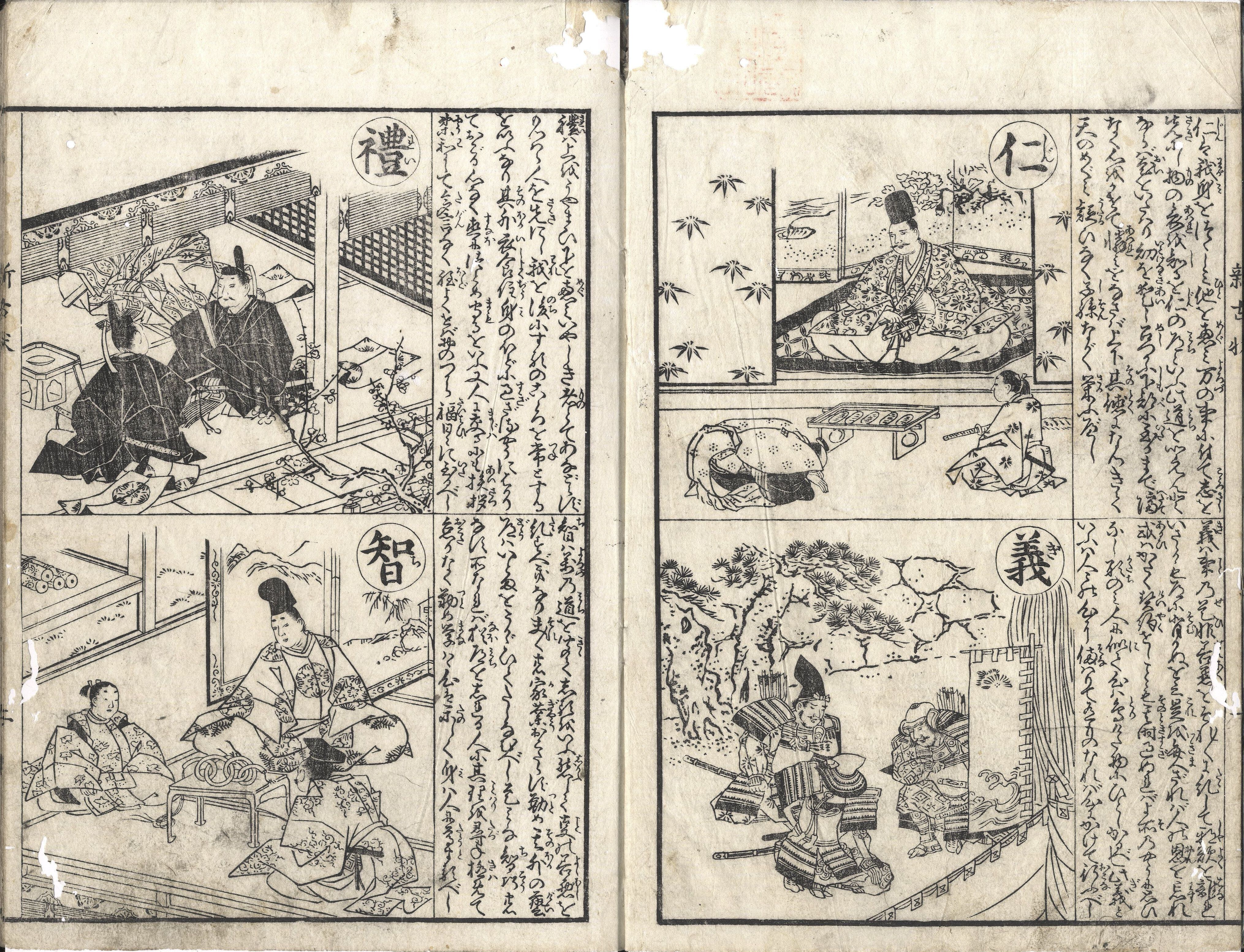 【備考】分類「往来物」。同板別本2種を抄録した。江戸中・後期に広範に流布した『古状揃』にならって十返舎一九が新たに編んだ古状集。いずれも『古状揃』と同様に歴史的人物の重要な事件をモチーフにした架空の書状だが、特に本書は頭書に当該人物の略伝を載せることにより、古状の内容をより理解しやすいものとしている(この点は『忠臣往来』も同様)。収録古状は、道真が臨終間際に書いたとする「謫者菅原通実謹而奉天奏旨趣」、15カ条から成る「楠正成壁書」、朝敵平維盛との対戦を前に義仲が八幡大菩薩に祈願した際の「木曽之願状」、鬼界が島に配流されていた平康頼らを平重盛が大赦した書状「安頼・成常赦免状」を始め、以下、「土佐坊起請文」「弁慶勧進状」「平手政秀諌状」「清水宗治、羽柴秀吉に送る書翰」「同返状」「秀吉公、光秀へ送る口達の書」「同返状」までの11状を収録する。本文を大字・6行・付訓で記す。巻末に、徳目を薬種にたとえて綴った「豊太閤御制法人間一生安泰丸」を掲げる。