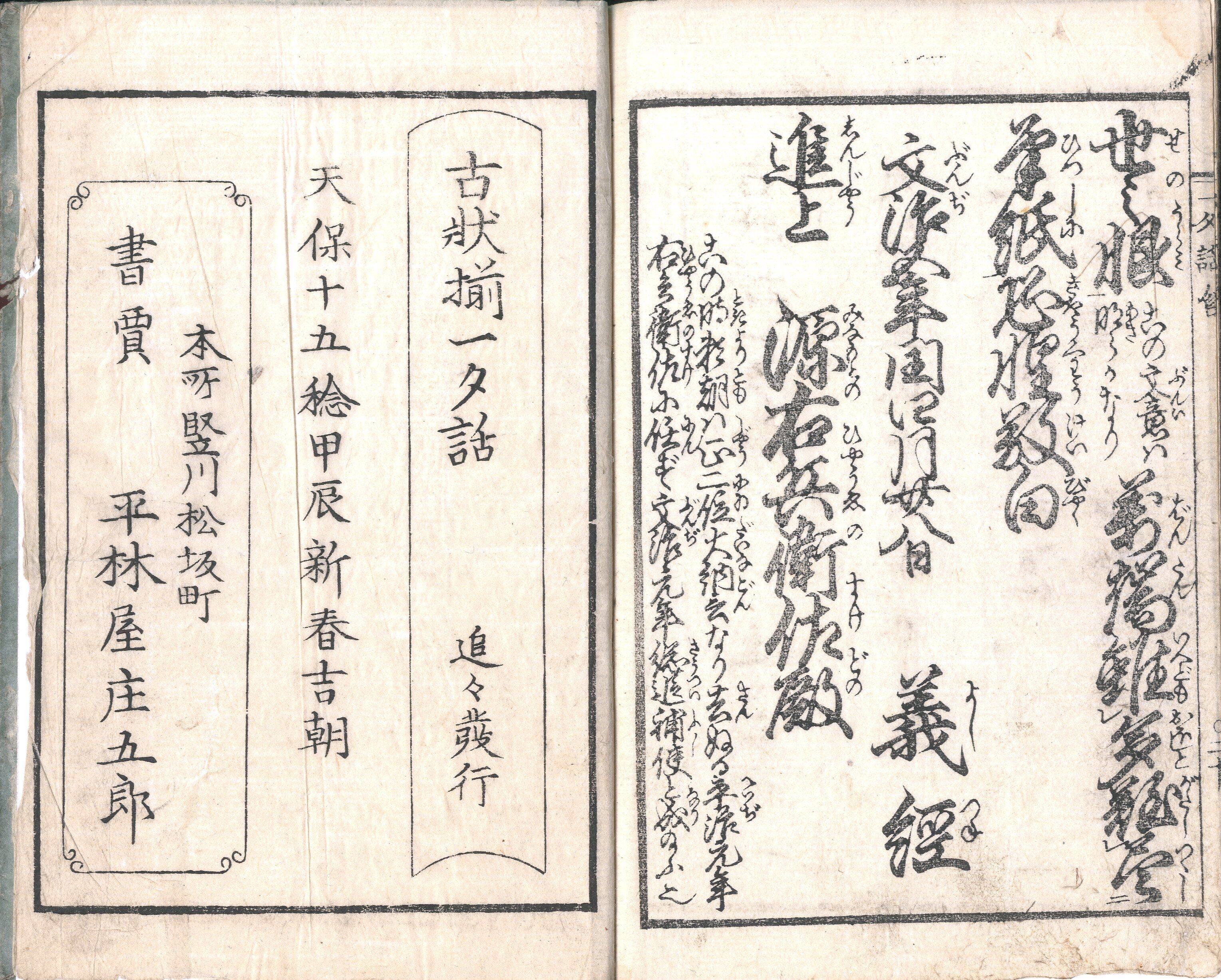 【年代等】天保15年1月刊記・弘化3年初刊([江戸]平林屋庄五郎(収文堂・平林堂)板)。江戸後期後印(刊行者不明)。安政4年再刊([江戸]平林屋庄五郎(収文堂・平林堂)板)。