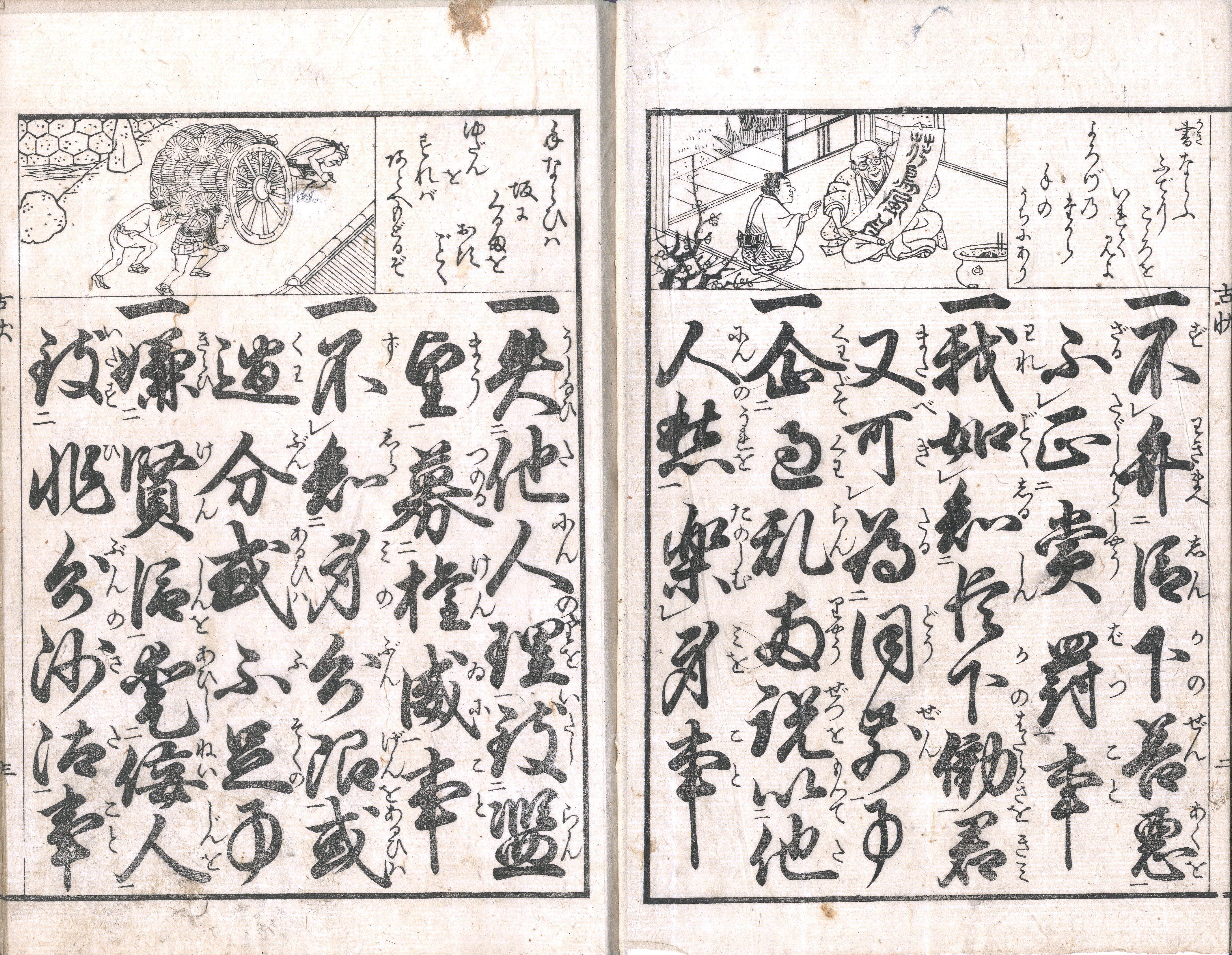 【備考】分類「往来物」。天保4年求板本以下、永楽屋板の諸本5種(本文無訓本・付訓本)を収録(天保板2種と明治元年板のみ全冊収録し、他は抄録)。冒頭の天保4年求板は、色刷り模様表紙。『古状揃』は近世初頭に『今川状』を中心に『腰越状』『含状(義経含状)』『弁慶状』『直実送状』『経盛返状』『曽我状』『大坂状』などの古状・擬古状や、『初登山手習教訓書(手習状)』『風月往来』などを組み合わせて出版した往来物。近世期を通じて最も流布した往来物の一つ。天保4年板(本文無訓本)には、今川状・手習状・腰越状・義経含状・弁慶状・熊谷状(送状)・経盛返状・大坂進状・同返状の9状を収録し、巻頭に「今川系図書」「天満宮御生涯伝」、頭書に「早道童子宝絵抄并字尽」等を掲げるが、本文付訓本とは前付や頭書記事が異なる。