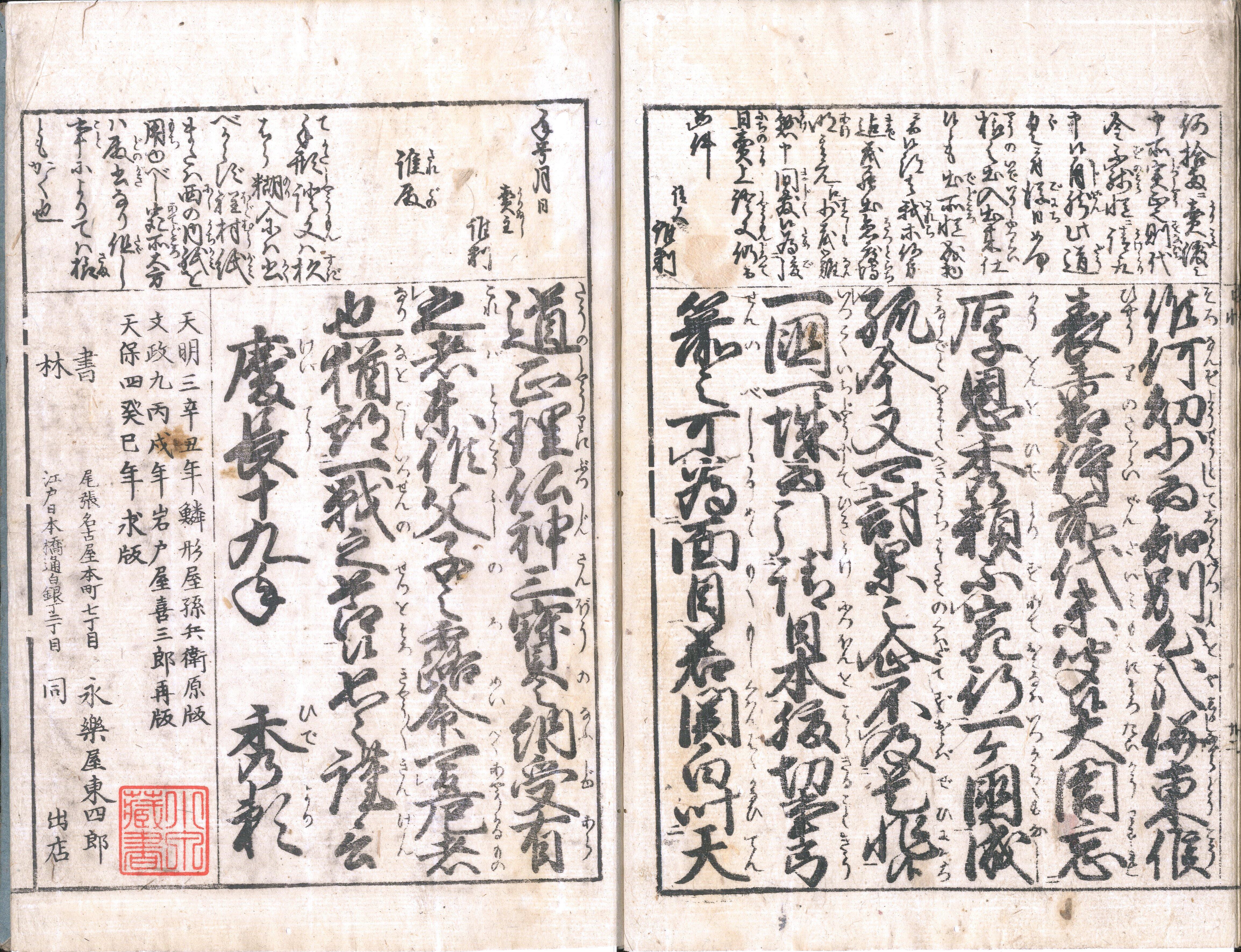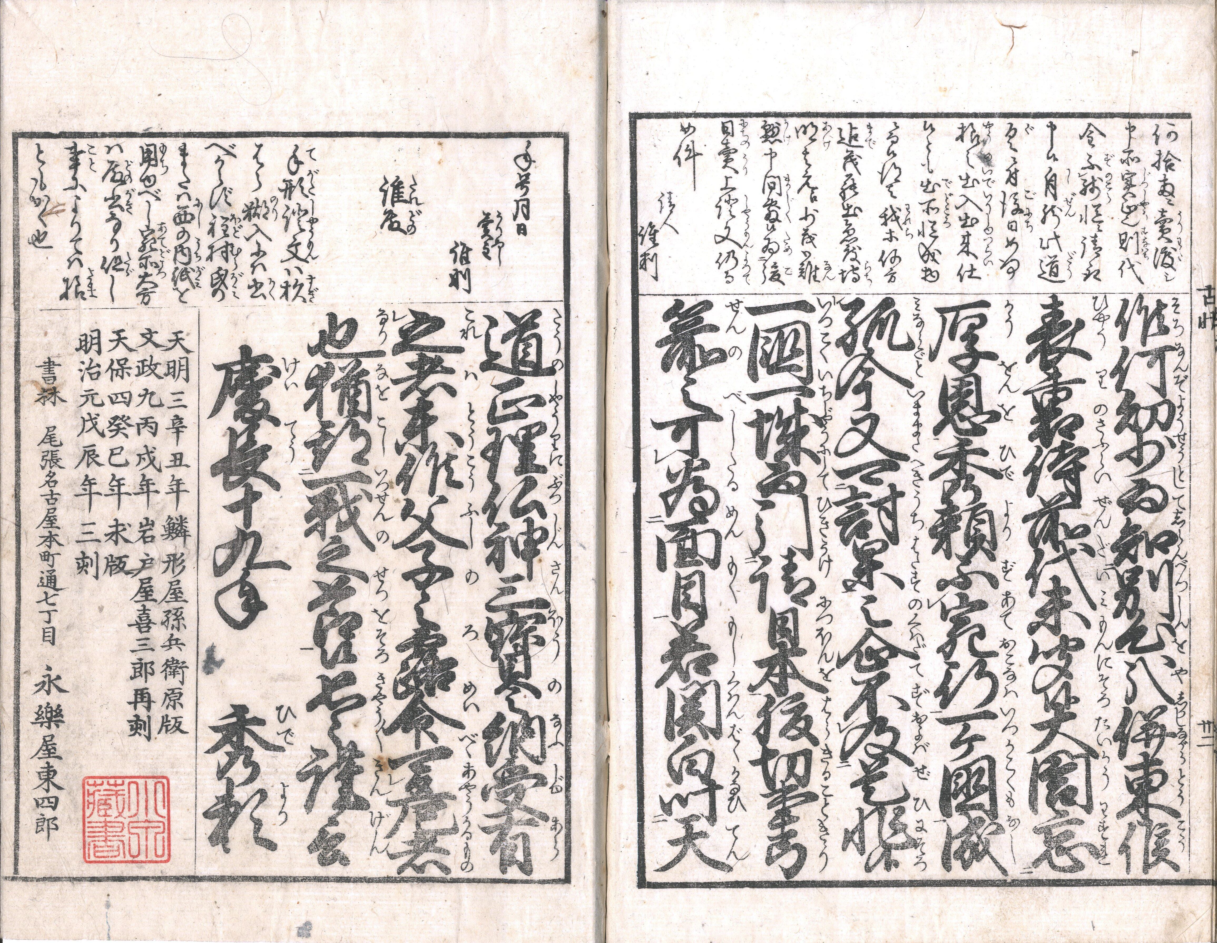 【年代等】天明3年初刊。文政9年再刊。天保4年求板。[名古屋]永楽屋東四郎板。