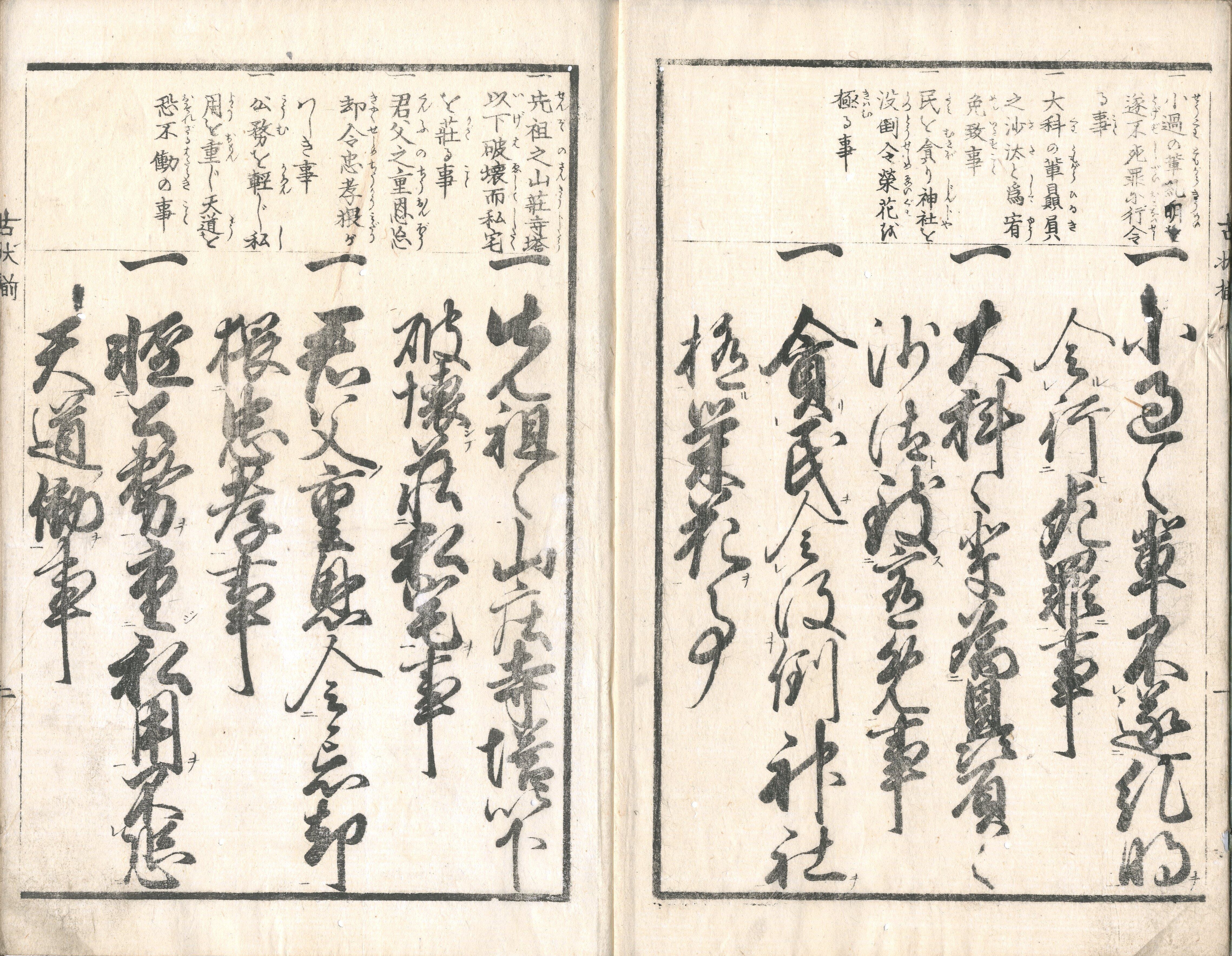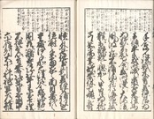 【備考】分類「往来物」。同板別本の原装本も抄録した。『古状揃』は近世初頭に『今川状』を中心に『腰越状』『含状(義経含状)』『弁慶状』『直実送状』『経盛返状』『曽我状』『大坂状』などの古状・擬古状や、『初登山手習教訓書(手習状)』『風月往来』などを組み合わせて出版した往来物。近世期を通じて最も流布した往来物の一つ。底本の『今川古状揃』が、本文に、今川状・手習状・腰越状・義経含状・弁慶状・弁慶勧進帳・熊谷状(送状)・経盛返状・曽我状・同返状・大坂進状・同返状の12状を収録し、頭書に「本文読法(総振り仮名付き本文)」等を掲げる。
