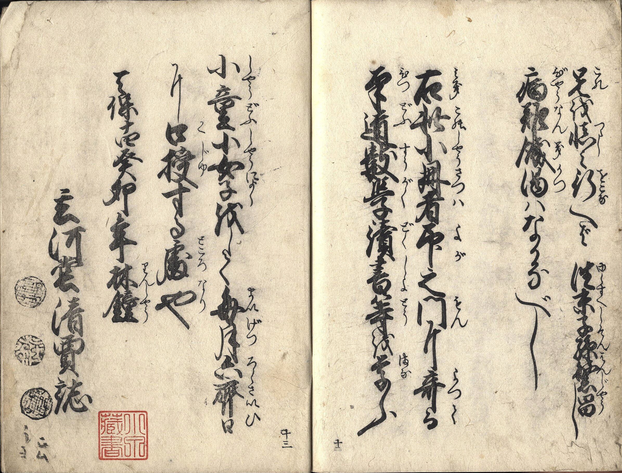 【備考】分類「往来物・教訓」。寺子屋師匠である著者が毎月6回(六斎日)に門弟の児女に教授した教訓書。著書による私家版か。なお、裏表紙の「国民精神文化研究所・志田印」から国文学者・志田延義(1906-2003)の旧蔵書と判明。