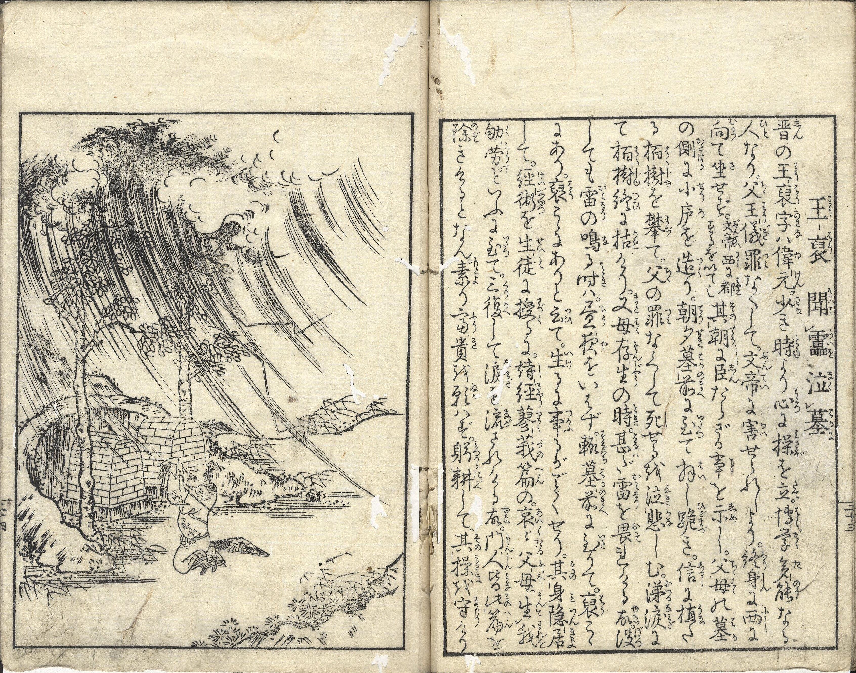 【判型】半紙本1冊。縦226粍(天明板)。【作者】岡田玉山作・画。【年代等】天明8年1月初刊。[大阪]池永太郎吉ほか板。【備考】分類「往来物」。彫工:松井忠蔵。末尾に寛政5年板、江戸後期板2種を抄録した。『二十四孝』の絵抄本。本書見返によれば「初に四言の標題を大書し、素読して勧孝の助とし、次に其図を画き、孝子の徳行をあらはし、百行の始たる教訓を示す」とある。四言標題を楷書・大字・5行・無訓、孝子小伝を行書・小字・12行・付訓で記す。本書は天明8年初刊と考えられるが、寛政元年に再刊された後、寛政4年に『画本廿四孝』と改題された。また、元禄11年刊『俗語教・道戯興』の板木を一部改刻した『新実語教・新童子教』を後半に合綴した『〈増補〉絵本二十四孝』など種々の類本がある。