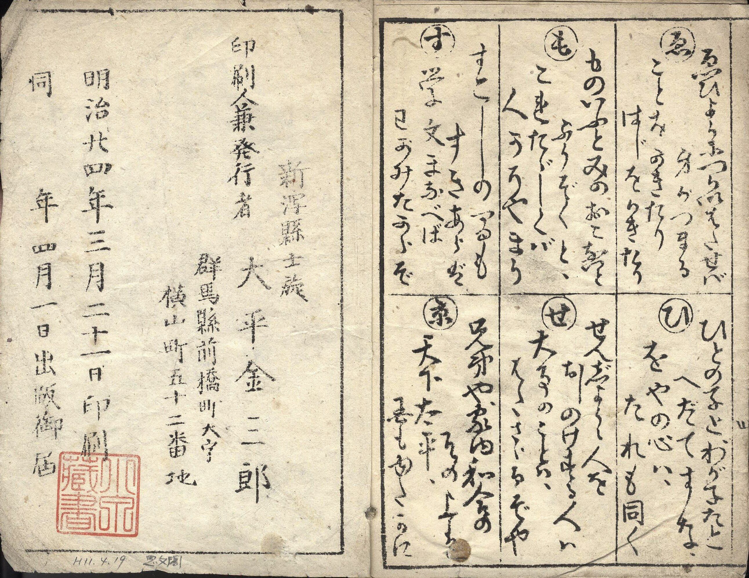 【判型】中本1冊。縦169粍。【作者】不明。【年代等】明治24年3月刊。同年4月出版届出。[前橋]大平金三郎板。