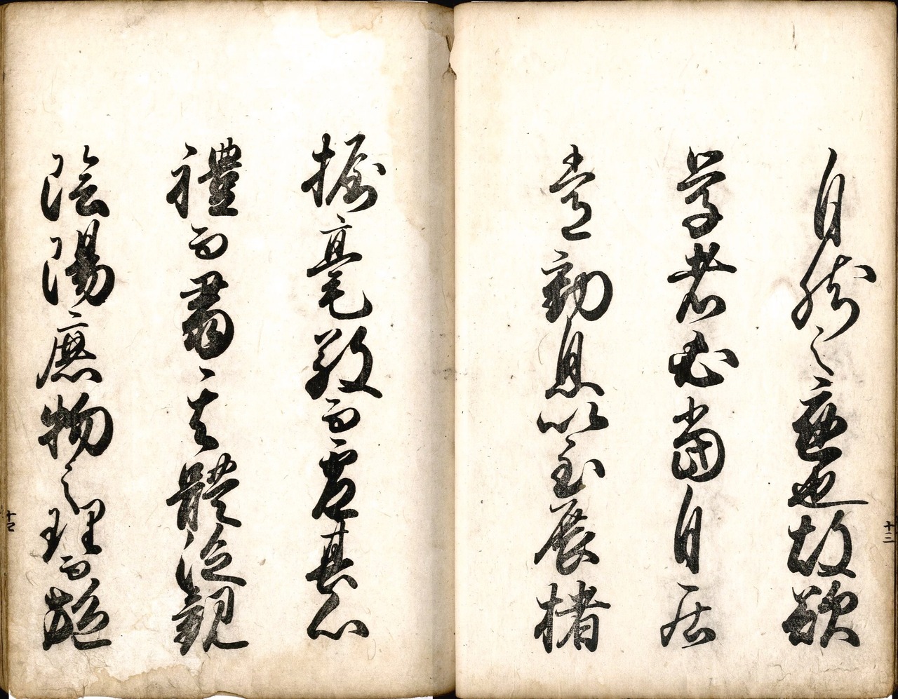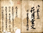 【備考】分類「往来物」。『花月堂文[〈御家支流〉花月堂文〈并筆道有本篇注解〉]』は、「家流有本篇(いえりゅううほんのへん)」「もしほ(藻塩)」等から成る手本。「家流有本篇」(作者不明)は御家流筆道の根本を述べた書の意味で、和漢の文字濫觴、書流・能書のあらましや、初筆修行の要点などを綴ったもの。続く「もしほ」(樋口宗武作)は、「御手習おほし召立候よし、まことに殊勝の御こころさしにて候…」で始まる仮名文で、和漢能書の故事など引きながら、書道の基本的心得や基礎知識を記したもの。主文に続けて、「御返し」と題した2通の返状で、代表的な筆道書や文房四友の名産地などに言及する。いずれも本文を大字・3行・無訓で記す。また巻末に、「家流有本篇」を数段に分けて詳しく解説した「家流有本篇註解」(樋口宗武注)を掲げる。
