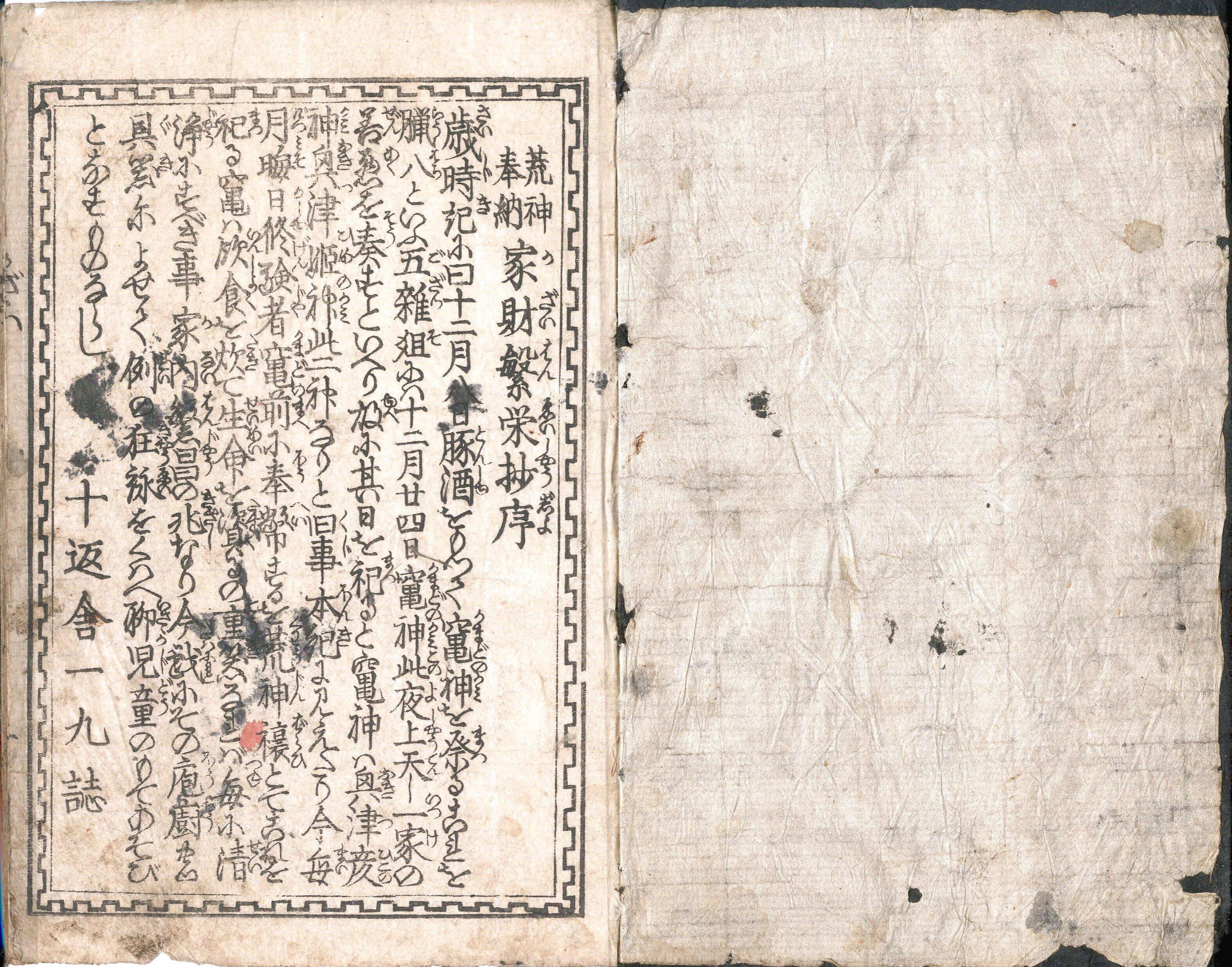 【備考】分類「往来物・合巻」。前後2編のうち前編は準往来物で、家財、特に厨房で使用する諸道具を題材にして詠んだ教訓歌を主とする。一例を示せば、「鍋黒丸(なべのくろまる)/身のほどを汁の実にせよ、破鍋(われなべ)にとぢ蓋せしぞこゝろ安けれ」のように諸道具を歌仙に見立てて各1首ずつ合計38首を書き連ねる。頭書には「鬼は外、福は内」を洒落た「かにはそと、ふぐはうち」のような地口・前句を集めた「魚づくし地口」「青物尽地口」「鳥づくし地口」「獣尽前句集」「虫尽前句集」を掲げる。なお、後編は中国渡来の仙人について述べた戯作である。