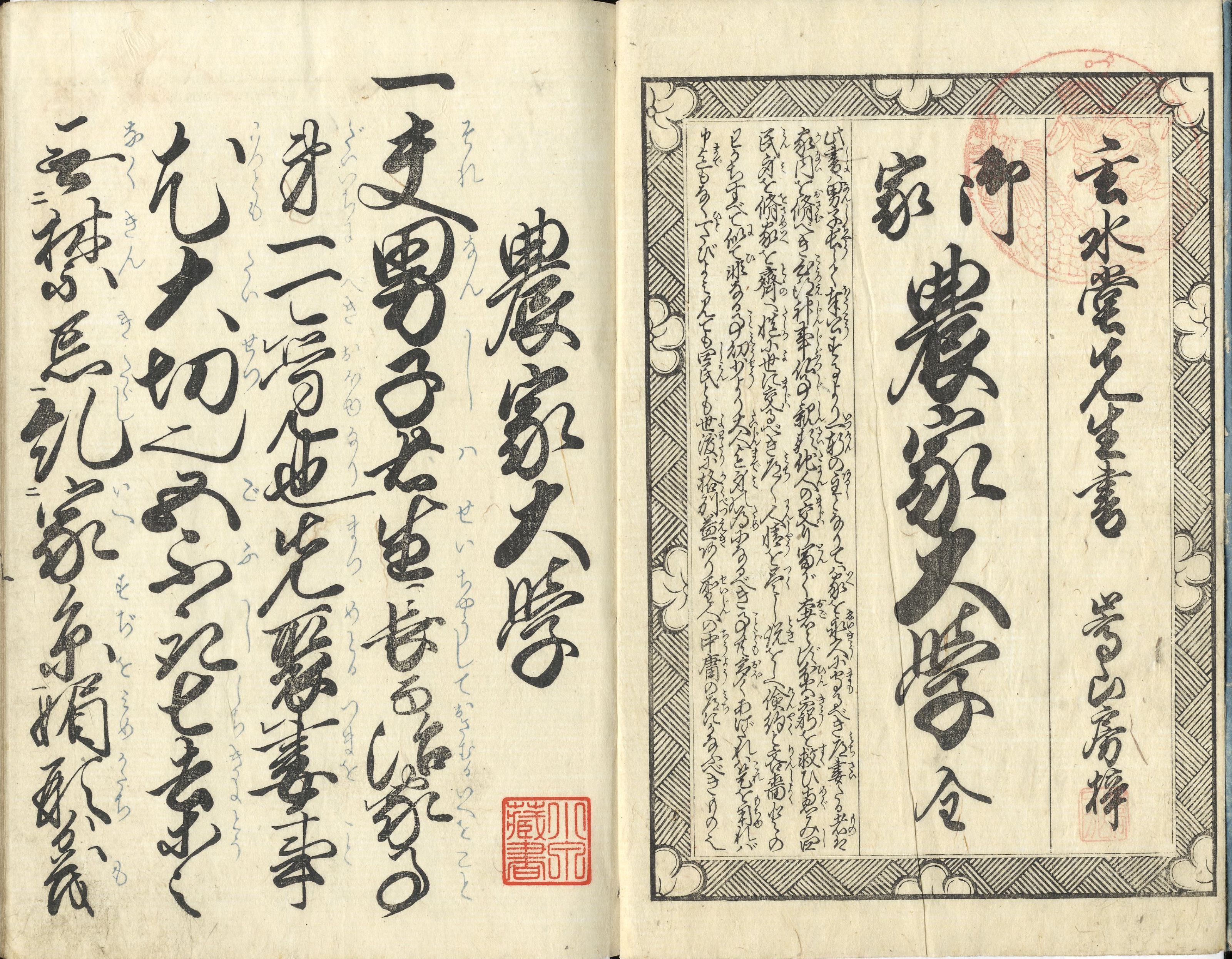 【備考】分類「往来物」。作者は南総周准郡大鷲村住人。奥付は版本の写しか(別本の刊記も掲載)。文政13年に『農家大学』と解題・刊行([江戸]小林新兵衛板)。末尾にこれら改題本数種を抄録した。