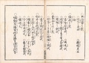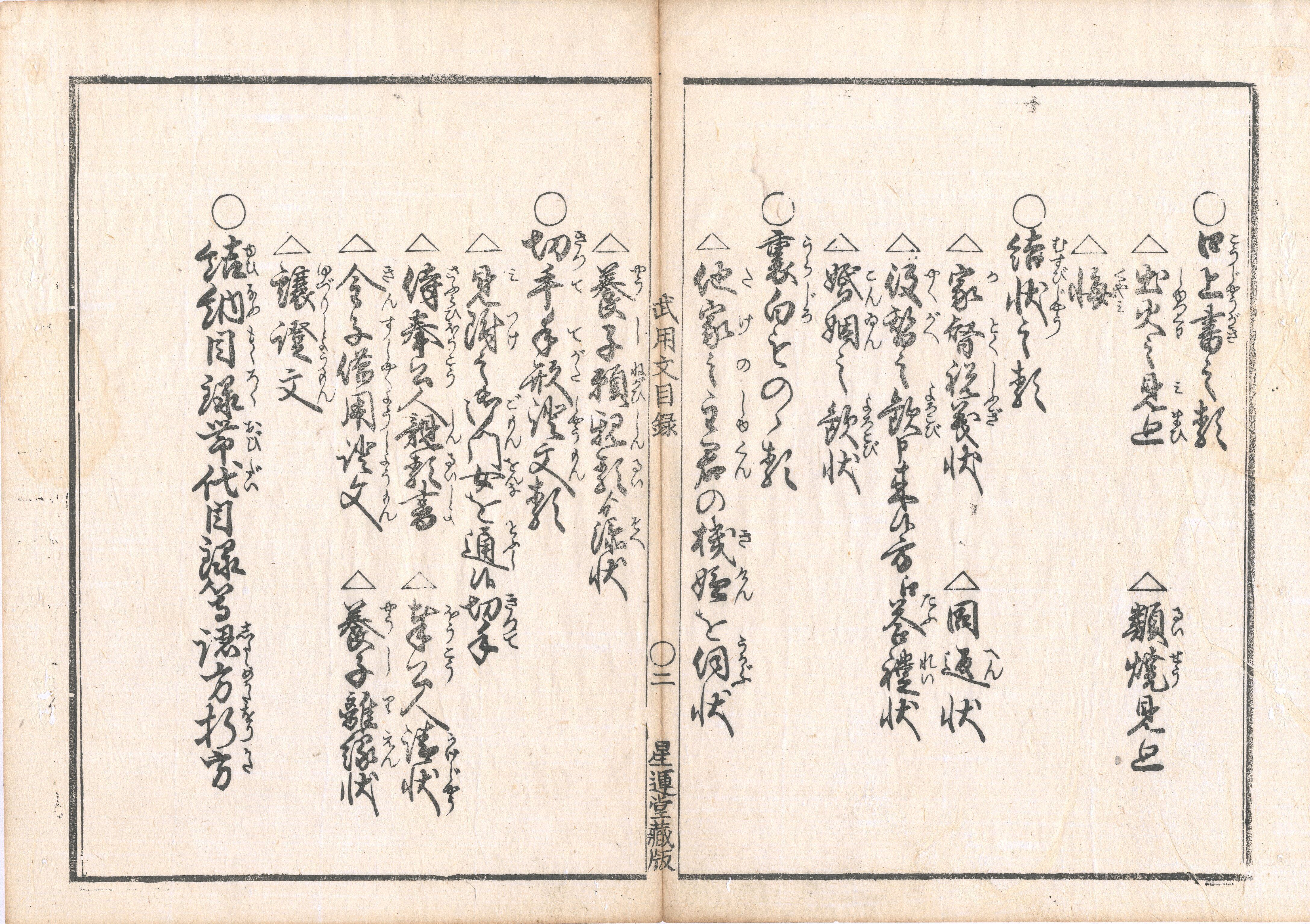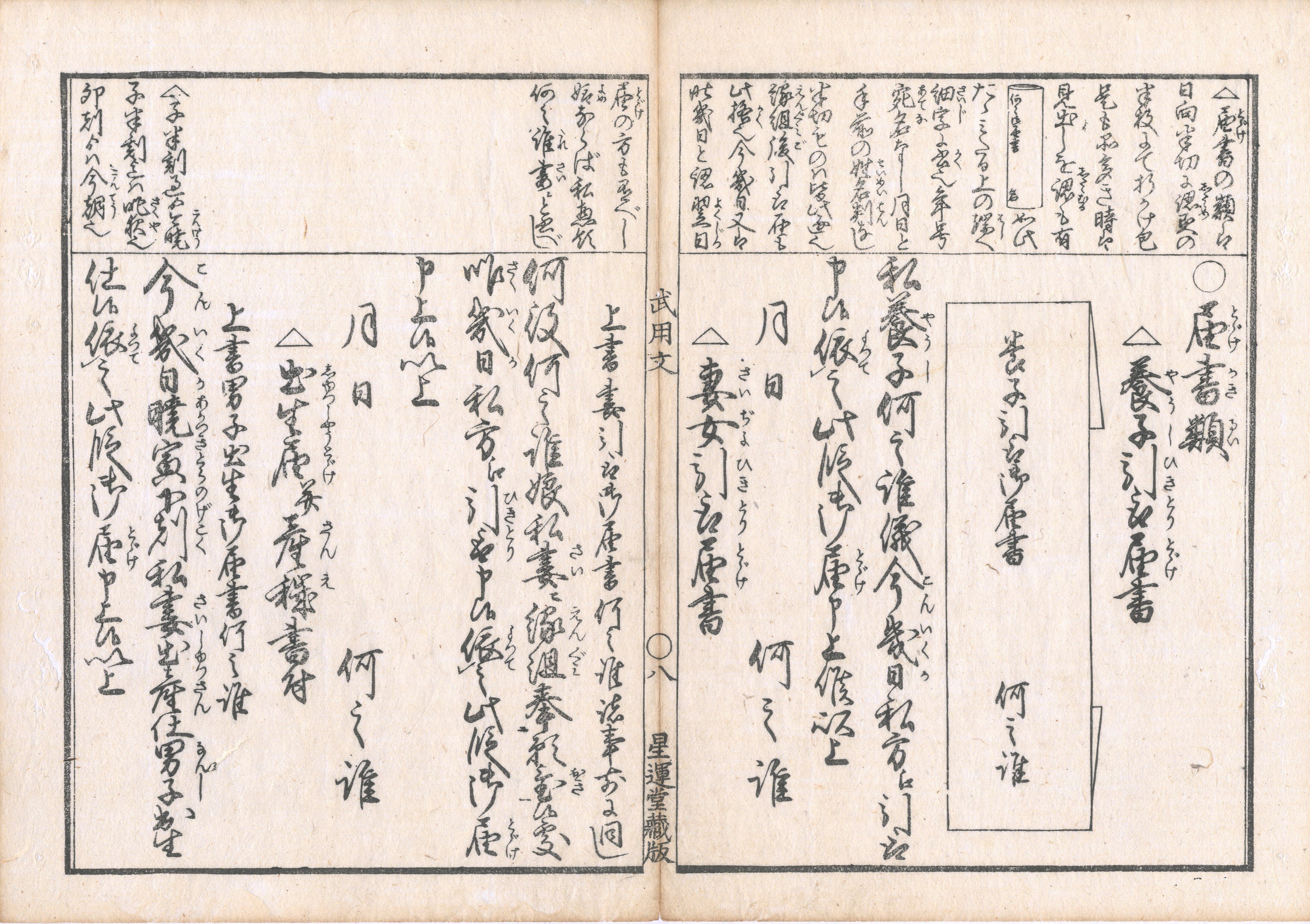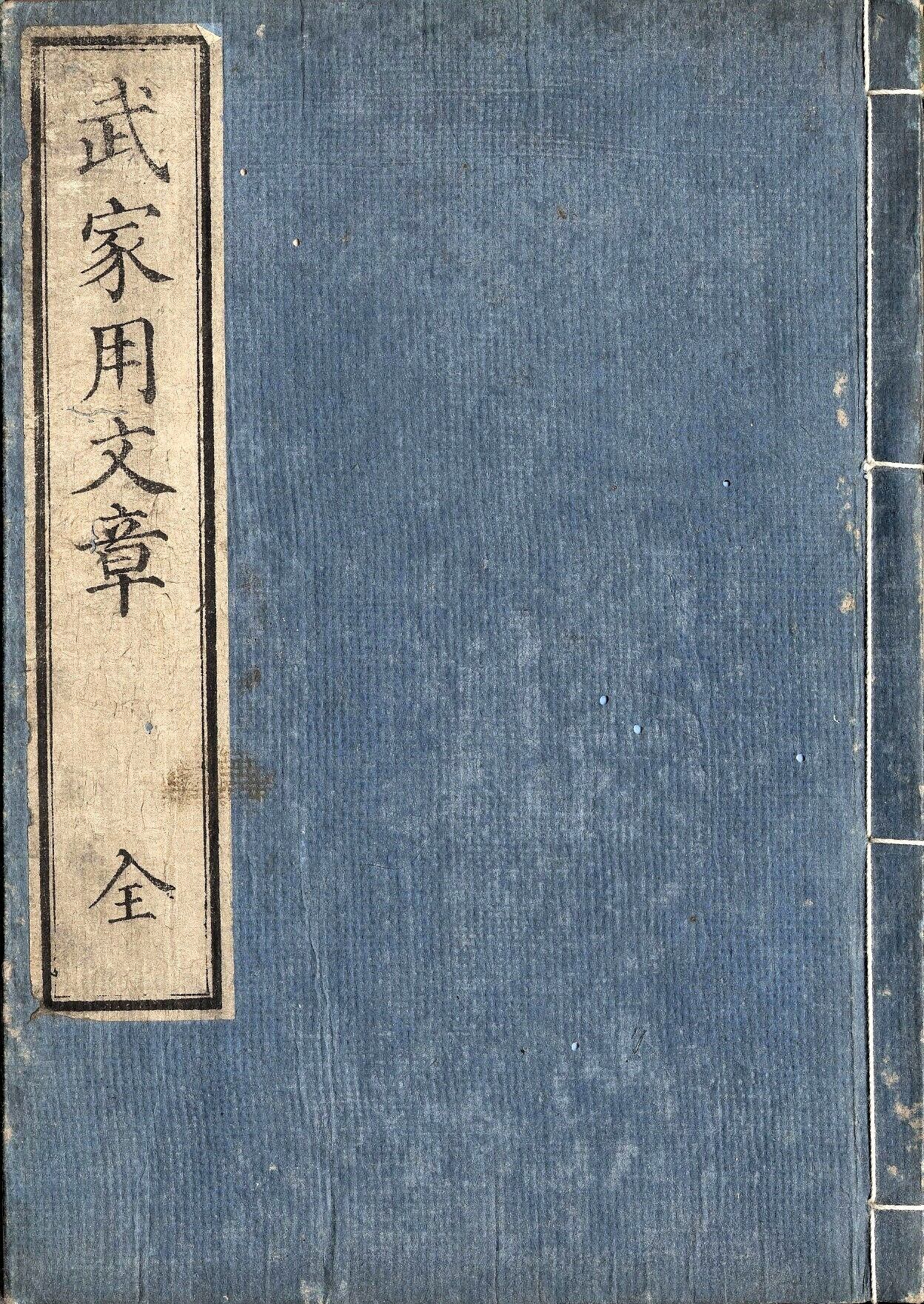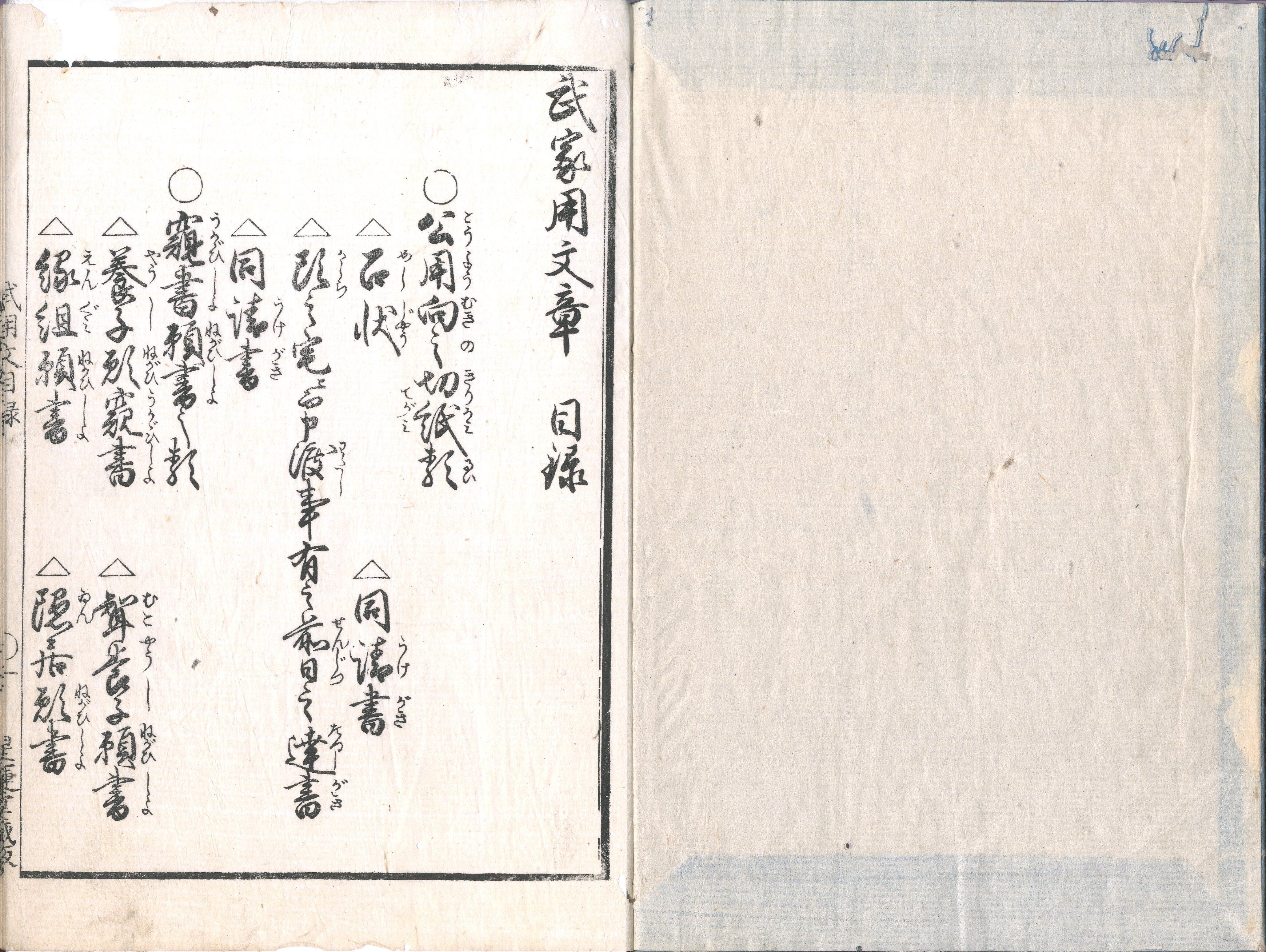 【備考】分類「往来物」。初板本および再刊本など4種を収録(初板本は袋綴じ展開収録)。『武家用文章』は、武家公私にわたる各種書状の書式と書簡作法を示した独特な用文章。「公用向之切紙類」4通、「窺書・願書之類」8通、「届書類」10通、「口上書之類」3通、「結状之類」4通、「裏白ものゝ類」2通、「切手・手形証文類」6通の合計37通、および「結納目録・帯代目録等認方・折方」を掲げる。随時、図解を交え、頭書に各諸状に関連する書簡作法を詳述する。