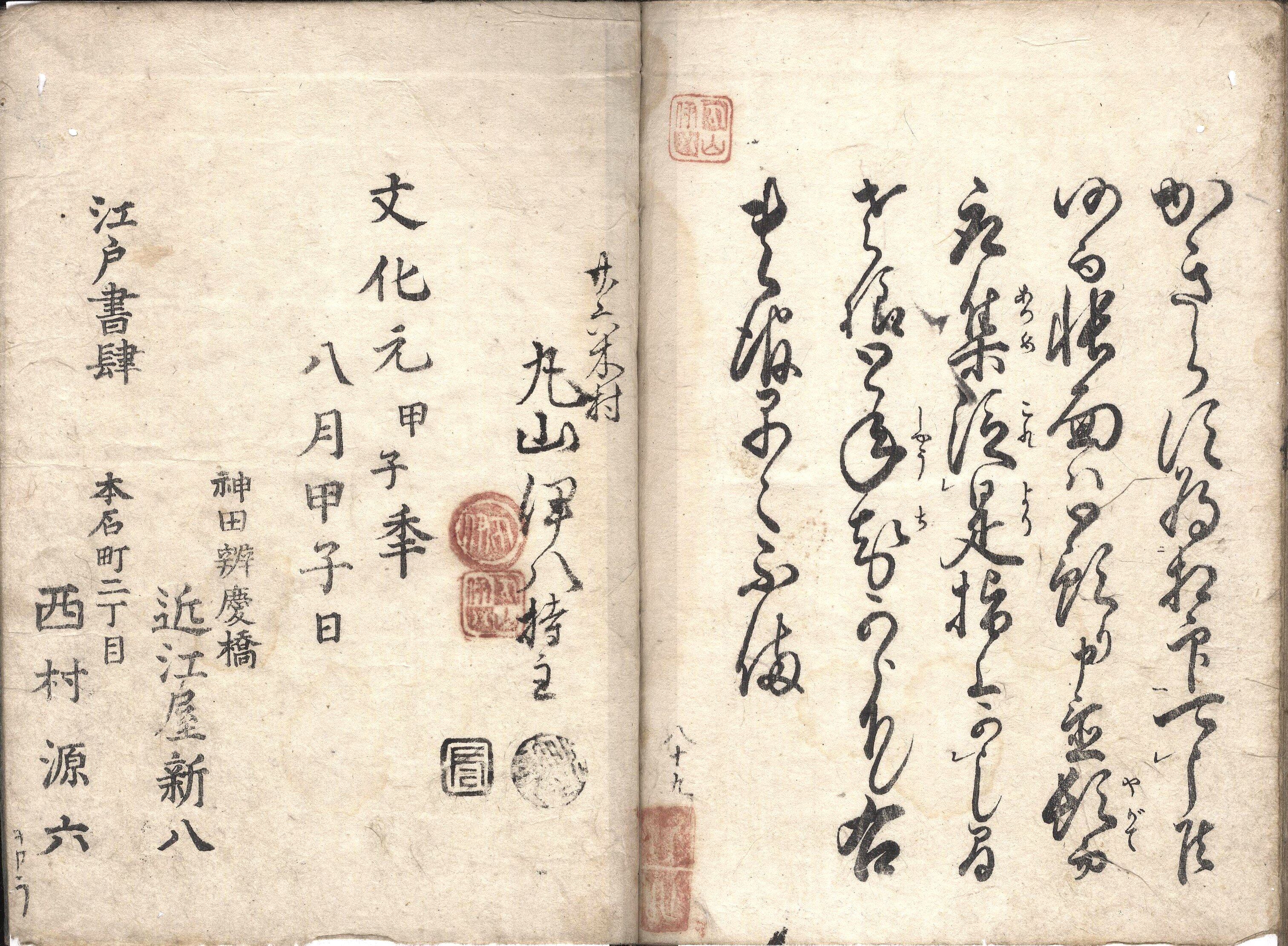 【判型】中本1冊。縦188粍。【作者】十返舎一九編か。月斎(月斎峨眉丸か)補。【年代等】文化元年8月刊。[江戸]西村源六ほか板。【備考】分類「往来物」。本書は極めて例文が豊富で、上記三者中収録書状数が最も多く、「年頭披露状」から「商売向御用承礼状」までの141通を収録する。通常の用文章に見られる例文や町人生活に伴う例文をほぼ網羅する。後半に「店請状」から「売上案文」までの24通の手形証文の例文と、手形証文の心得を述べた「書法大概」を載せるが、この後半部は文化13年に『証文手形案書極意集』の書名で単独板行された。