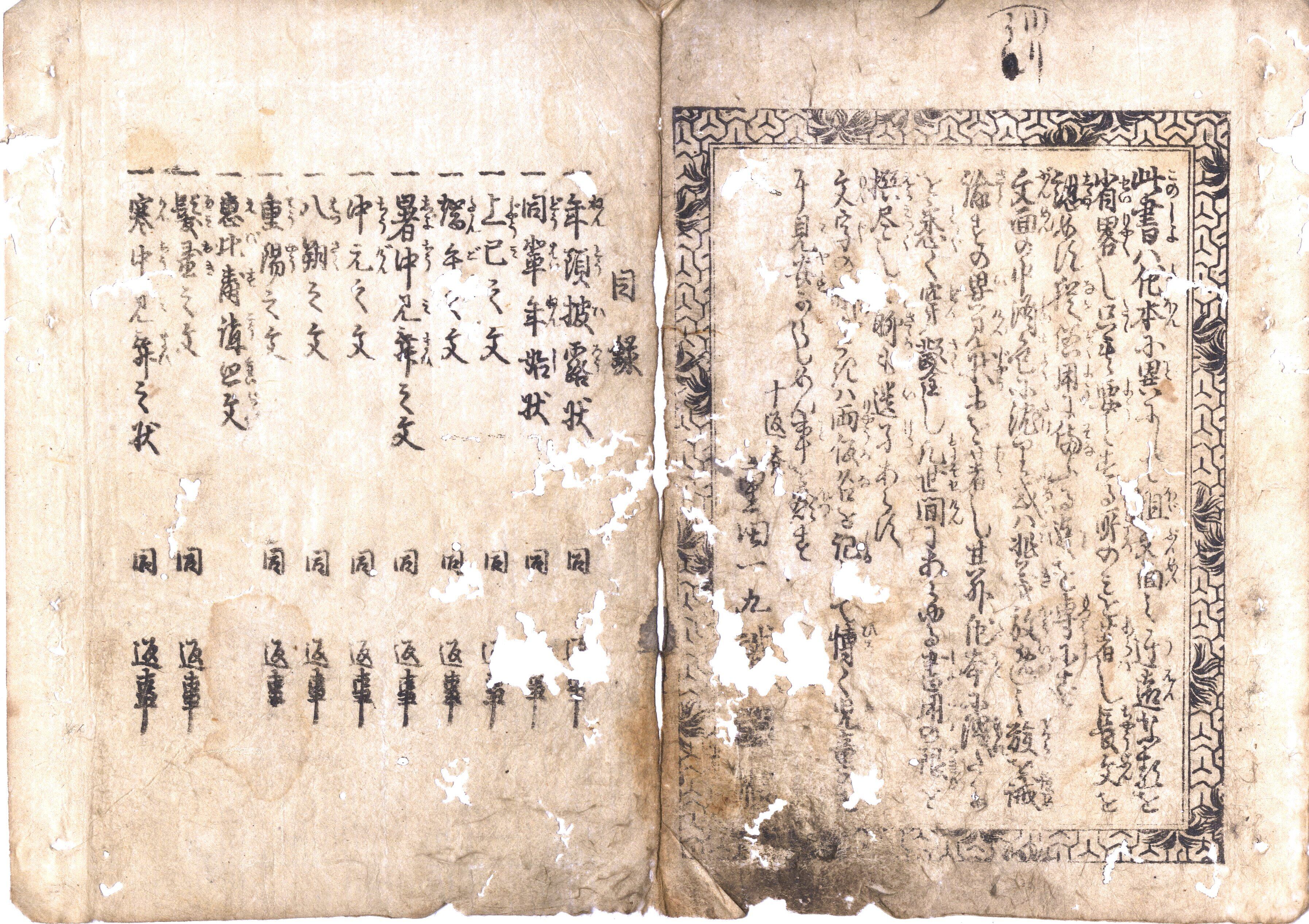 【備考】分類「往来物」。袋綴じ展開収録。原装の再板本も抄録した。『〈諸民通用〉手紙之文言』は、「年頭披露状」以下115通の消息文例(1通を除き全て往復の消息文例)から成る。俗用の短文が中心で、前半は四季・五節句祝儀状や通過儀礼に伴う手紙、後半は町人同志でやりとりする雑多な例文を満載する。貸借・病気・災害・商取引に関する例文や、中には「大酒に沈る人之遣す文」「倡家に沈る人之遣す文」など教訓色の濃い例文も含む。冒頭の23通が五節句や四季に伴う書状で、それに続く12通は出産・疱瘡・元服・養子・婚礼といった通過儀礼的な書状、その他は主として町家における吉凶事や諸事にまつわるもの。本文を大字・5行・所々付訓で記す。本書は享和2年3月発行、文化2年1月再板、文化13年7月三刻、文政7年8月四刻、天保3年7月五刻、文久2年7月六刻と何度も版を重ねたロングセラーで類書も多く、本書の全文を模倣した文化8年刊『〈万民平生〉手紙之案文』や、本書の前半部分を独立させた天保6年刊『〈万民平生〉一筆案文』、弘化2年刊『即席案文』等がある。
