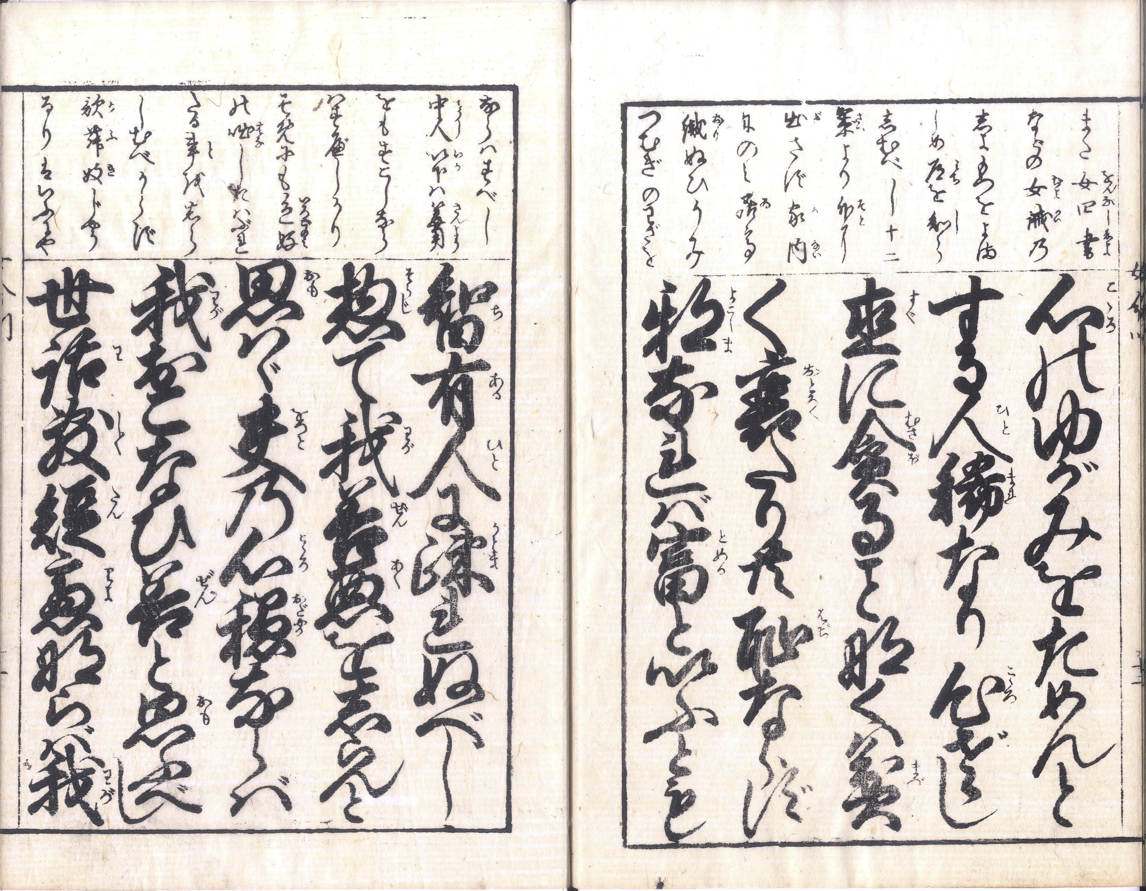 【備考】分類「往来物」。題簽違い本も抄録。沢田吉作『女今川(元禄13年板系統)』の一つ。元禄13年板系統の始祖・貞享4年刊『女今川』の改編版で、各条々は貞享板とほぼ同傾向だが、後文については改編の跡が著しく、具体的には「心かだまし」と「心すなほ」の強調が目立つ。また、第5条では「主・親の深き恩」を「父母の深き恩」と言い換え、「忠孝」の代わりに「孝の道」とした点、さらに後文で、天地の道や五常を説いた抽象的な表現や、下僕や他人に対する心得などを割愛する一方、孝・貞の見地から己の心の善悪を内省することを説いた点に特色がある。本文を概ね大字・4行・付訓で記す(後文は一部散らし書き)。なお、元禄板の改刻板に『〈新板〉新女今川』と『女今川〈教訓書〉』の2種あるが、いずれも挿絵と刊記を削除して1冊に合本した異板である(このうち前者は、元禄当初からの題簽題が『新女今川』であったことを物語る)。元禄板系統の『女今川』も、元文2年刊『女今川錦の子宝』を始め種々刊行された。