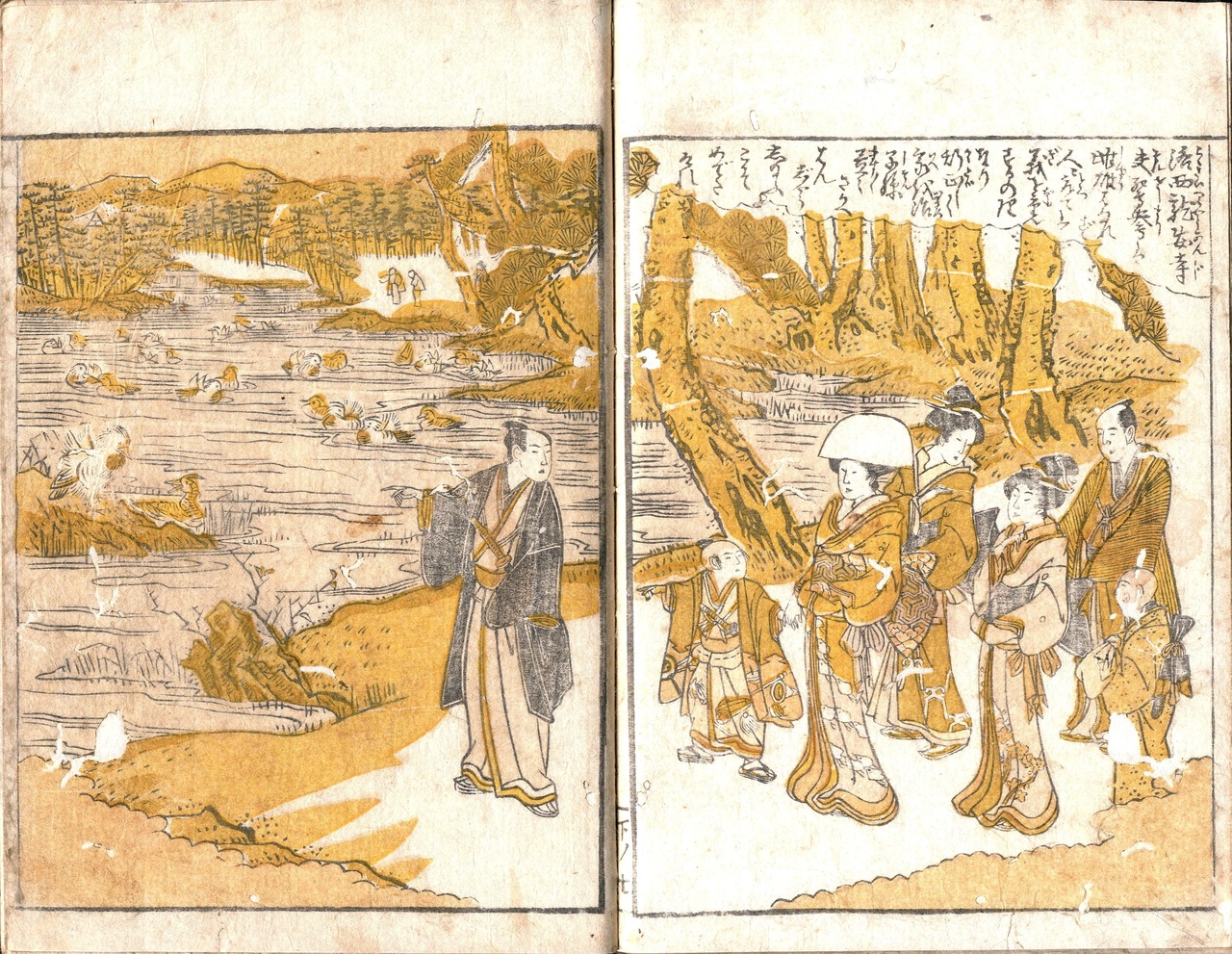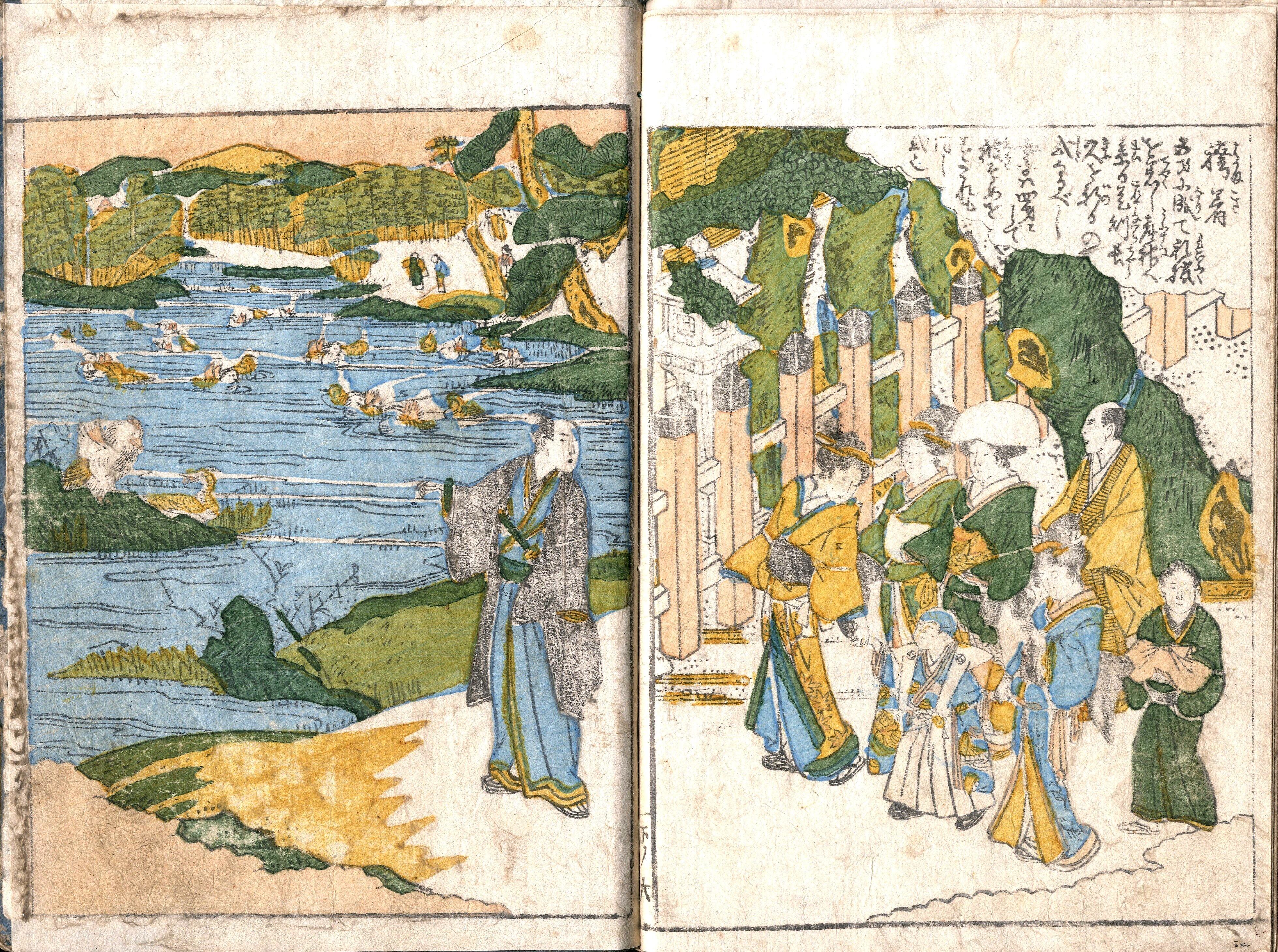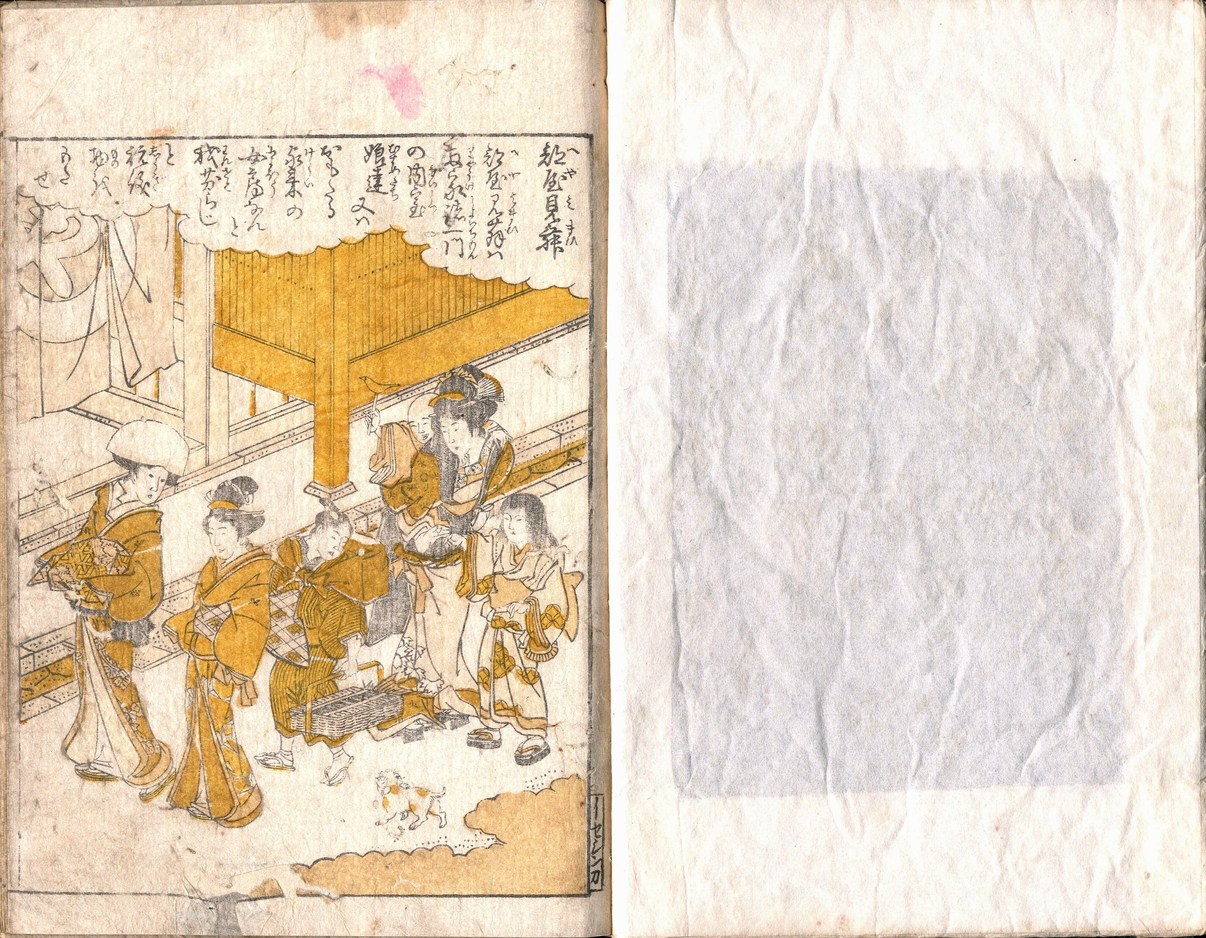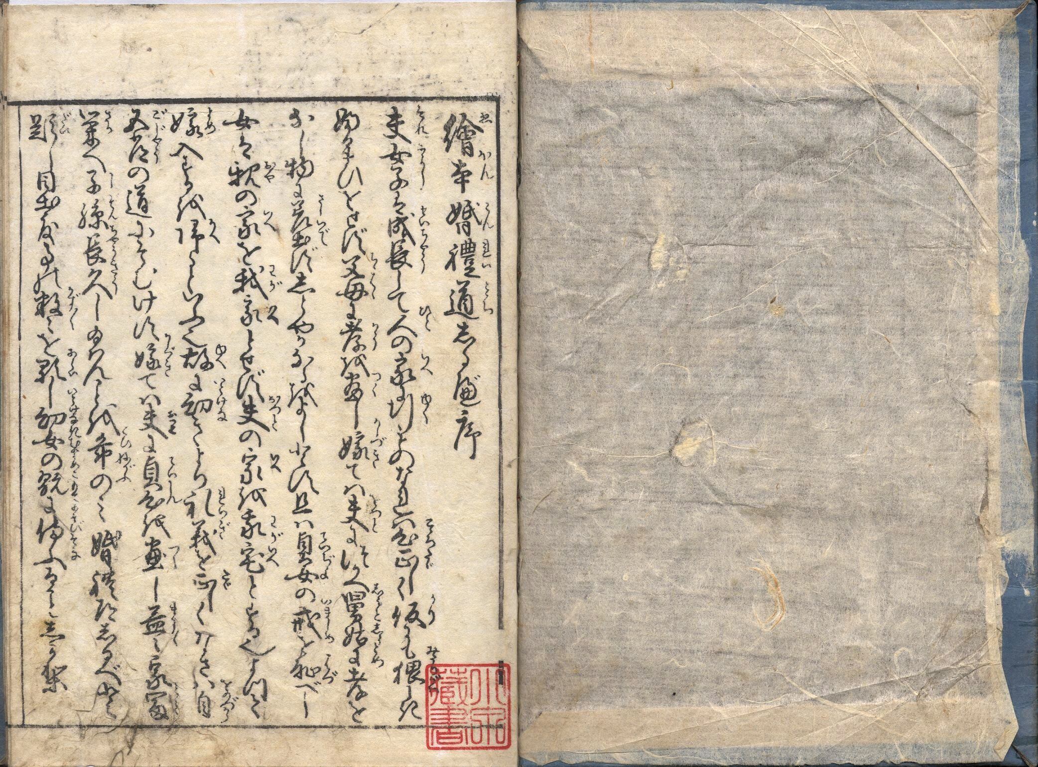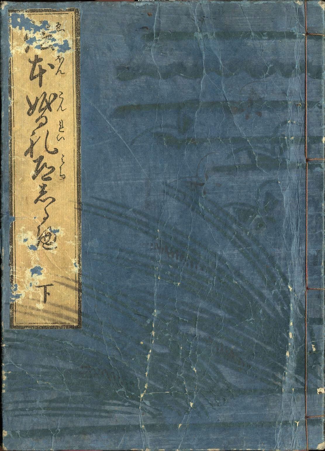 【備考】分類「往来物」。2冊揃い本のほか、カッパ刷りの下巻端本2種(いずれも上巻欠)を収録した。「幼女 (いとけなきむすめ)の翫(もてあそび)」に備えて、婚礼の概要を図解した絵本。上巻に、「見合」「結納の式」「嫁入道具」「嫁入之式」「祝言献立」「祝言の座敷」「色直し」「部屋入の盃」の八題、下巻に「部屋見舞」「聟入」「東福寺通天(紅葉狩)」「若子(わこ)出産」「宮参り」「袴着」「洛西竜安寺(鴛鴦)」の七題を見開き挿絵(一部半丁)で紹介する。それぞれの挿絵には、例えば「見あひのことは一生を極(きわむ)ることなれば、たがひにとくと見合すべし。容色(きりょう)よきとて、つんとすべからず。女は礼儀正しく、やさしきこそよかるべし」のように、教訓的な詞書(ことばがき)を添える。表紙には手彩色で草花や蝶などが描かれている。なお、本書には本文が色刷(合羽刷)りのものもある。堀田連山は、生没年未詳で、江戸時代後期の人。名、行長。通称、新兵・新平。号、連山。里席とも号したか。京都の人で、合羽刷木版の浮世絵の作や絵本の作者として活躍した。
