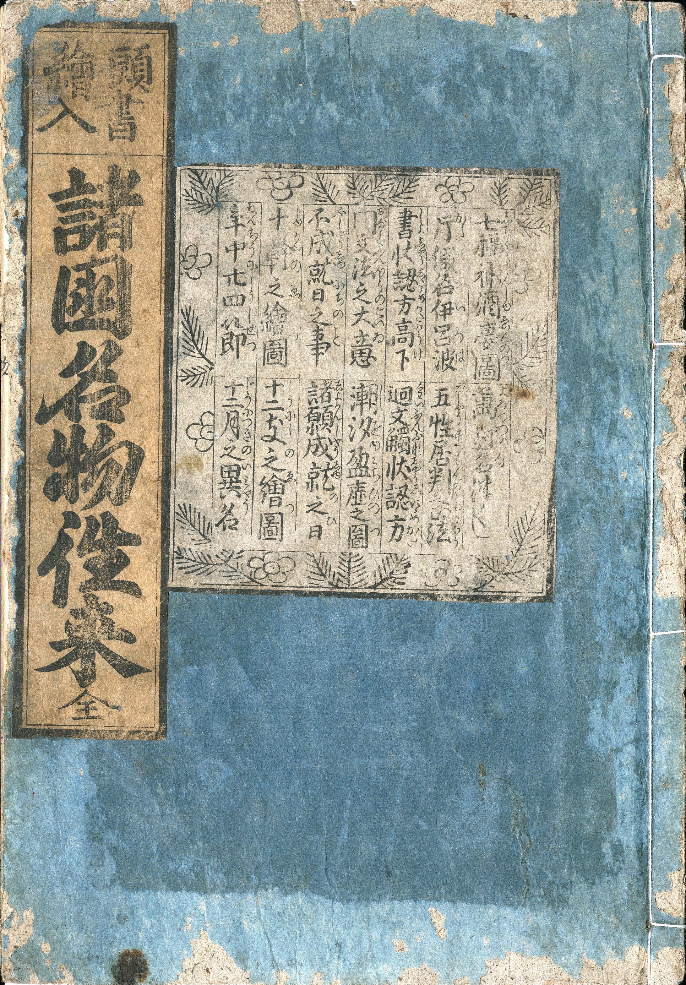 【備考】分類「往来物」。安永7年板は大本1冊。「凡、諸国名物者、先於洛陽西陣綾織…」で始まり「…都而唐土・天竺・高麗・南蛮・阿蘭陀・新羅・百済七珍万宝一而無不足、猶期後慶之時節候。恐惶謹言」と結ぶ全1通の書状形式で、全国の名産品を列挙した往来。同本文を大字・7行・付訓で記す。頭書に「万対名(ついな)づくし」「片仮名伊呂波本字」「居判正法」「書状高下認様」「廻文・触状認様」「書状書初高下」「潮時」「不成就日・願成就日」「十幹之図・十二支之図」、巻末に「廿四節」「十二月之異名」を掲げる。本書以後、『名物往来』『名物往来文宝蔵』等の書名で数種出版されており、本文だけの版本のほか、「日本名所大概」等の頭書を伴う版本など数種ある。安永7年板は現存最古だが、題簽角書に「新版」の二字を加える点では、さらに年代の早い版本が存在した可能性もある。