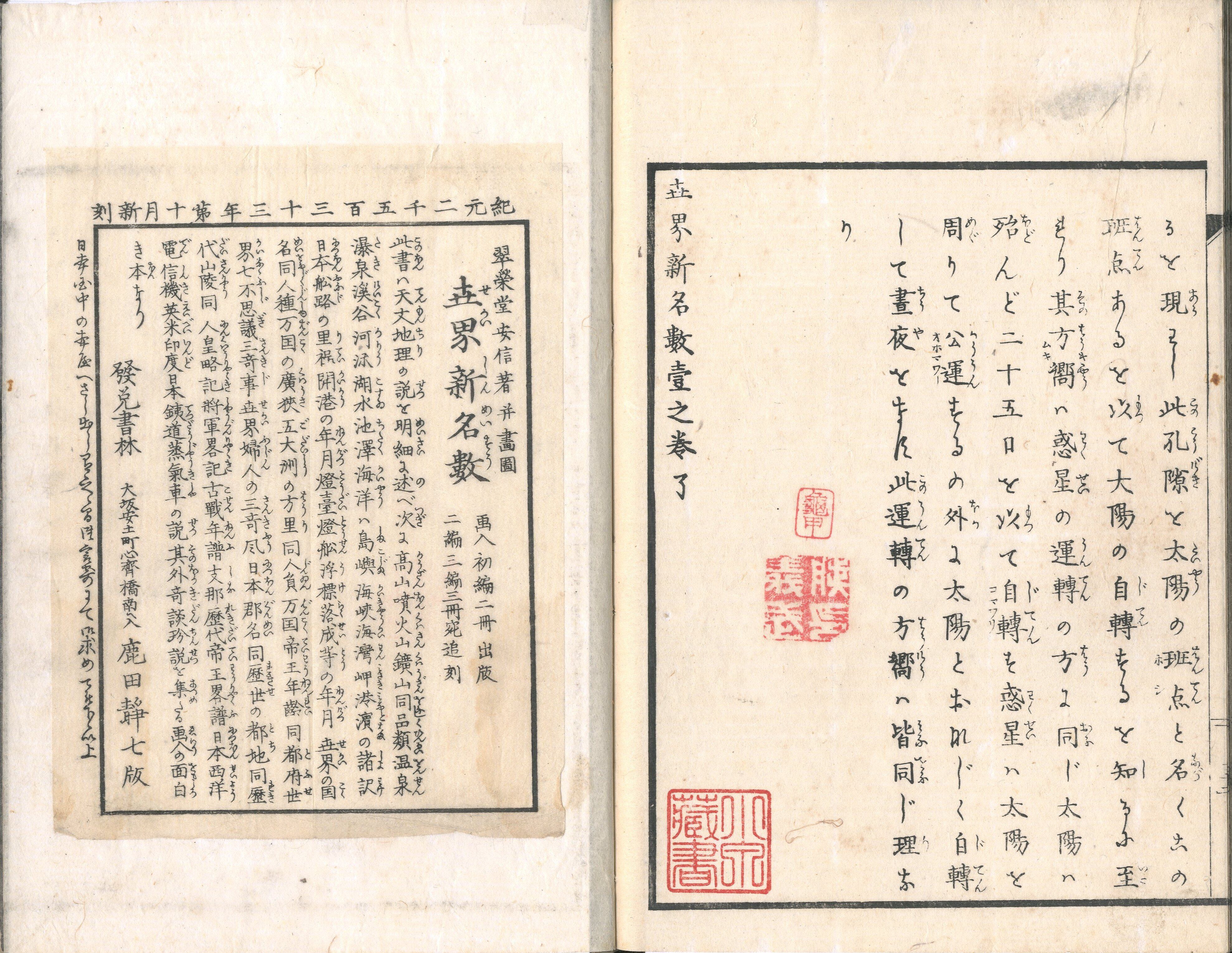 【備考】分類「往来物」。2編は同板別本も抄録した。本書は、地理科・歴史科・理数科にまたがる明治期の往来物・教科書。半紙本2編4巻4冊。ちなみに目録によれば、1巻は「天文略説」「太陽并自転・公転之説」「月之行動并盈虚之図解」、その他天体・気候等に関する諸説、2巻は「地理之説」「地球之周囲」「地球之表面」「海面之広サ」「世界三大地」「六大洲」「五大洋」「世界人種区別」「地球表面之形状」「世界総国名」「大日本郡名」「日本歴世都地」「日本海岸燈明台并初点年月」「日本貿易開港年月次第」「万国都府」「日本大橋」など世界・日本の地理・名数その他の記事、3巻は「歴代山陵之地」「西洋電信機之説」「米国鉄道并火輪車之説」「英国火輪車総計」「日本東京之鉄道」「北京万里長城」「世界万国広狭」「地震之説」等、4巻は「世界万国名山」「世界万国之大河」「世界万国之湖水」「西洋之鑛山」「西洋之諸島」「日本之諸島」「日本船路里程」「西洋海底浅深」「日本諸国温泉」等の記事を収録する。以上のように、当時の窮理学を始め地理・歴史にわたる雑多な記事を収録するのが特徴。
