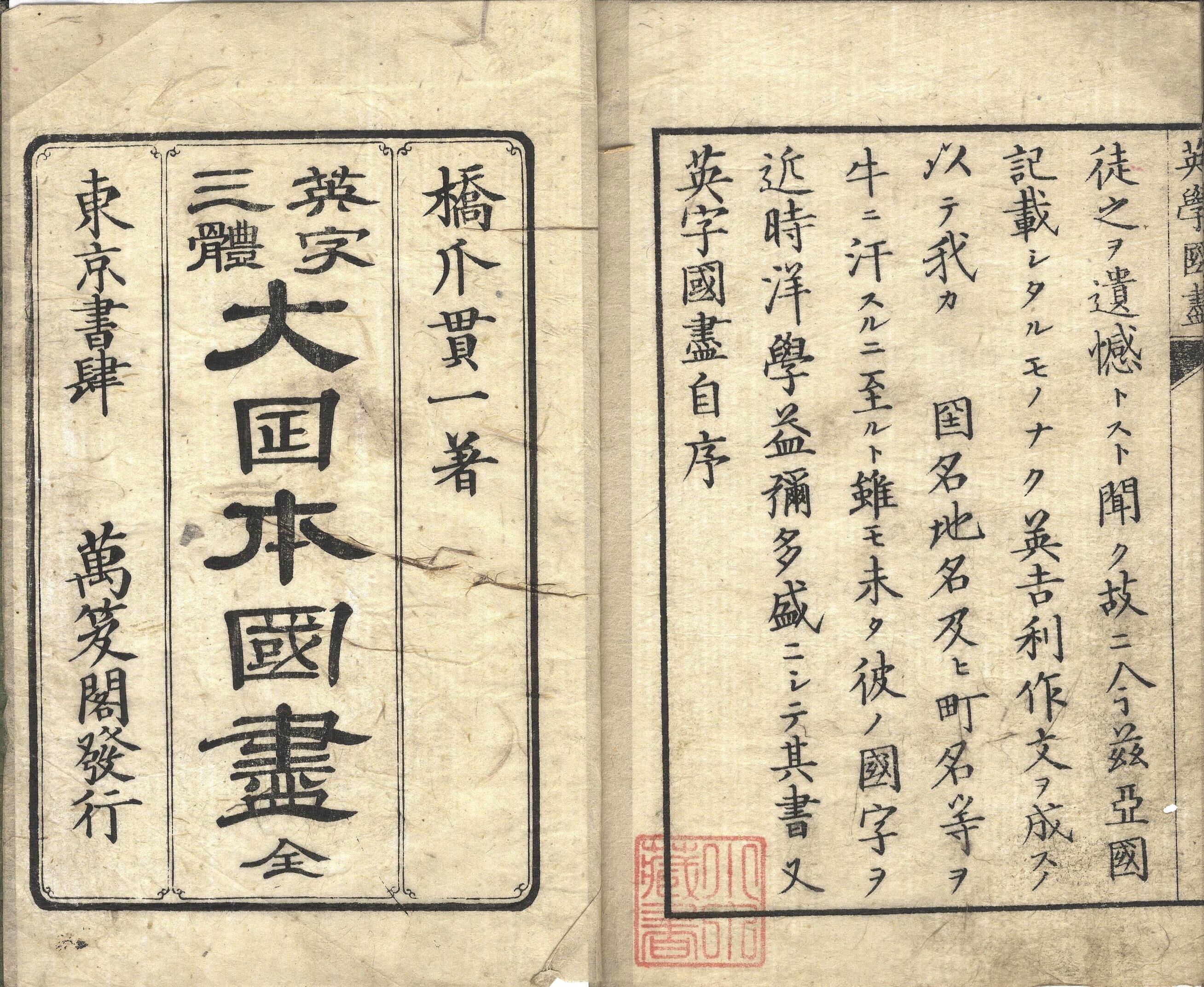 【判型】中本1冊。縦約182粍。【作者】橋爪貫一(松園)作。【年代等】明治4年6月序・刊。[東京]椀屋喜兵衛(万笈閣)板。【備考】分類「往来物」。 同板別本も抄録。「日本国尽」「十干十二支」「四方」をそれぞれ英字3体(ローマン体大文字・小文字、イタリック体小文字)で表記した往来。左開きの造りで、各頁を左右2列に分けて、最上段に漢字表記、その下に続けて3体の英語表記を3段で掲げる。なお「日本国尽」は、五畿八道・二島・八丈島・小笠原島・琉球までの国名・地名等を列記する。