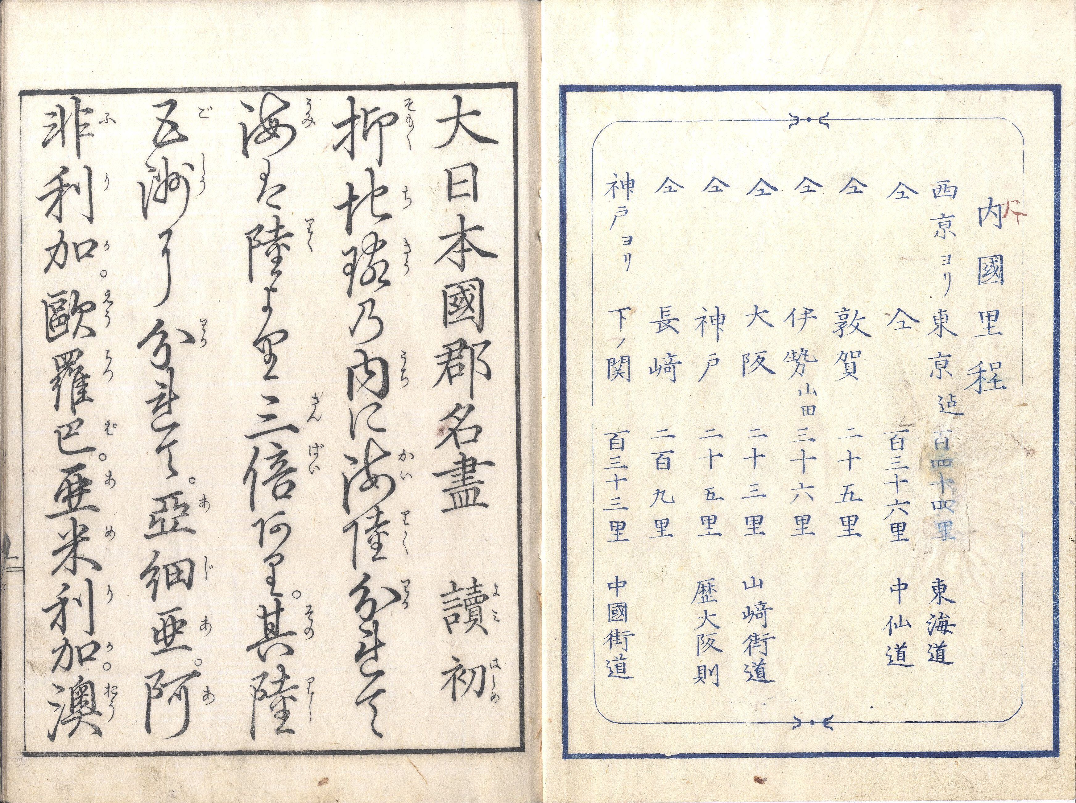 【備考】分類「往来物」。同板別本も抄録した。巻頭「内国里程」のうち冒頭2行の距離が木版刷りの付箋によって修正されているが、別本とは逆になっている。本書は、「抑、地球の内に海陸分れて、海は陸より三倍あり。其陸五洲に分れて、亜細亜・亜非利加・欧羅巴・亜米利加・澳太利、是を五大洲と名付たり…」と起筆して、日本の古名、神代からの年号、日本の地理的位置、日本の国土の形状や規模、国内の郡数などに触れた後で、五畿七道別に国名および郡名を列挙した往来物。地名には多く左訓を施し、所々に割注を付す。