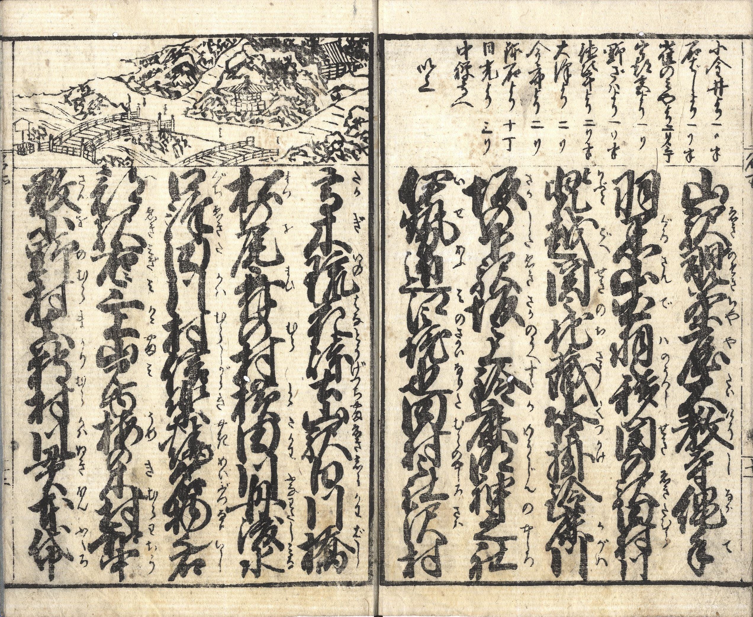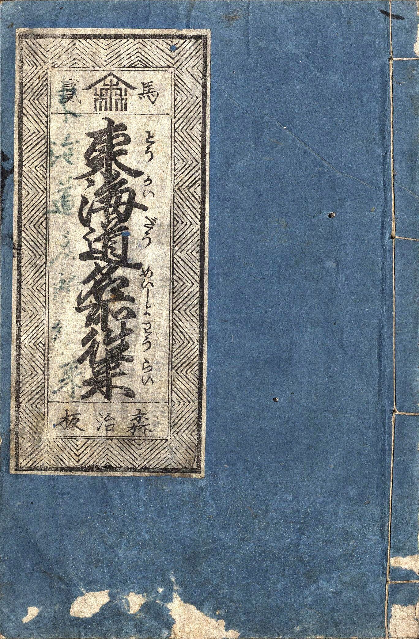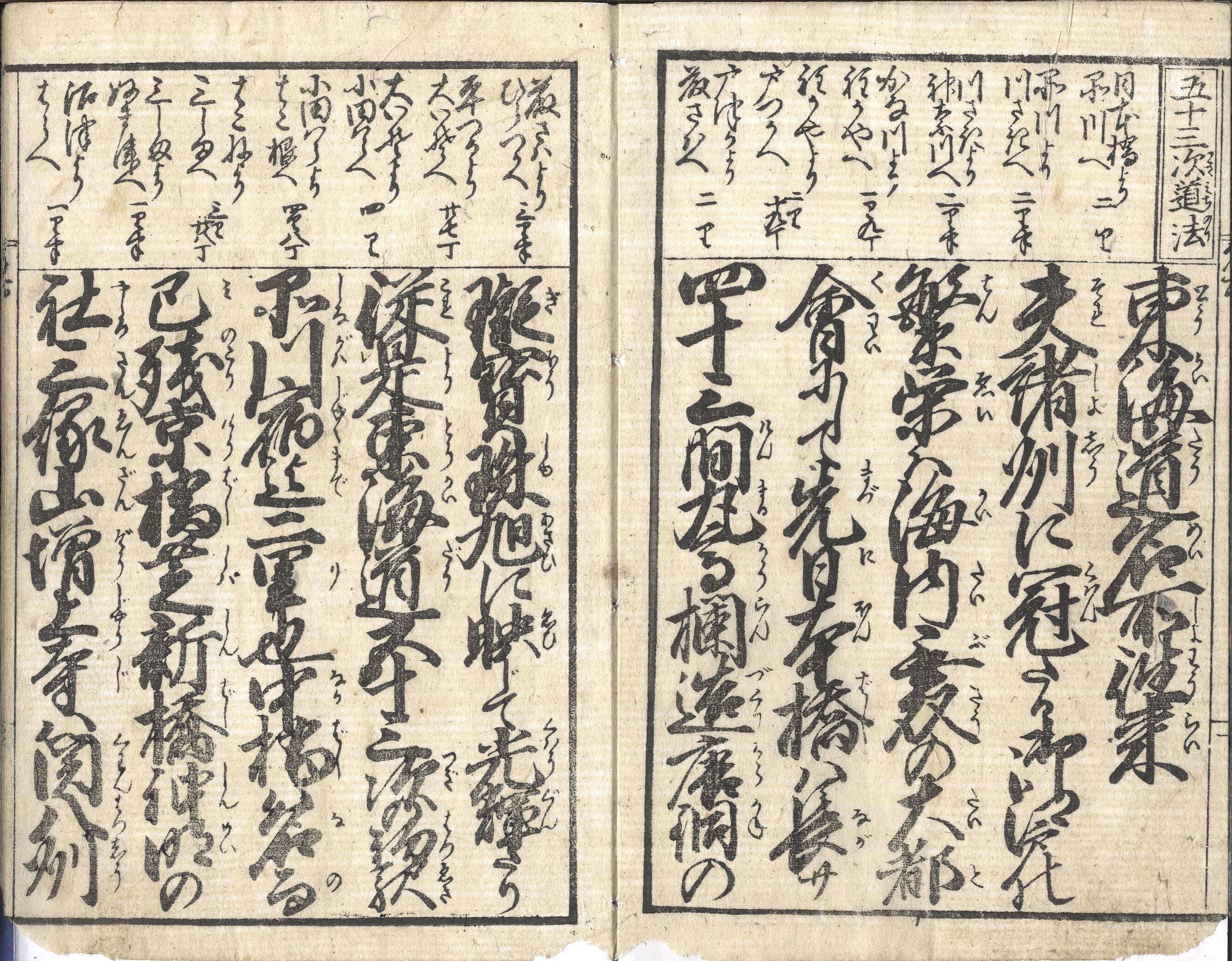 【備考】分類「往来物」。題簽違いなど同板3種を収録。江戸・品川から京都・近江八景までの東海道の各宿駅名・里程、また沿道の名所を列記した往来。「夫、諸州に冠たる御江戸の繁栄は、海内無双の大都会にして、先、日本橋は長さ四十三間、丸高欄造、唐銅の…」で始まる文章を大字・5行・付訓で綴る。頭書に「五十三次道法(みちのり)」「凡江戸より京迄道法」「通行手形書式」、その他、「吉野奈良道」「日光道中記」など各地道法を載せ、巻頭に「大江戸日本橋繁栄之図」を掲げる。