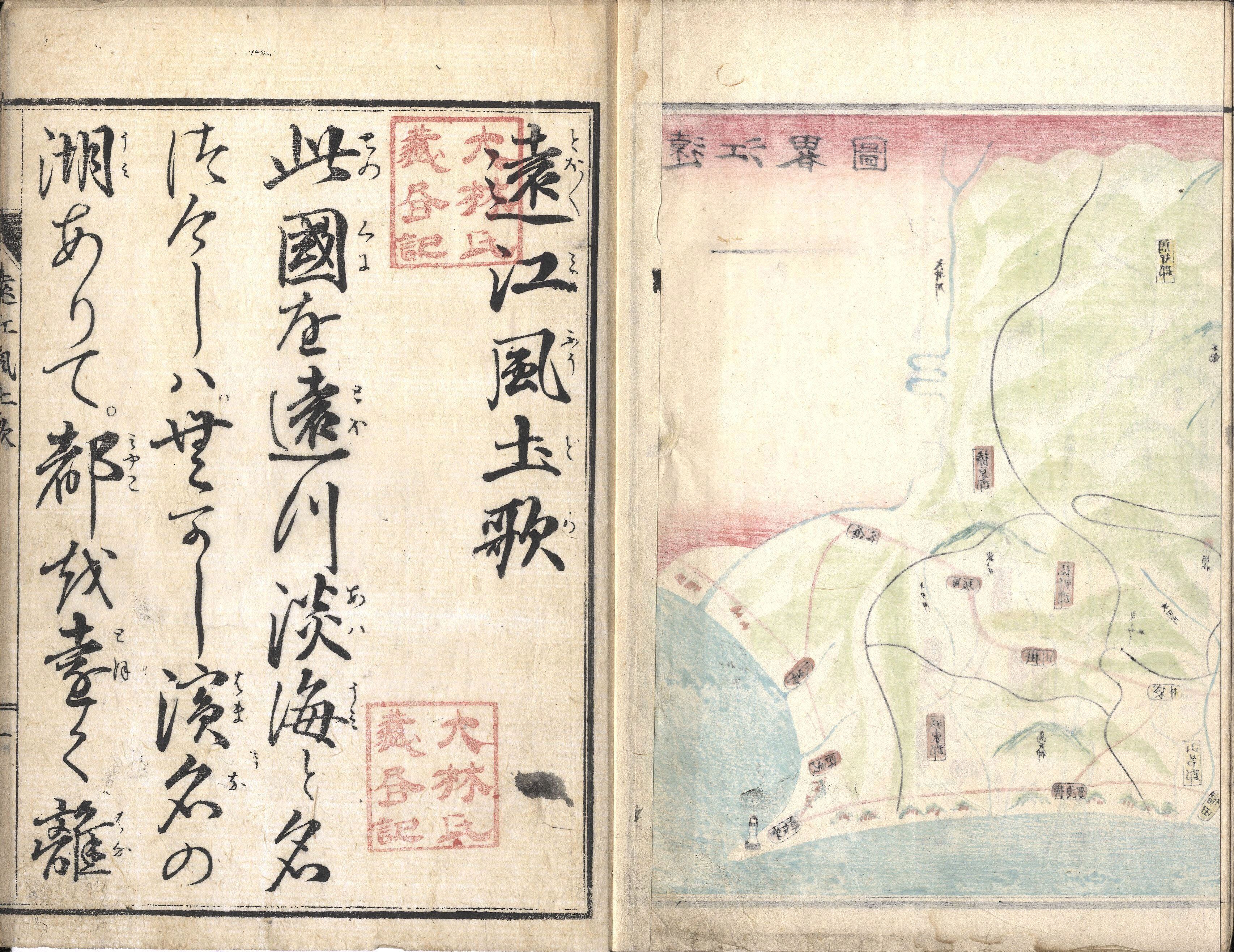 【備考】分類「往来物」。冒頭に書袋、末尾に別本の一部を収録。遠江国(静岡県西半郡)の地理を七五調・美文体で記した往来。「此国を遠つ淡海と名つけしは、むかし浜名の湖(うみ)ありて、都を遠く離るれは、よりて号(なず)けしものとなん、北の境は信濃なる…」と書き始め、まず、遠江国の国号の由来、地理的位置、地勢、行政区画、気候・風土、山・川や地勢、郵便・電信の普及状況などの概要に触れ、以下、浜松県下各地の地理・行政・法令・諸施設・産業・寺社・名所・名物・人民・風俗などのあらましを紹介する。本文を大字・五行・付訓で記す。巻頭に「遠江略図」(色刷り地図)、本文中に「浜名湖図」「井伊谷宮図」「浜松小学校図」の色刷り挿絵を掲げる。なお、本書は旧浜松県岡崎・立志社同盟(三者)によって出版されたものである。