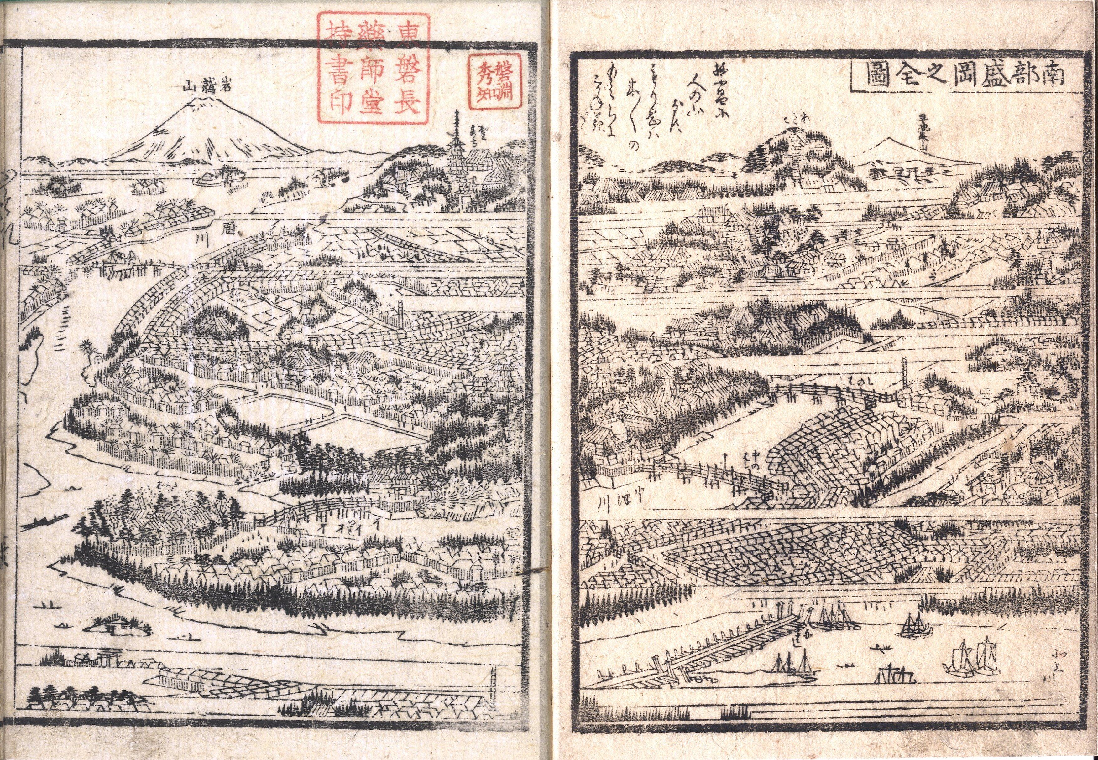 【備考】分類「往来物」。同板2種を全冊収録。『南部於曽礼山詣』は、「霞立春の朝、窓の梅に鴬の囀を聞、野辺に萌える百草の時知顔なるも面白し…」と筆を起こし、仙台から南部於曽礼山(恐山)までの参詣路に沿って各地の春の風景や名山・名所旧跡を紹介した往来。仙台相去、和賀川、花巻、国見山、岩鷲山、早池峯山、郡山駅、来神川(北上川)、盛岡城下(神社仏閣)、厨川、安倍社、末松山、野田玉川、壺の碑に続いて、恐山の沿革・本尊・境内の様子、また周囲の名所・温泉など一通りを記す。風趣や物産、風俗、寺社縁起・祭礼、その他故事等にも触れる。本文を大字・6行・付訓で記す。巻頭に「南部盛岡之全図」と本文中に「南部宇曽利山円通寺境内之図」を掲げる(いずれも鳥瞰図)ほか、頭書に各地の風景画と「仙台城下より南部於曽礼山」まで道法并松前海上里数、名所旧跡紀」を掲げる。