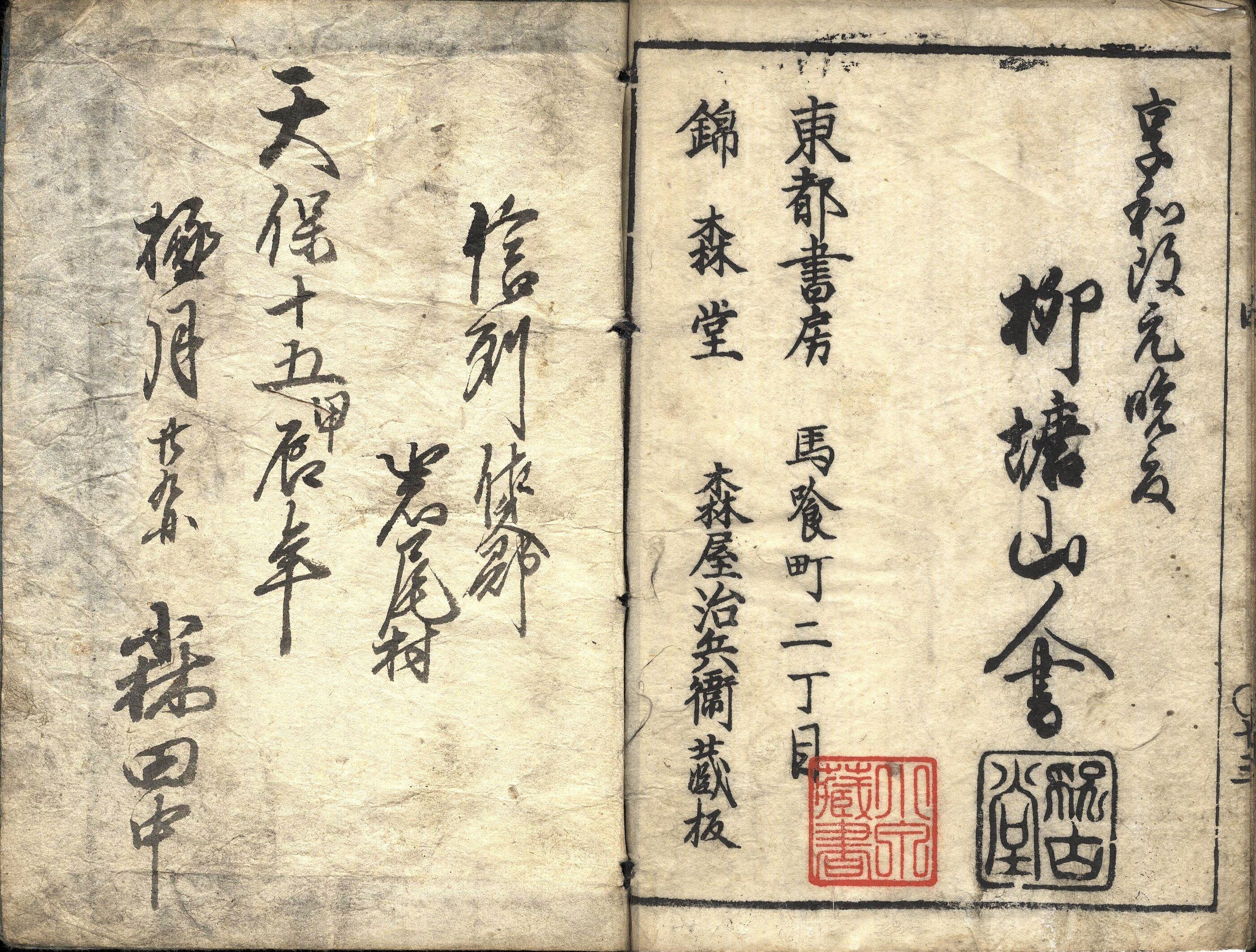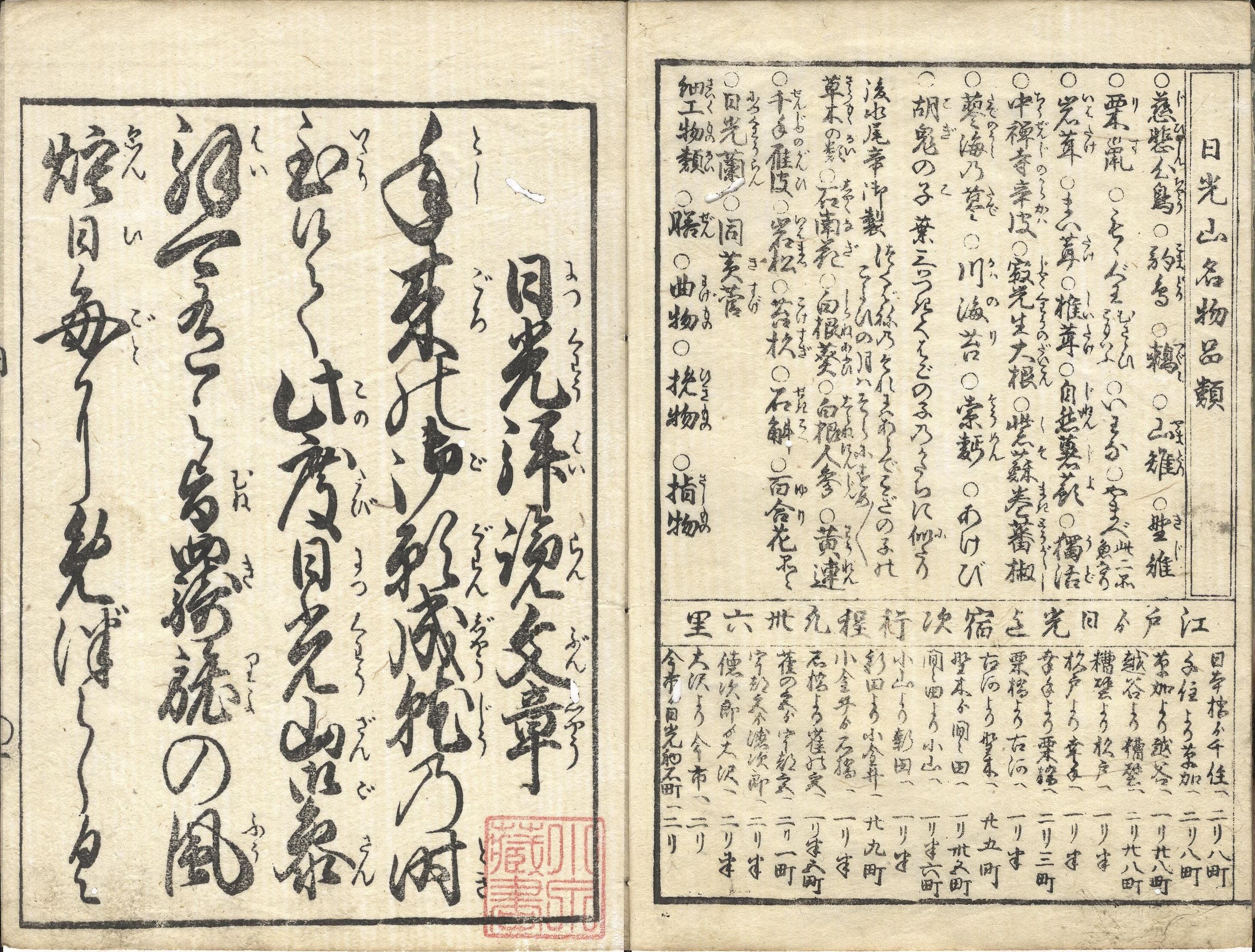 【備考】分類「往来物」。初板本の花屋板と後印本の森屋治兵衛板の2種を全冊収録した。「年来の御願成就の時至候て、此度、日光山御参拝可有之旨…」で始まる一通の手紙文で、日光参詣途上の名所や日光東照宮の景観・縁起等を紹介した往来。まず千住・草加・越谷から宇都宮・今市・日光までの順路を示し、続いて日光山の縁起・由来、周辺の名所や風景、山内の結構や眺望、壮麗な建造物の様子、中禅寺湖・華厳の滝、その他の勝景・霊地の数々を記す。本文を大字・五行・付訓で記す。巻頭に「日光強飯(ごうはん)之図」「日光山名物品類」「江戸より日光迄宿次行程凡三十六里」を掲げる。