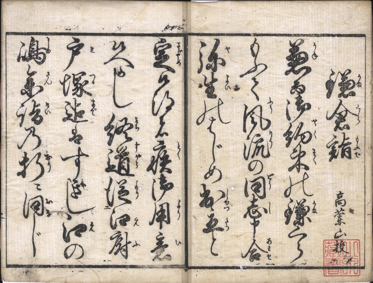 【判型】中本1冊。縦約180粍。【作者】蓮池堂作・書。高井蘭山校。【年代等】文化7年初刊。文政6年再刊。[江戸]鶴屋喜右衛門板。【備考】分類「往来物」。後半に文化7年・花屋板も全冊収録。「兼而御約束の鎌くらもふて、風流の同志申合、弥生のはじめ出立と定候得者、疾御用意候へかし…」で始まり「…万々期其節候。頓首」と結ぶ全1通の手紙文の形式で、鎌倉から金沢八景周辺の寺社や名所旧跡の風趣・縁起等を略述した往来。戸塚までの参詣路は省略し、ただちに鎌倉の竜口寺・満福寺・七里ヶ浜・稲村ヶ崎・光則寺・甘縄明神・尊氏屋敷跡・鶴ヶ岡八幡宮・寿福寺以下、多くの古跡・名勝を順々に列記する。文化板・文政板の巻頭に「鶴岡八幡宮結構図」と由来書きを付すが、無刊年本では削除された。