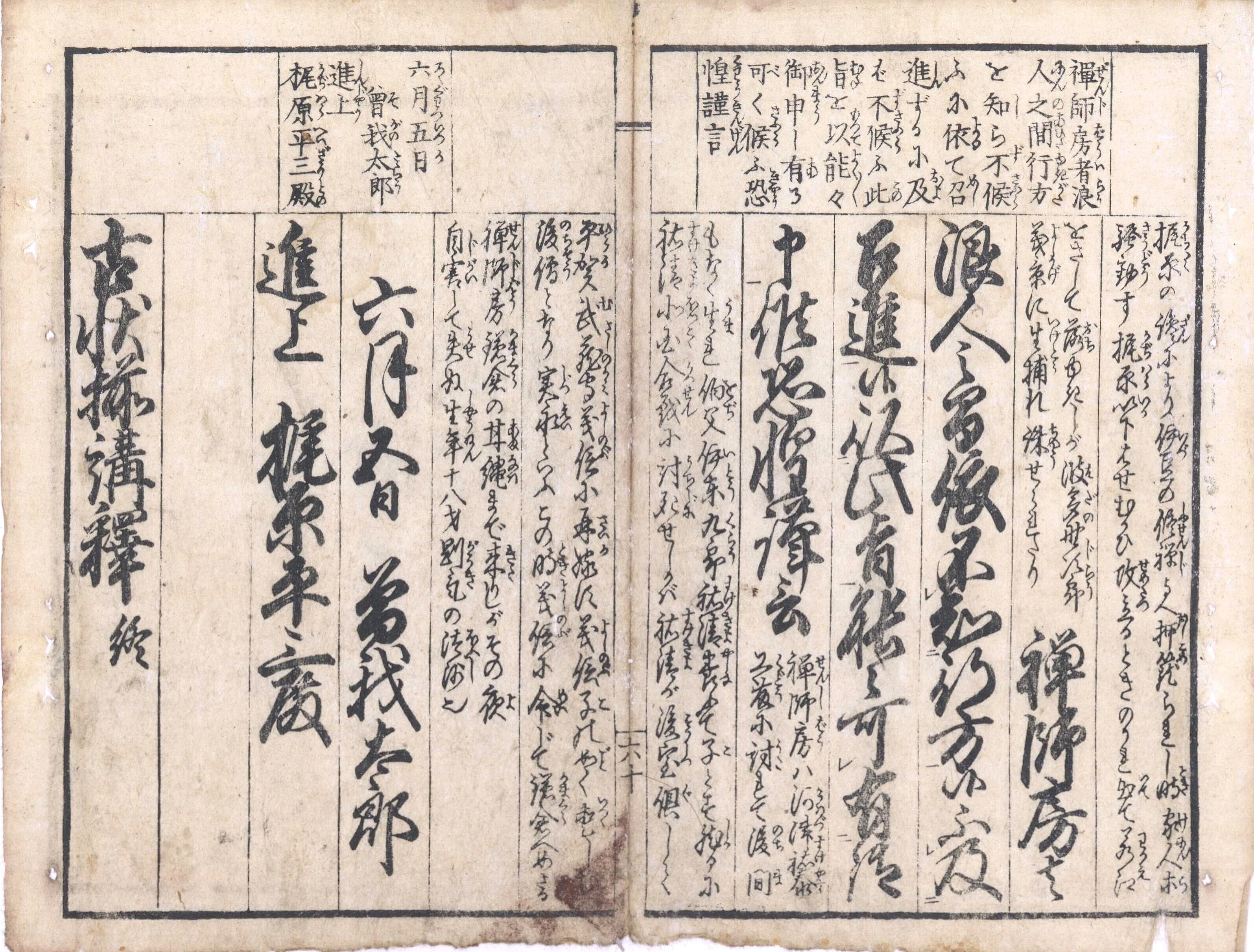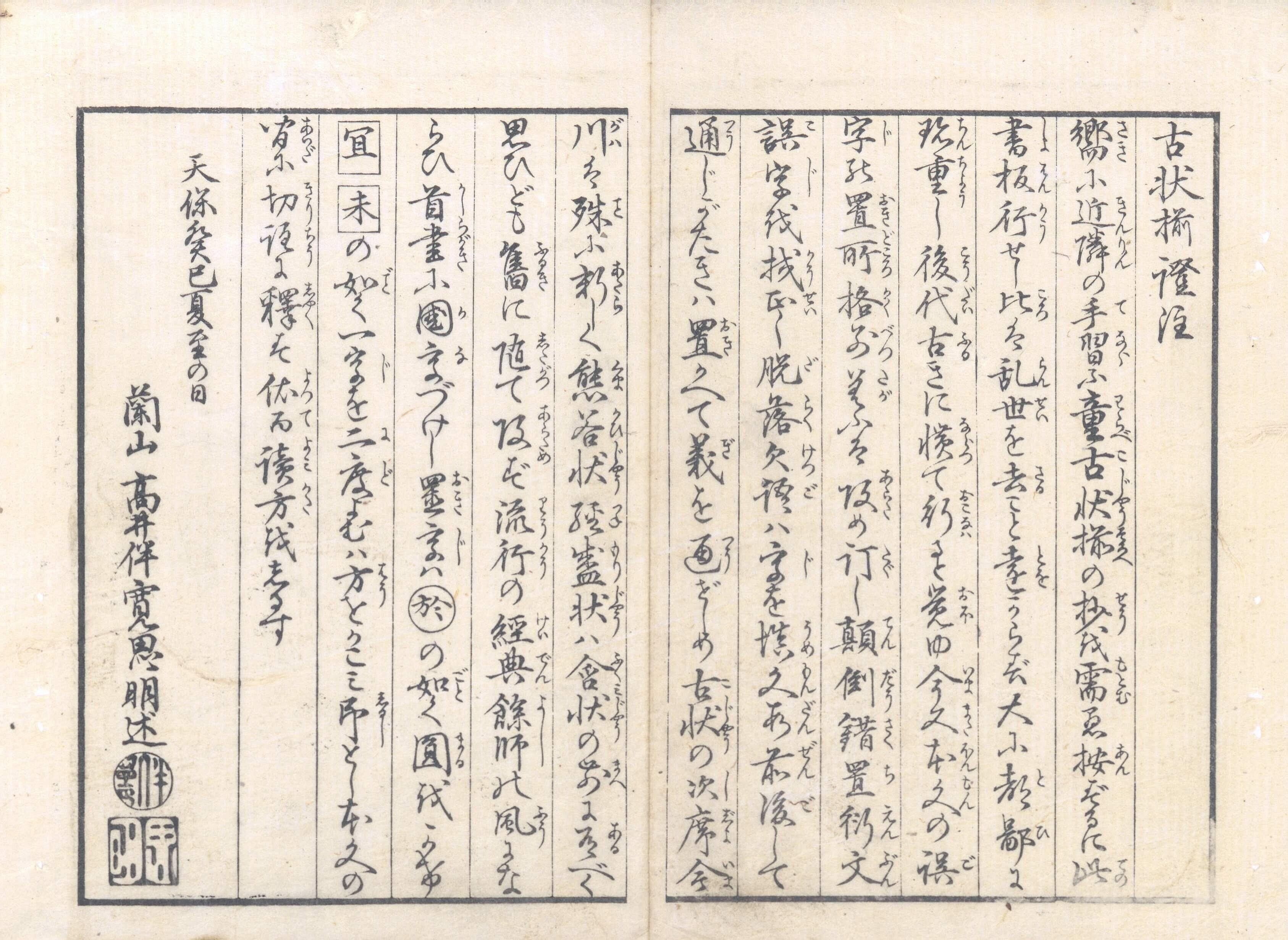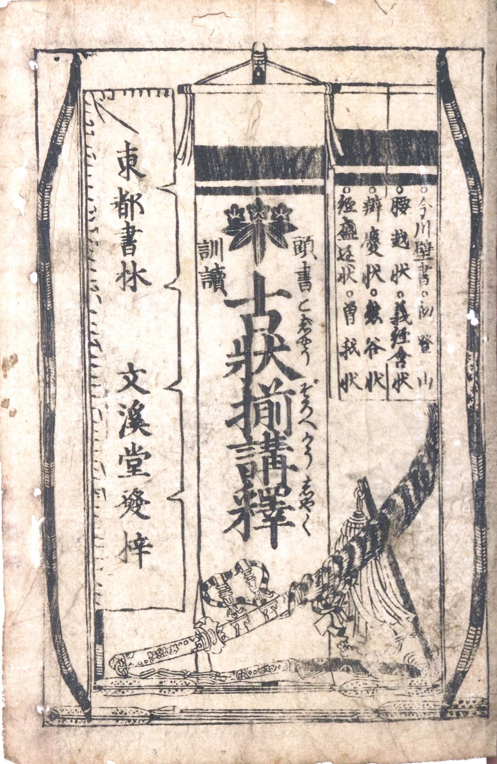 【備考】分類「往来物」。異本など4種を収録(全冊収録は袋綴じ展開収録)。天保14年刊『〈頭書訓読〉古状揃余師』に若干の補訂を加えたもの。施注内容・体裁とも『余師』とほとんど同じ。「今川状」「手習状」「腰越状」「義経含状」「弁慶状」「熊谷状」「経盛返状」「曽我状」「同返状」の九状を「経典余師」の形式で施注する。すなわち、各古状本文を数段に分けて大字・6行・無訓で記し、各段毎に割注を施し、さらに、頭書に本文読方(付訓の書き下し文)を載せる。施注はオリジナルではなく、高井蘭山の天保4年刊『児読古状揃証註』の模倣で、『古状揃』注釈書の多くがそうであったように、本書もまた『証註』の影響下に編まれたものである。なお、本文を付訓にして口絵を削除し、頭書に「日本百将伝」を掲げた異本も存する。