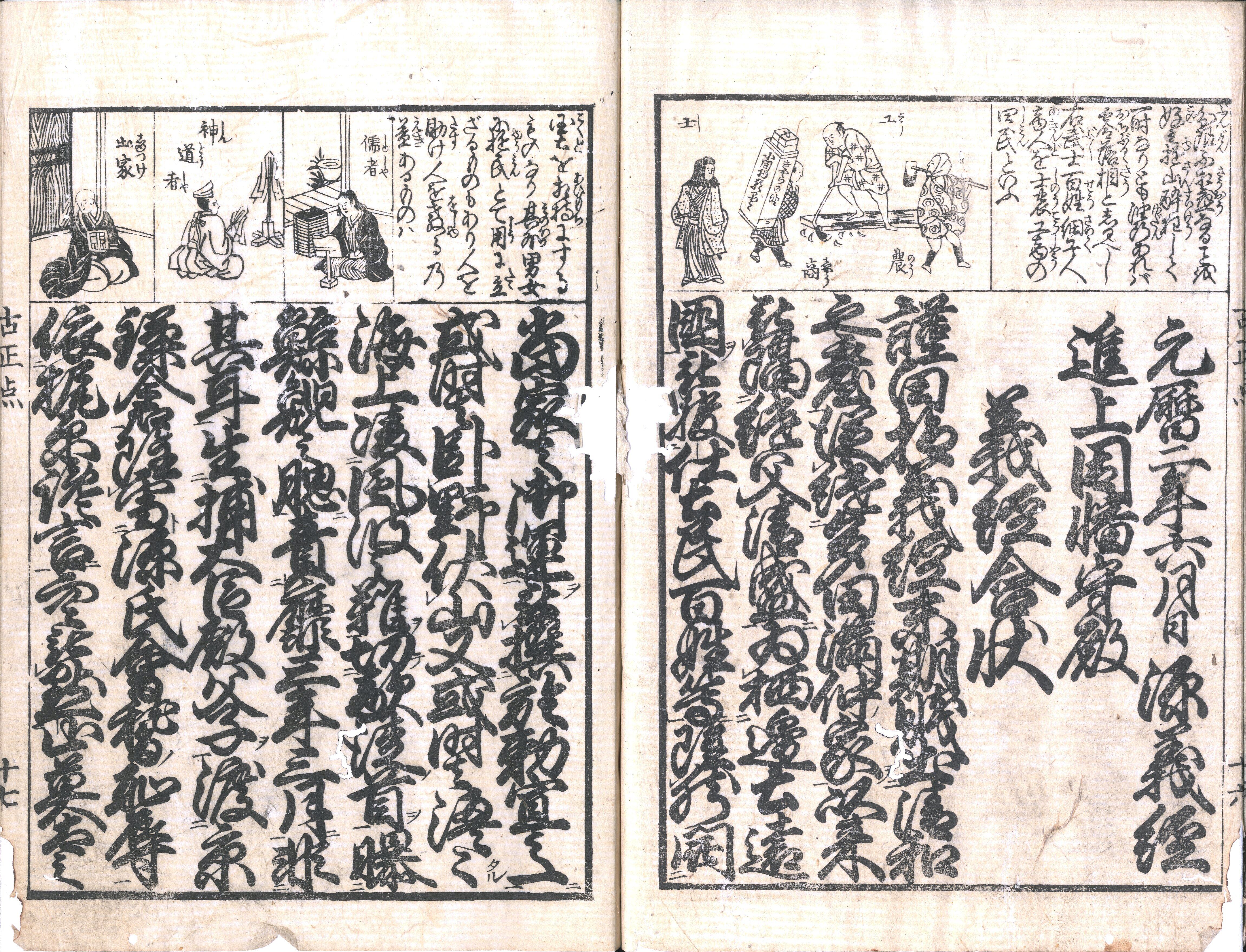 【備考】分類「往来物」。天保4年板『永楽古状揃大全』(本文無訓本)に先行する古状揃。今川状・手習状・腰越状・義経含状・弁慶状・熊谷状(送状)・経盛返状・大坂進状・同返状の9状を収録し、巻頭に「今川系図書」「天満宮御生涯伝」、頭書に「早道童子宝絵抄并字尽」等を掲げるが、本文付訓本とは前付や頭書記事が異なる。
