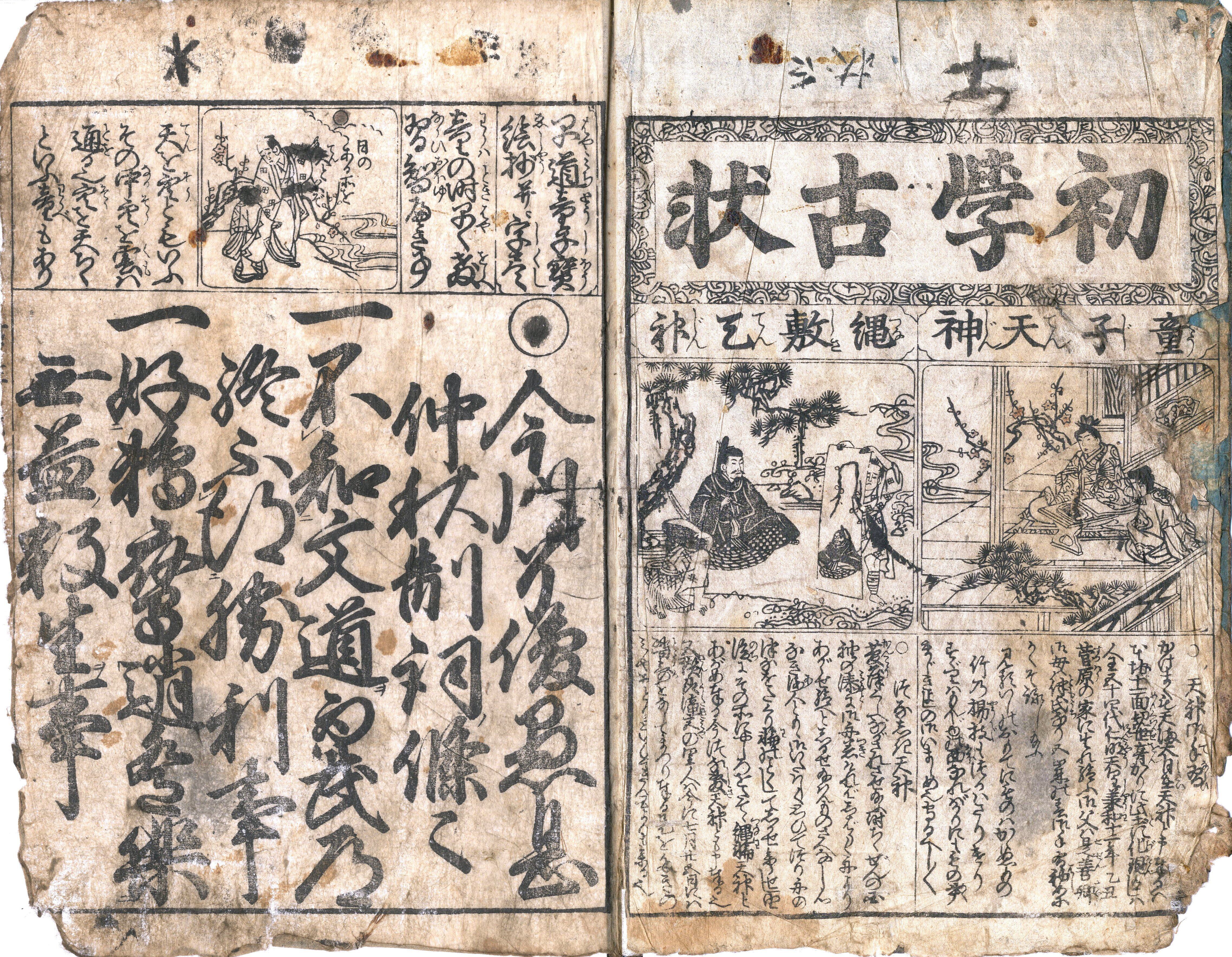 【備考】分類「往来物」。同板および再刻本など4種を収録(うち2種を全冊収録、他を抄録)。『古状揃』は近世初頭に『今川状』を中心に『腰越状』『含状(義経含状)』『弁慶状』『直実送状』『経盛返状』『曽我状』『大坂状』などの古状・擬古状や、『初登山手習教訓書(手習状)』『風月往来』などを組み合わせて出版した往来物。近世期を通じて最も流布した往来物の一つ。本書本文には、今川状・手習状・腰越状・義経含状・弁慶状・熊谷状(送状)・経盛返状・大坂進状・同返状の9状を収録。また巻頭に「童子天神・縄敷天神・牛天神・渡唐天神・石榴天神・天満大自在天神」、頭書に「早道童子宝絵抄并字尽」等を掲げる。