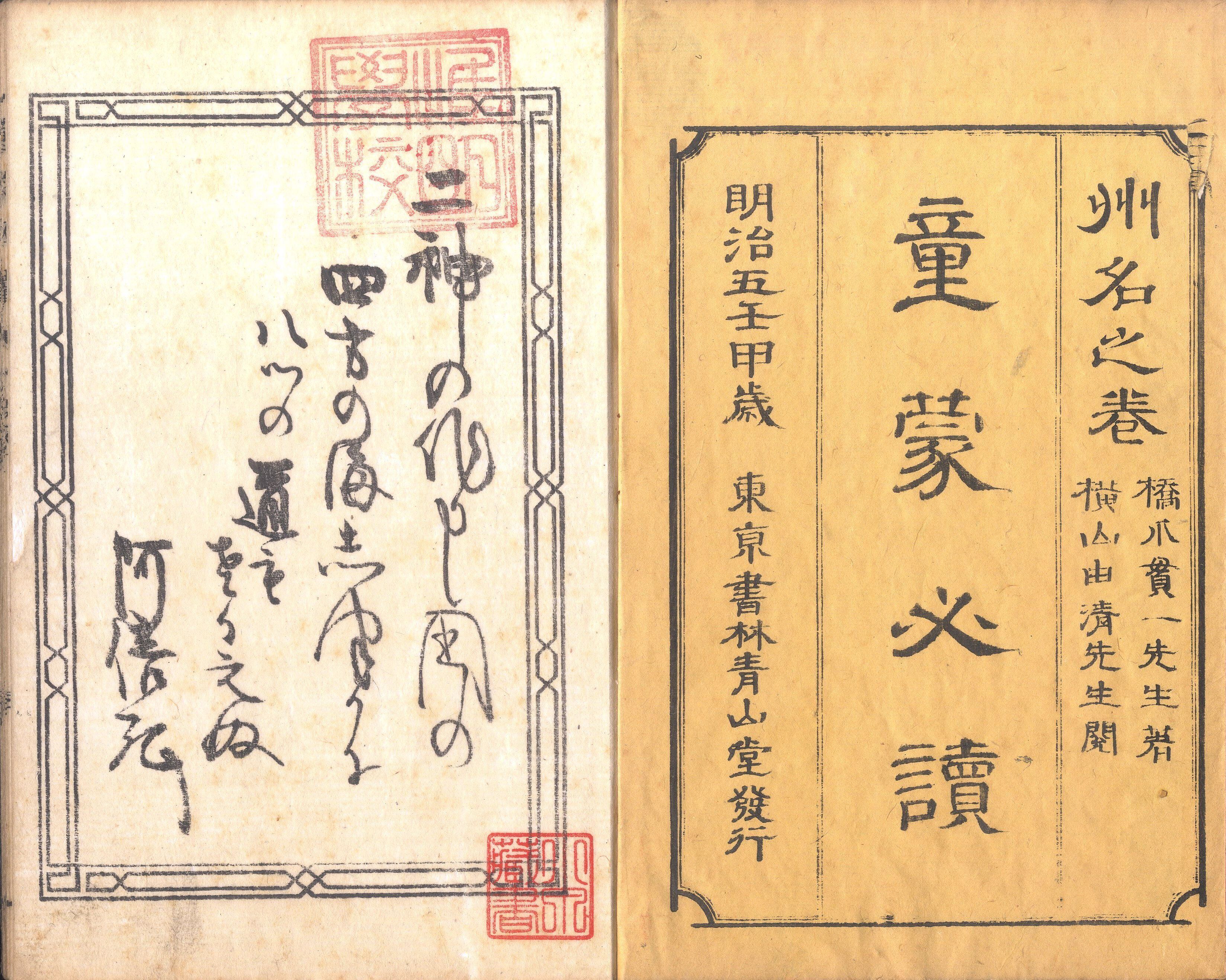 【備考】分類「往来物・近代教育」。「皇謚之巻」「年号之巻」「州名之巻」から成る明治期往来物。「皇謐之巻」は、神武天皇から明治天皇までの歴代天皇の名を半丁に3行、1行に2名ずつ大字・楷書で書したもので、頭書に天皇の諱や崩御年月日などを記す。「年号之巻」は、大化から明治までの元号を半丁に4行、1行に2語ずつ大字・楷書で書したもので、頭書に各元号についての略注を加える。「州名之巻」は、畿内から西海道および二島までの旧国名を半丁に4行、1行に2国ずつ大字・楷書で書したもので、本文の所々に五畿七道毎の区分地図を収めるほか、頭書に各国内の郡名および当代の府県名等を注記する。なお本書の増補版に『幼童初学』、また本書の模倣と思われるものに『学校童子訓』がある。