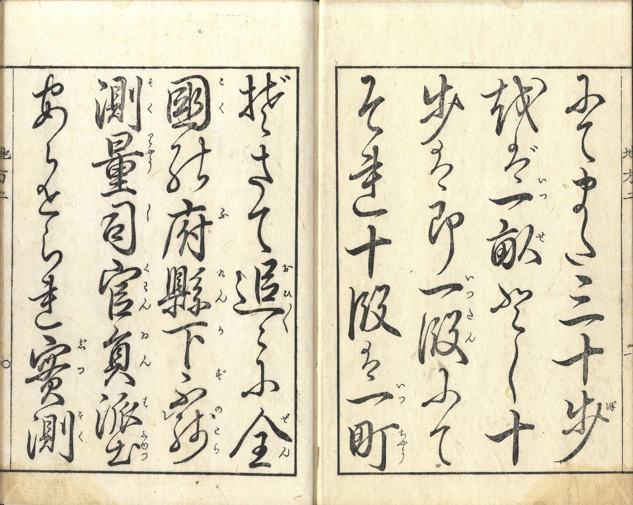 【備考】分類「往来物」。「地方」関連の語彙を集めた往来の一つ。初編は「凡、地方に関(あずか)りたる地所の名称・区別等、そのあらましをいふときは、先皇宮地と唱ふるは、皇城はじめ仮皇居、青山御所や離宮の地、皇族がたの邸なり…」で始まる七五調の文章で、皇宮地・神地・官庁地(諸官庁名も付記)・官用地・官有地・公有地・私有地等の地所の概要と、田地・測量・検地関連、農業・潅漑施設、貢納・雑税・輸送、農政所轄官庁・役人、土地売買と証書類、明治政府下の新しい諸施設、農民心得までを述べる。2編は、「抑地方の一歩とは、方六尺の称へにて、また三十歩をば一畝とし、十畝は即一段にて…」と七五調の文章で綴り、土地測量の単位、開拓・開墾、土地の等級、その他地方関連の役人・用語、年貢・夫役・雑税と輸送手続き、農村諸施設、凶作時の政策等、運輸・交通、売買・貸借・取引、届出・訴訟・法令・和解、学校教育等に関連する語句を列挙する。初編・2編とも本文を大字・4行・付訓で記すが、2編には所々左訓を施す。