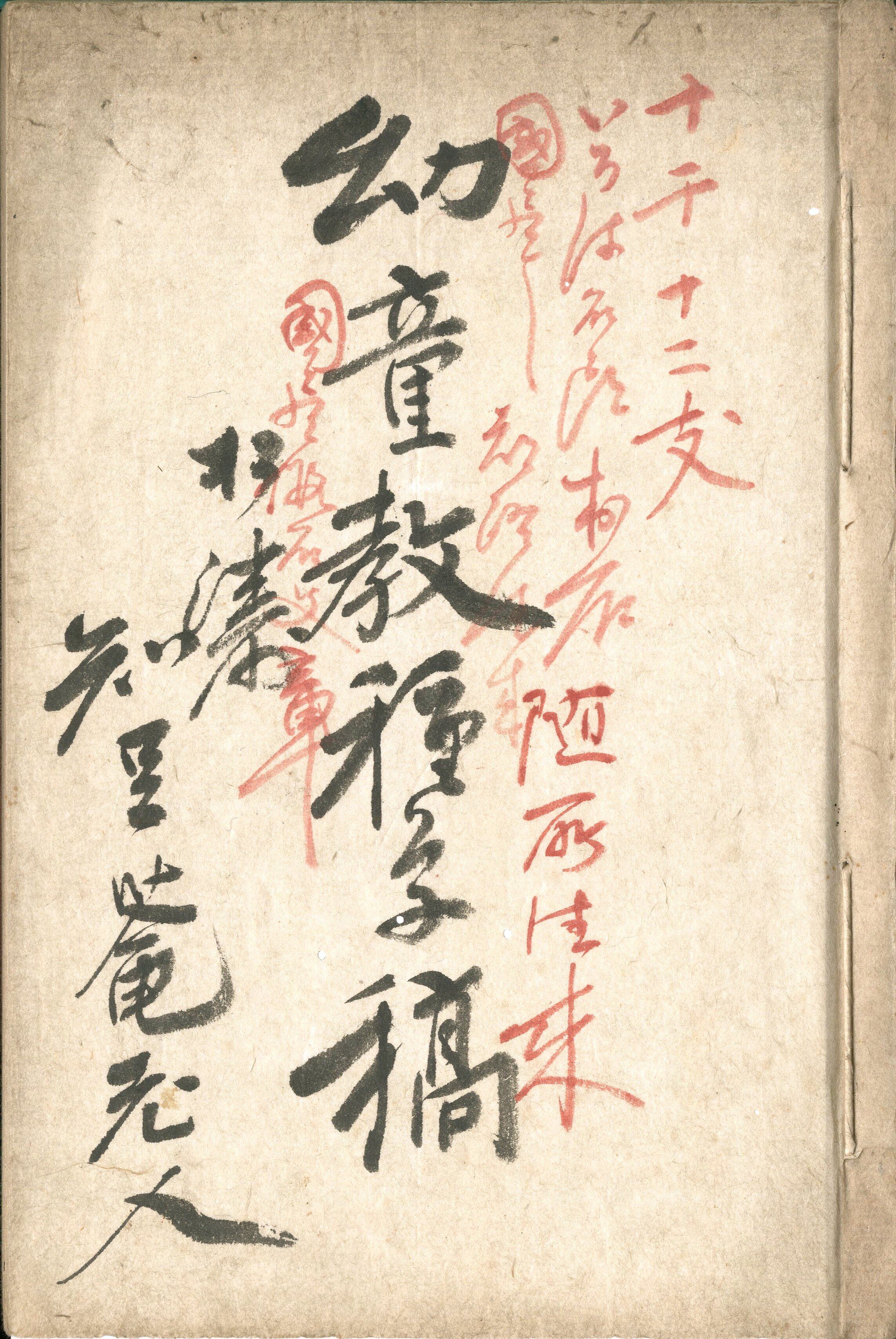 【備考】分類「往来物」。『幼童教種草稿』は、「三体いろは(平仮名・万葉仮名・片仮名)」「十干十二支」「名頭字」「村名(下野国諸郡)」「日本国州名仮名文章」「日本国名帖(日本国尽)」「随所往来(下野国物産関係)」「手習教訓(仮称)」「十二月異名等(仮称)」「都路往来(東海道往来)」「旧御大名苗字」「苗字尽し」「正月元日十干による風雨占い(仮称)」から成る手習本の草稿。作者の所在に関する記載がないが、「随所往来」中に「当佐野客寄之物産…」とあることから、下野国安蘇郡佐野(現・栃木県佐野市)の手習師匠の手控えと思われる。以上のうち「名頭字」以下の諸往来には、流布本と異なる独自の記述が多く含まれるのも特徴。とりわけ「随所往来」は、「凡当国産物之有増者、日光人参、黄連、并、木具(きぐ)、塗物、引田の麻、真岡(もおか)木綿、栃木白、烏山之半紙、煙草、足利之小倉、御召縮緬、南都柳河」と起筆してまず下野国各地の物産に触れたうえで、「扨亦、当佐野客寄之物産者、材木、炭、真木、薪、石炭…」と続けて、佐野地方の物産(燃料・雑穀・野菜・醸造品・文房具等)、また、農家で用いる用具・日用品、農閑余業の織物類、染色・模様などに関する要語を羅列し、さらに、末尾で、織物の規格や種類、相場価格、工夫次第で得られる利益や、糸相場狂いで得られる利潤にも触れる。最後にそうは言っても、「我が国に生まれた者は農業を忘れず、今日の奉公は農業であると心得て耕耘を忘れてはならない」と締め括る。なお、末尾には4丁の遊紙(白紙)を付すが、これは一部のみ収録した。