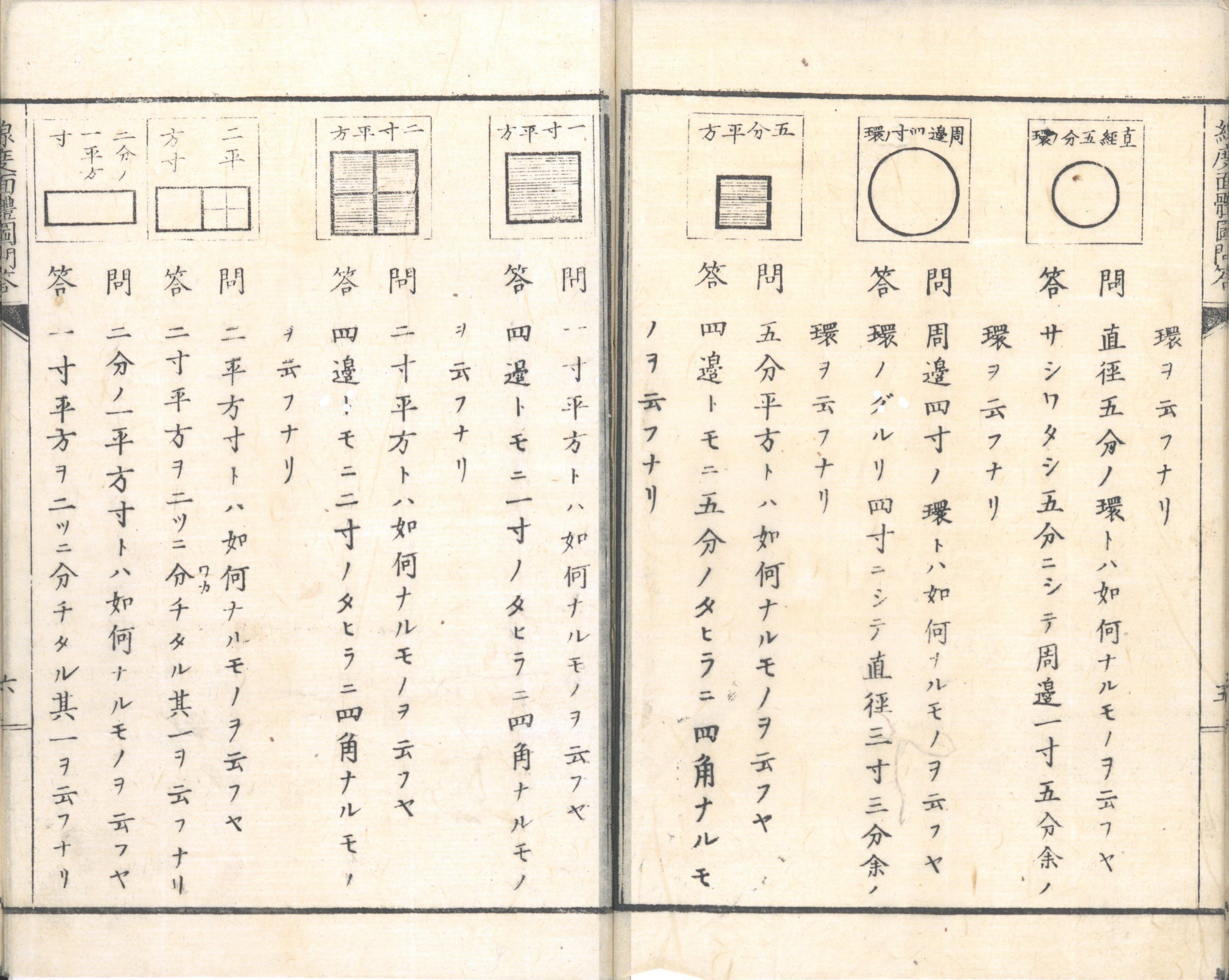 【備考】分類「往来物」。『線度面体図問答』は、各種の線や図形について一問一答形式で簡潔に説明した教科書。上欄に適宜、図解を掲げる。「問、線ノ類ハ幾種ナルヤ」「答、二種ナリ」と起筆して、直線・曲線・波線・折線・螺旋・渦線・縦線・斜線・平線・直角線・平行線・聚交線・直角・鋭角・鈍角・弧弦・直径・半径・周辺・周心環・長径・短径・直径一寸ノ環・直径七分ノ環ほか、五分平方・一寸平方ほか、二分ノ一平方寸・一分ノ尺度ほか、環ノ度・半周・象限(ショウゲン)・三角・方形・五角ほか、両等辺三角・不等辺三角形ほか、長方形・斜方形ほか、梯形・一辺弧三角形・弧三角形・卵形・楕円・円・半円・四分円・六分円・新月形・環(カン)・球・半球・球缺・楕円体・四面体・立方体・三角柱・方柱・円柱・三角錐体・方錐体・円錐体までを説明する。