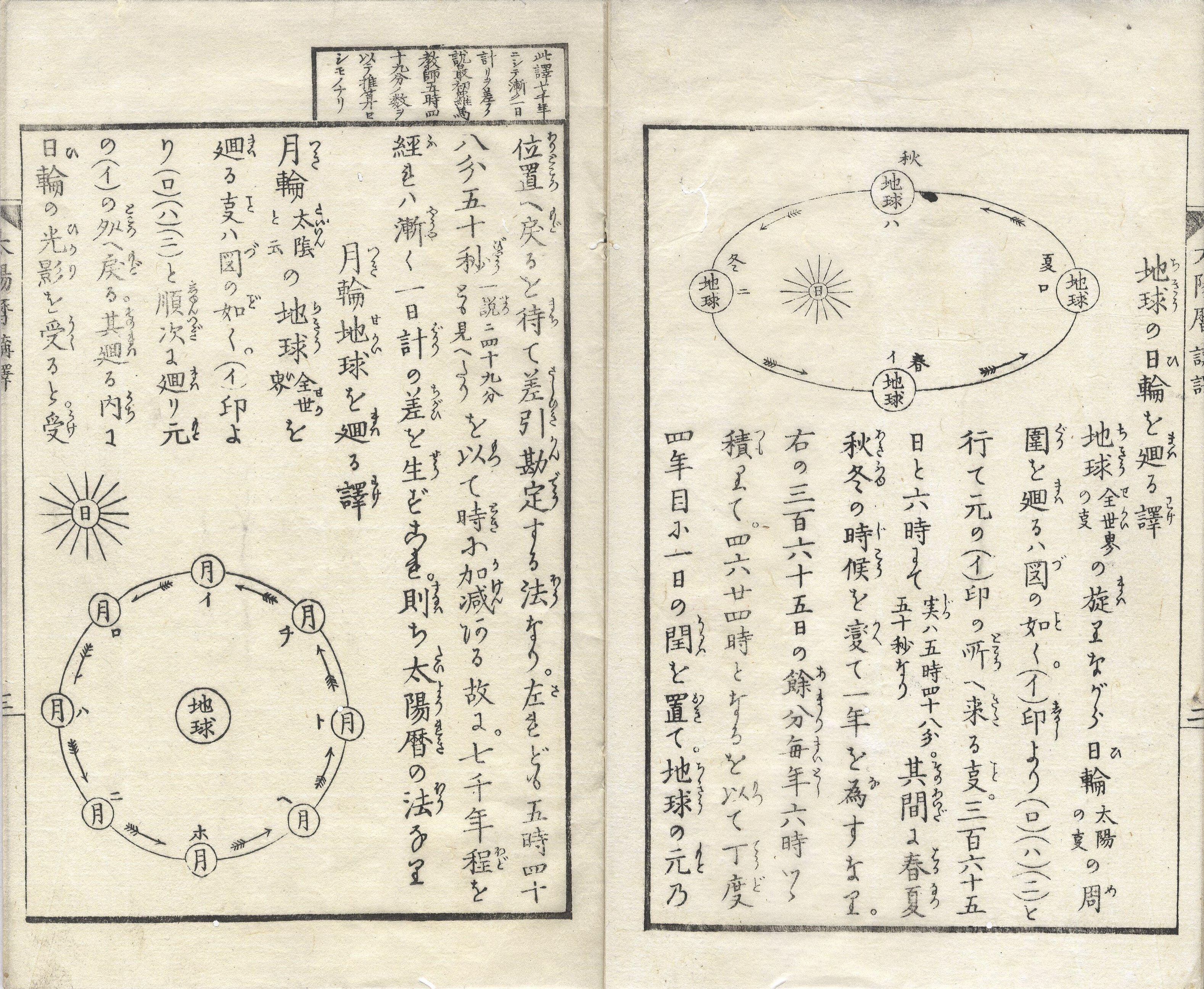 【備考】分類「往来物」。新暦採用に伴い太陽暦の概略を記した教科書。「太陽暦の訳」「太陰暦の訳」「地球の日輪を廻る訳」「月輪地球を廻る訳」「昼夜十二時を改め廿四時に分る訳」「太陰暦を廃(やめに)せられて衆庶(おおくのひと)自由を得たる訳」「太陽暦は永々の重宝なる訳」の七項に分けて説き、新暦制定を「愚痴蒙昧の心目を一掃し、知識開化の大基礎と成るは、今度の改暦なりと有難く忝く思ふべき事ならずや」と大いに讃えて結ぶ。本文をやや小字・9行・付訓で記す。なお首題に続けて「遠藤茂平抄録」と記すため、先行類書からの抄録か。