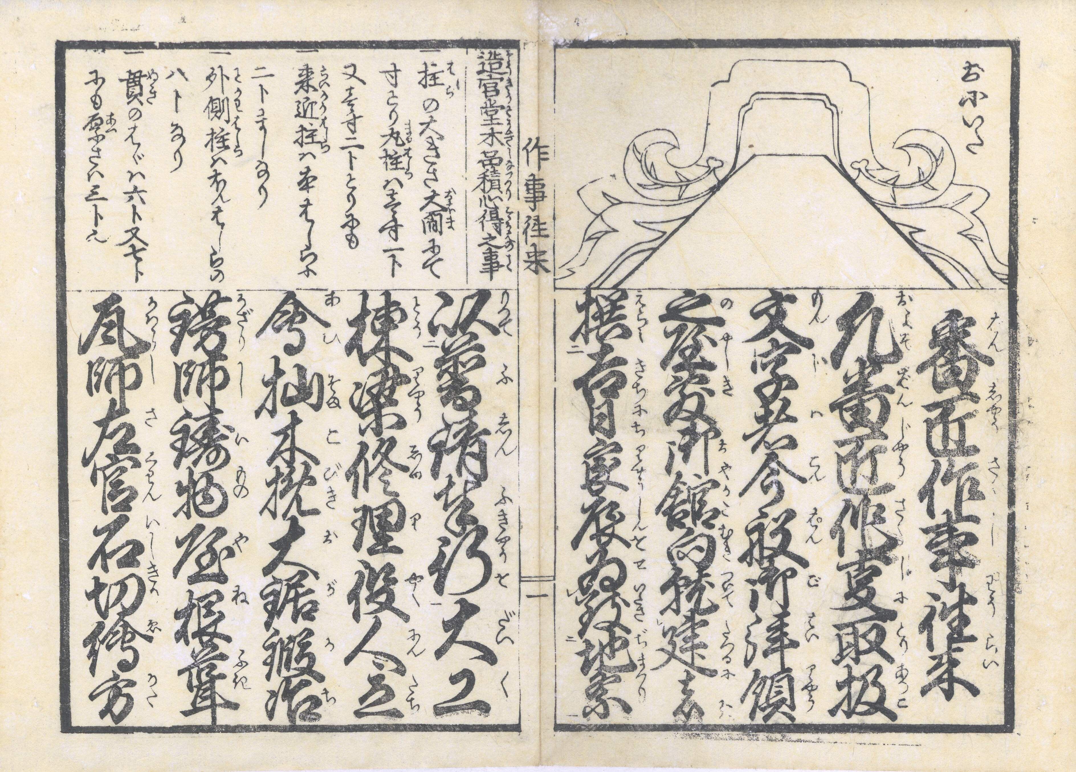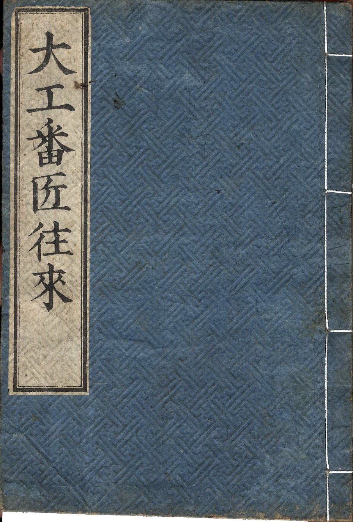 【備考】分類「往来物」。江戸板と明治期改刻本など6種を収録。うち数本を袋綴じ展開収録(見開き図再掲)。『大工番匠往来[大工註文往来・番匠作事往来]』は、享和頃刊『番匠作事文章』とほぼ同文の往来物。「凡、番匠作事取扱文字者、今般御拝領之屋敷・御館向就建者、撰吉日良辰為致地祭…」で始まり、地鎮祭、建築関連職人、建築用材、神社仏閣の建築、武家屋敷の建築、城郭建築、左官、瓦葺、棟上の儀式などについて記す。本文を大字・5行・付訓で記す。巻頭に「上棟四方堅規式之図」、頭書に「造宮堂木品積心得之事」「追掛大栓継(以下数々の継ぎ方を図解)」等を載せる。作者の活動年代からして嘉永以降の刊行であろう。