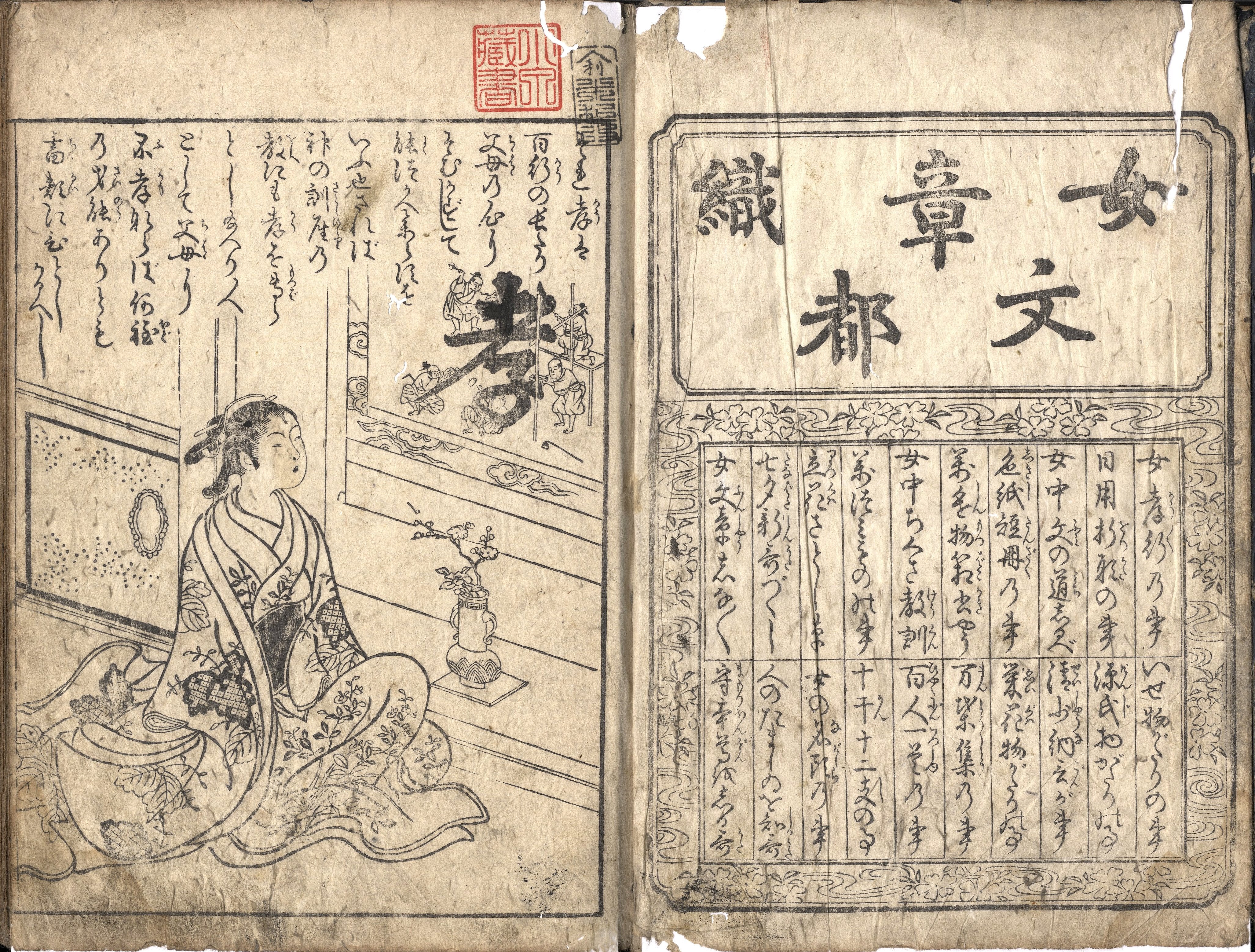 【備考】分類「往来物」。後半に本書改題本の延享4年刊『女文章都織』を抄録。上巻は「年の始に遣す文・返事」「物詣より帰て遣文・返事」「秋の夜人をよびにやる文」「おなしく礼の文」「縁付の方へ遣す文・返事」、中巻「歌学する人へ遣文・返事」「よそへ物かりに遣文・返事」「能書へ物頼に遣文・返事」「初て逢たる人に遣文・返事」、下巻「祝言の拵物尋にやる文」「おなしくさし図の文」「相伴頼し人へ礼文・返事」「日待に行て遣文・返事」「物見より帰て遣文・返事」からなる。