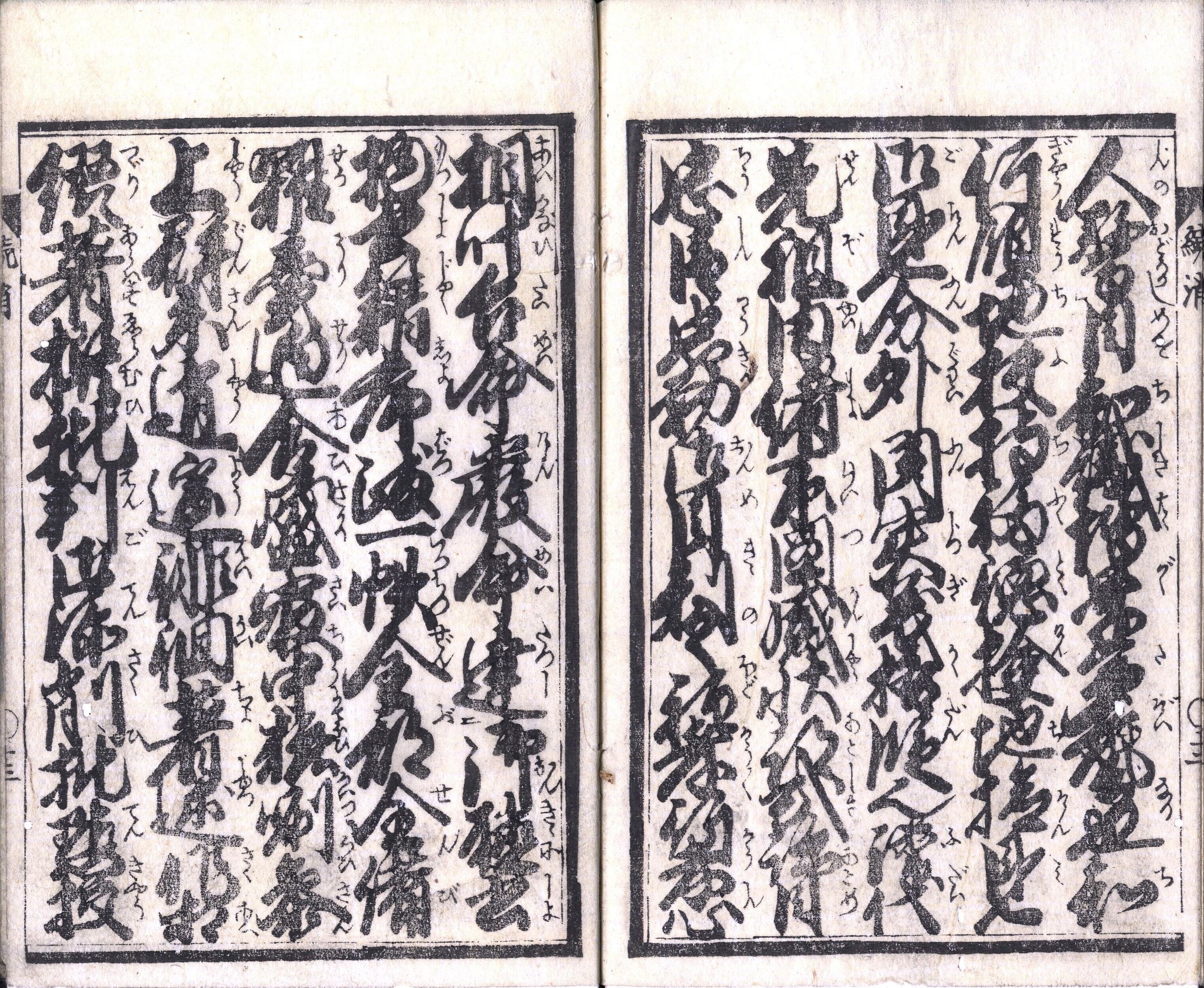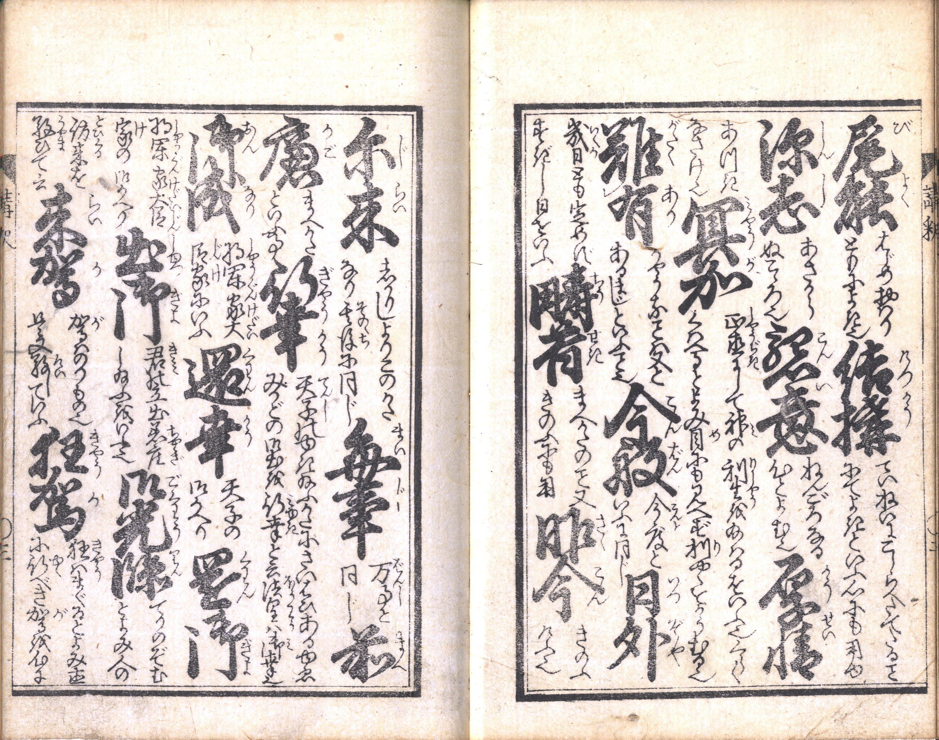 【備考】分類「往来物」。同板・異板など3種を収録。「大全消息往来」には類書が多く、基本的に「消息往来」「続消息往来」「消息往来講釈」の3部を合本したもの(稀に「消息往来」に代えて「増字消息往来」を収録するものもある)。うち「消息往来」は文化頃刊と思われる鶴屋喜右衛門板『消息往来』とほぼ同様。「続消息往来」は『消息往来』に漏れた消息用語を無秩序に羅列したもの。「消息往来講釈」は、『消息往来』の本文から要語をとり上げて割注を施したもの。本文を大字・5行・付訓で記す。基本的に行書体だが、「講釈」の要語のみ楷書体で記す版や、巻頭に「士農工商図」や「書筆心得」を掲げた版もある。底本は、「消息往来」「消息往来講釈」「続消息往来」の順に収録し、見返しに「士農工商図」、裏表紙見返し「十幹・十二支」を載せる。
