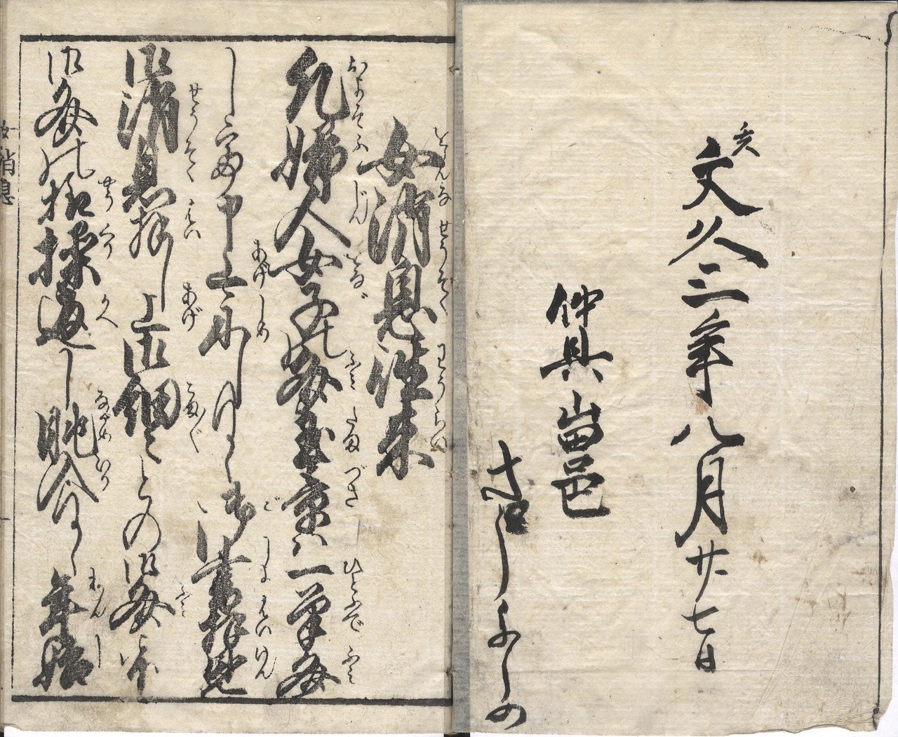 【備考】分類「往来物」。文化2年刊『女消息往来(消息女往来)』の異本。「凡、婦人の文玉章は一筆申上、文して示し、御細々とも御文難有拝し、拝見、繰返し詠め入まいらせ候…」で始まる全文1通の女文中に、様々な消息用語を列挙する。末尾では親類・他人、吉事・凶事の違いや上下の違いによって文言を区別すべき旨を説いて締め括る。