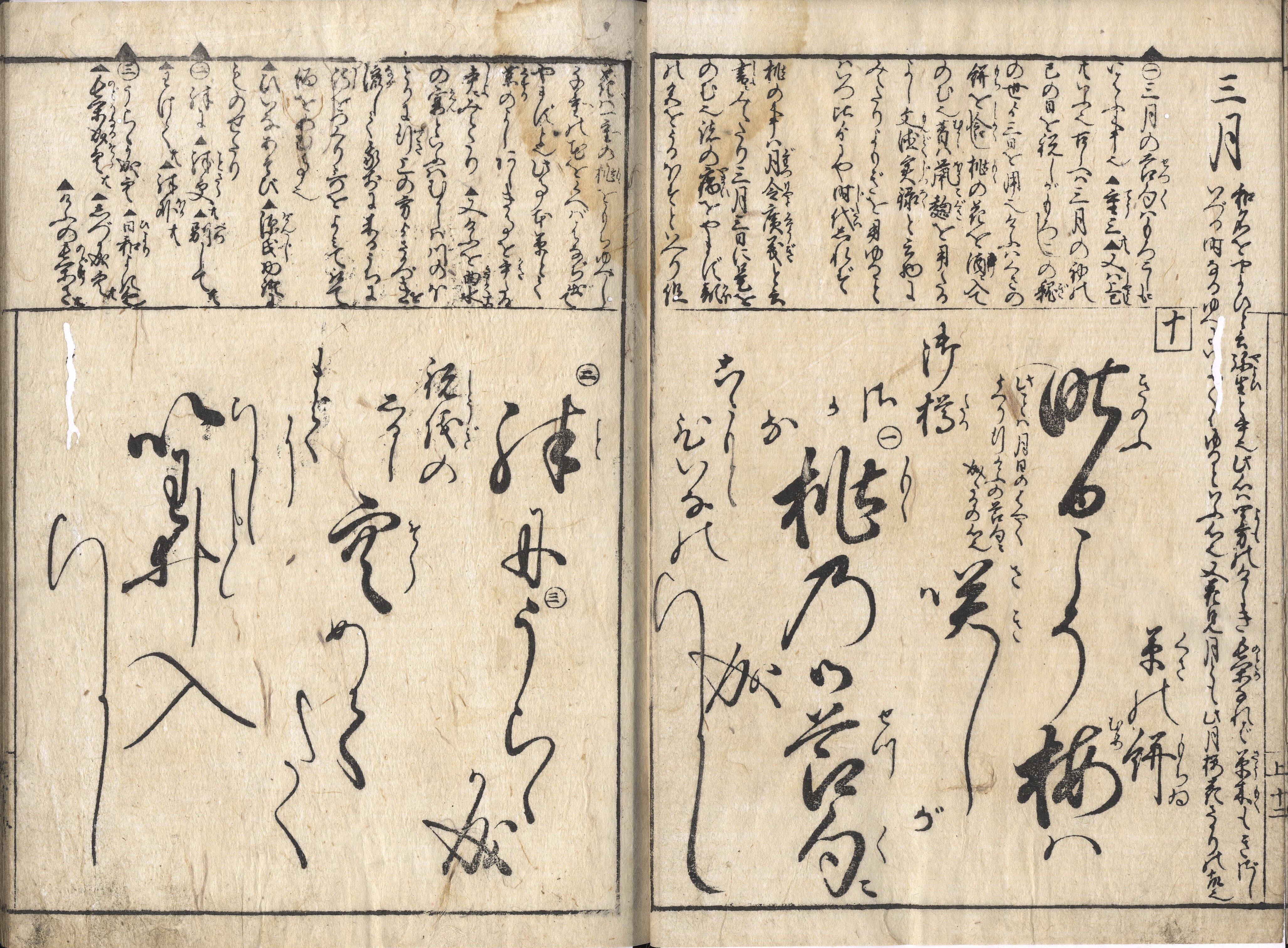 【備考】分類「往来物」。後半に初刷りの別本(中巻欠2巻合1冊本)を全冊収録した。ある人の求めに応じて女子手習いの手本として居初津奈が著わした女用文章。上巻は1~5月の例文(21通)、中巻は5~10月の例文(21通)、下巻は11~12月の例文(15通)と付録記事6項から成る(全57通収録)。四季時候の手紙を主とするが、用件中心の例文や弔状なども含む。本文要語に振り仮名や漢字表記、略注などを添えており、特に頭書注釈が広範かつ詳細である。