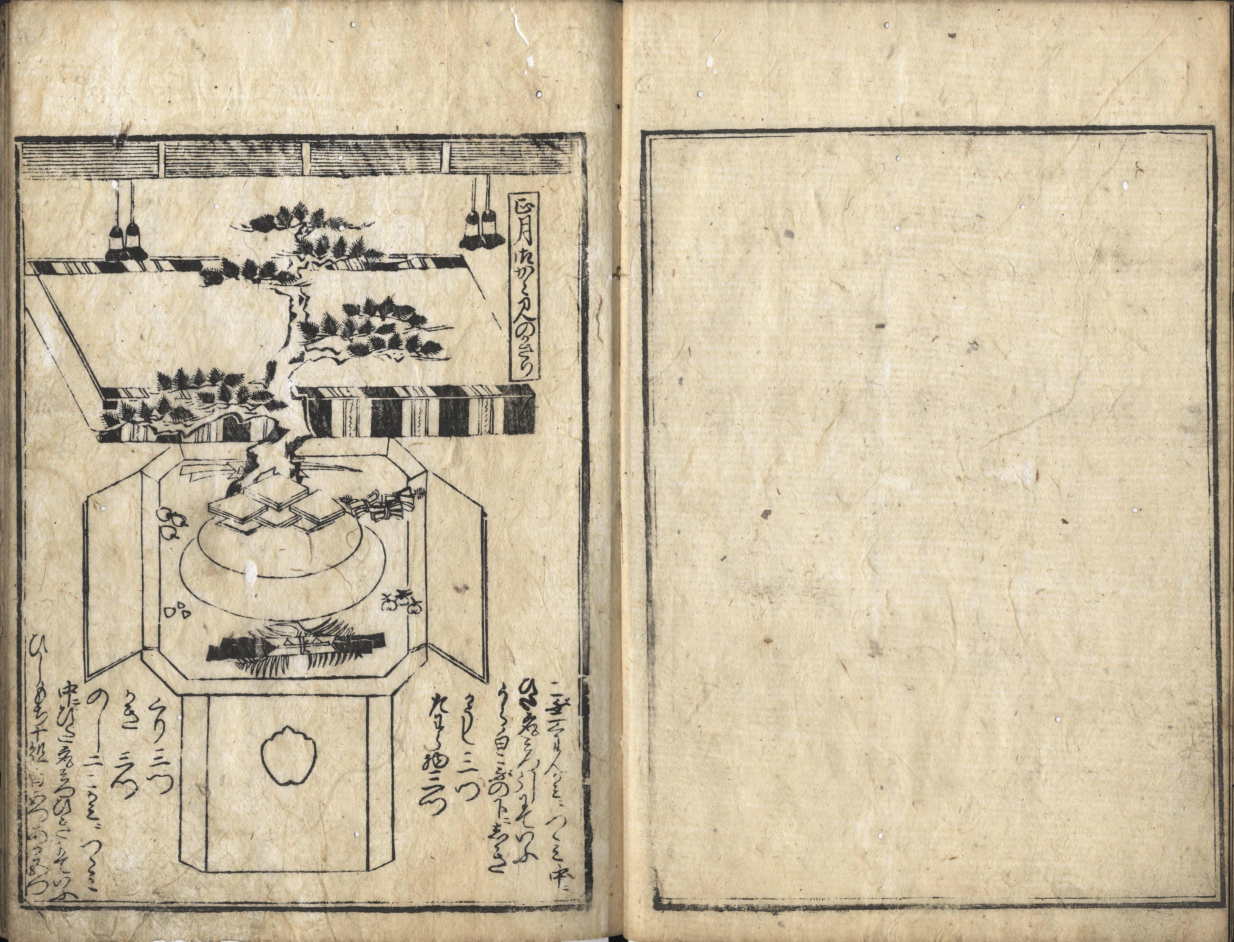 【備考】分類「往来物・礼法」。小笠原流の女性礼法書の最初の刊本。第2巻「喰かた通ひ品々」で、食礼・給仕方礼法の部分。