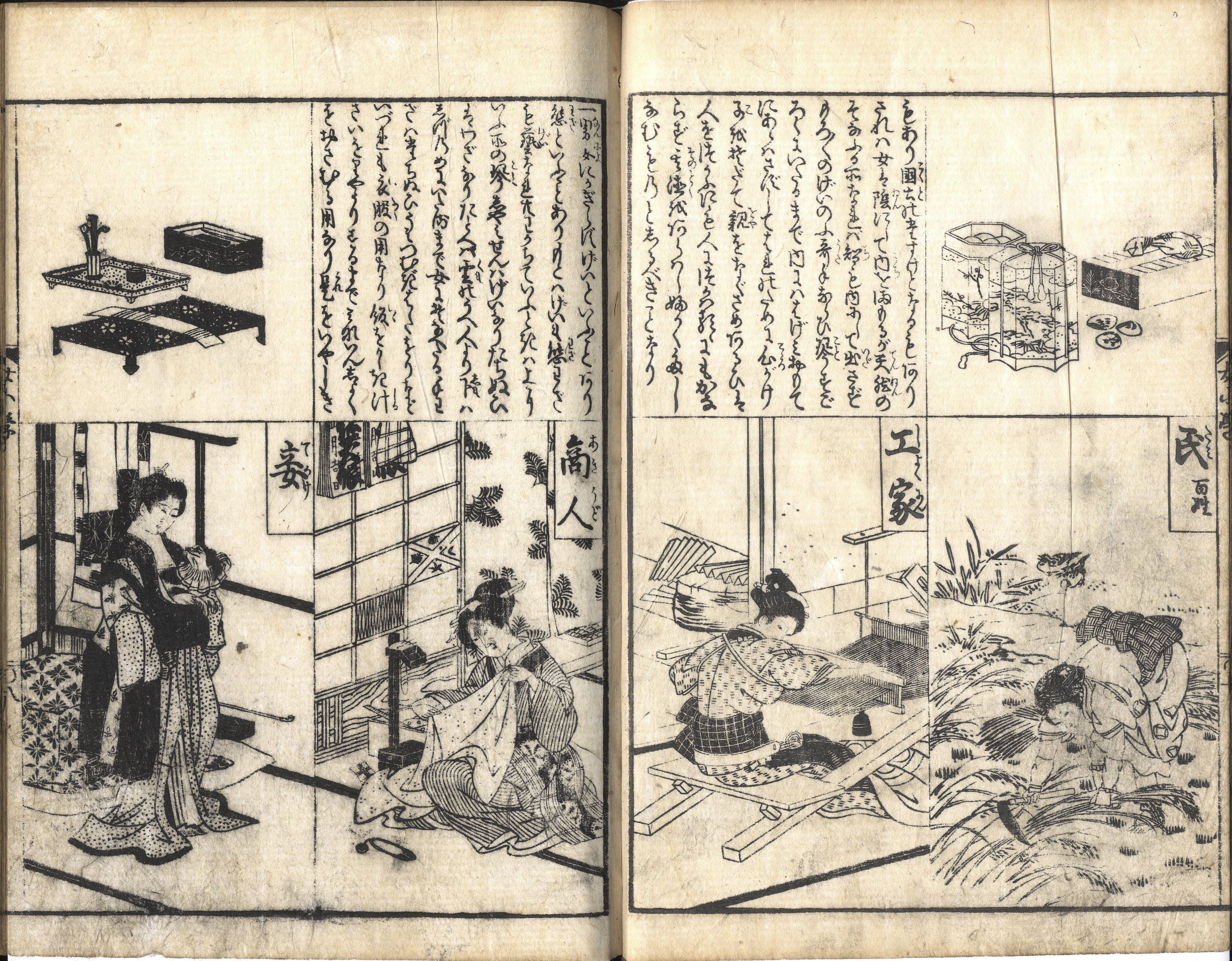 【備考】分類「往来物」。同板の後印本も抄録した。享保10年刊『〈佩戒絵入〉女小学』の本文を大幅にリライトして、種々の付録記事を増補した往来。本文の骨子は享保10年板同様だが、部分的に削除(特に作者や娘に関する個別的記述など)または増補を加え、大字・5行・付訓を基本とする読み書き兼用の往来に再編集し、併せて、享保板にあった挿絵・序・跋の全てを削除した。後世への影響は享保板よりも本書の方が明らかに大きく、「婦女と生れては、身の行ひ男子とかはれり。先父母のかたはらに居て、あさなゆふないつくしみうやまひよく仕へ侍ること大やう婦女たるものゝ道…」で始まる改編板が後続の諸本に引き継がれた。前付に「蛤合之記」「歌かるたの記」「近江八景」「古今集撰者四人」「牡丹・蓮・菊」「女中品定」「婚礼之図式」「女中躾方之事」等、頭書に「和漢女鏡(至徳皇后~斉の孝女)」「手習文字の事」「伊呂波の事」「和歌の事」「和歌読心得之事并人倫和歌絵抄」「しみものおとし」「そめもの秘伝」「諸病めうやく」「七夕祭の事」「琴・三絃の事」「三十六歌仙」「女中詞の事」「四季文章」等、巻末に「当世艶おしろい」「男女相性絵抄」等を掲げる。なお、本書の再板本(天保4年・嘉永5年板)では、「画図のおもむきも時代のたがひたれば、これらをもことごとく今様の風俗に書あらため」たほか、付録記事にも部分的な改訂を施した。