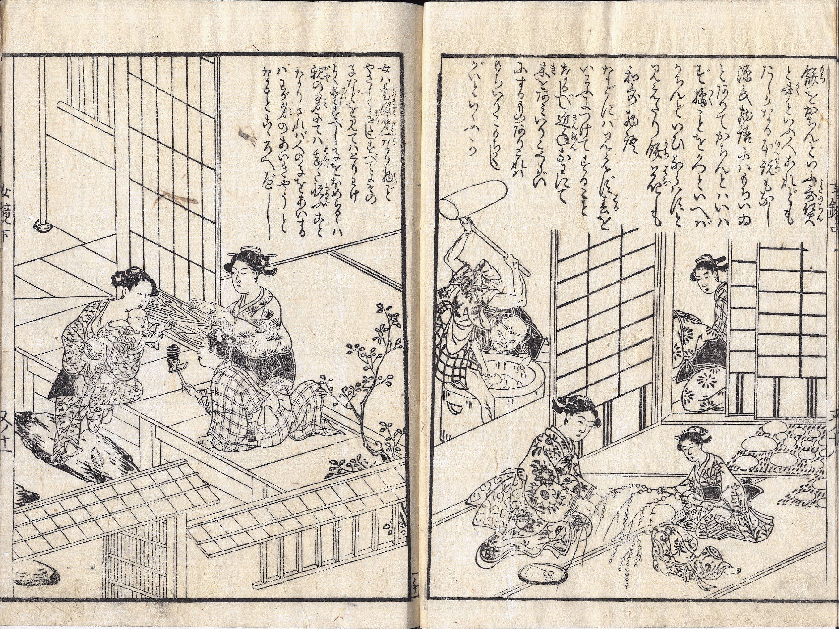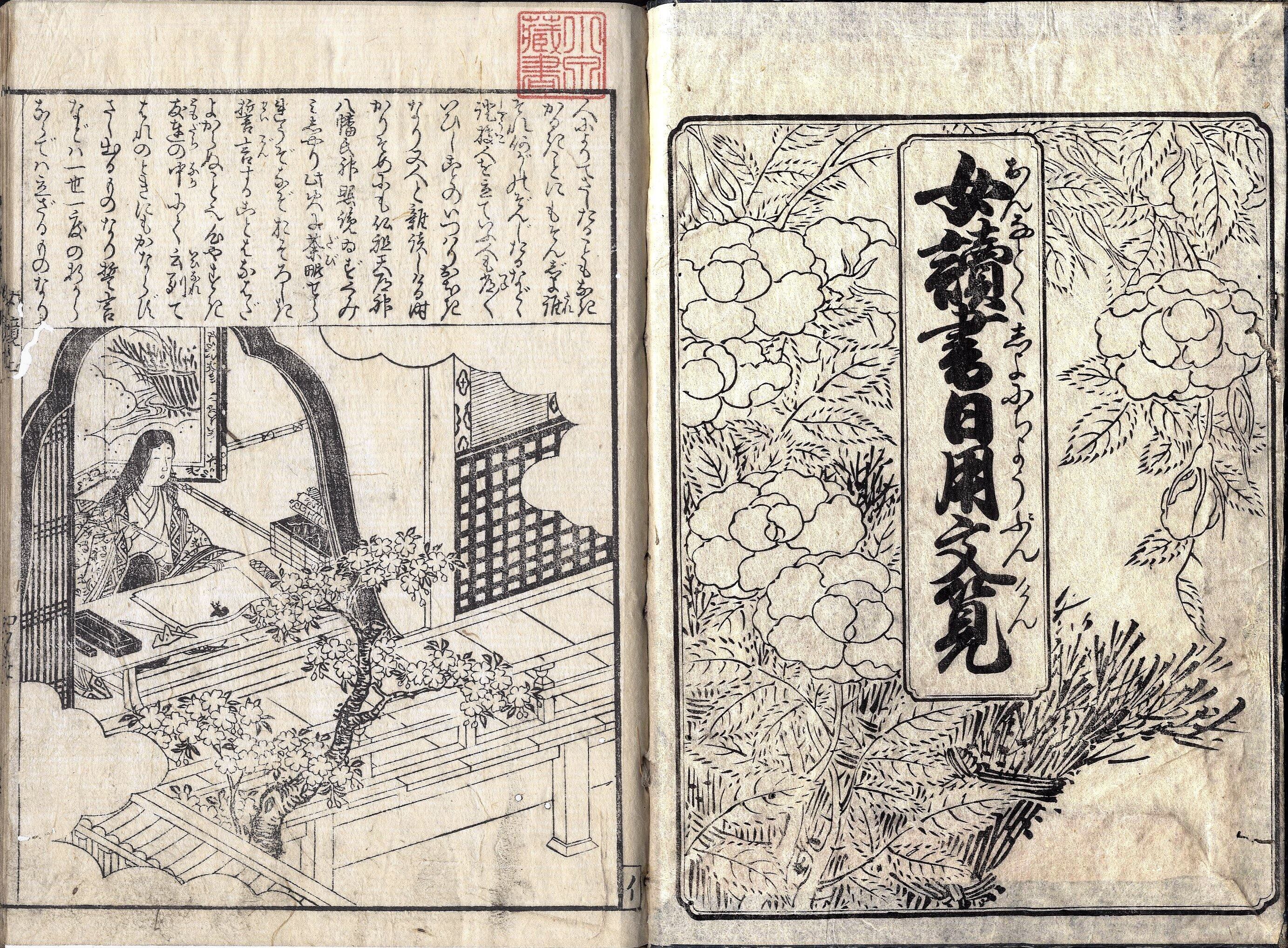 【備考】分類「往来物」。刊年・板元は『大阪出版書籍目録』による。『女読書日用文筧[女手ならひ教訓の書・女手習状]』は、享保17年刊『女手ならひ教訓の書[女手習状]』の改題本。同書本文の前付に明和4年刊『女鏡秘伝書改成』の前付9丁を増補したもの。『女手習状[女手ならひ教訓の書・女手習教訓書]』は、『初登山手習教訓書(手習状)』にならって、手習いの心得を綴った女子教訓書。「古しへは物かゝぬ人も世におほかりしとはきけ共、今は此めて度御代にむまれて物かゝねは、常にふじゆうなるのみにあらす…」と書き始め、まず手習いの重要性を述べ、特に学習期間が限られた女子はまず第一に心掛けよと説く。さらに、成人後も大いに役立つ手習いの徳を讃え、最後に「物かく事」は「現世・来世の宝」であり、「物かくゆへに仕合よき女性も世に多し」とその有益さを強調して結ぶ。本文を大字・5行・ほとんど付訓で記す。