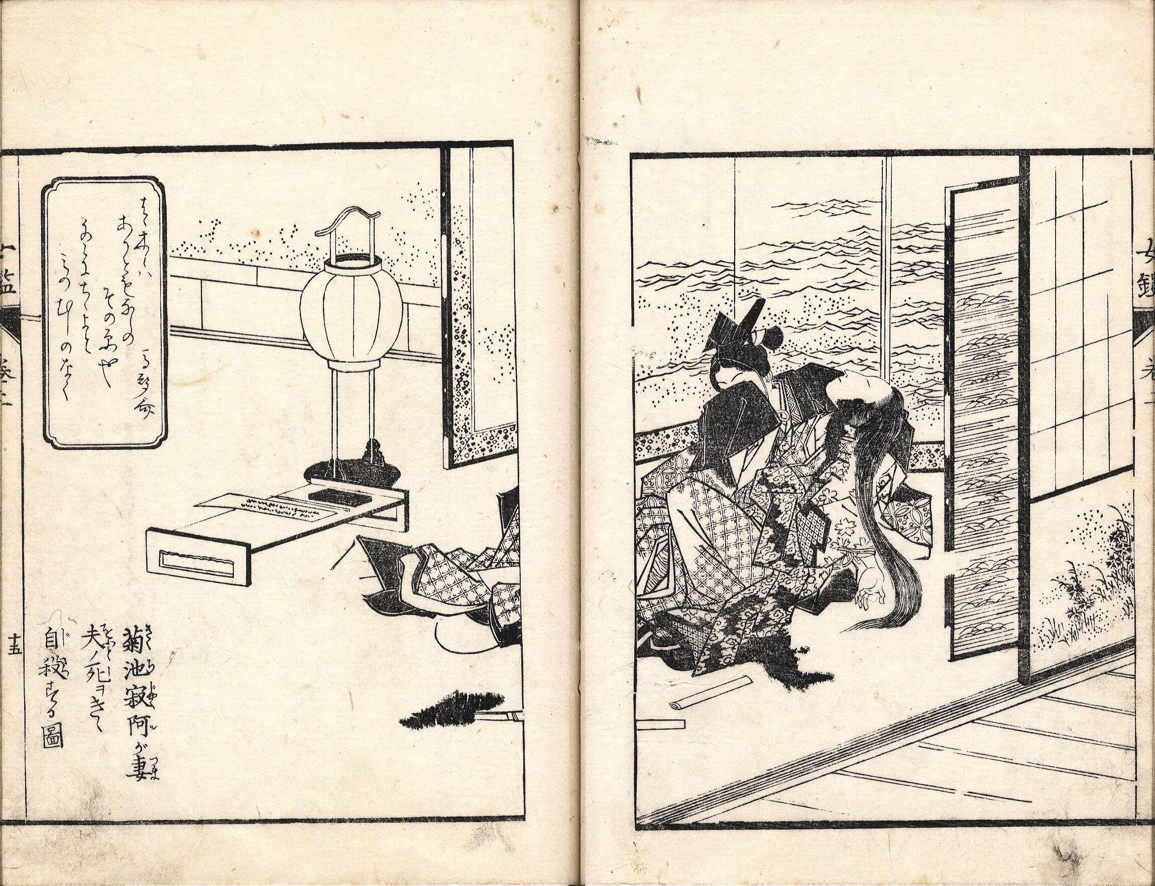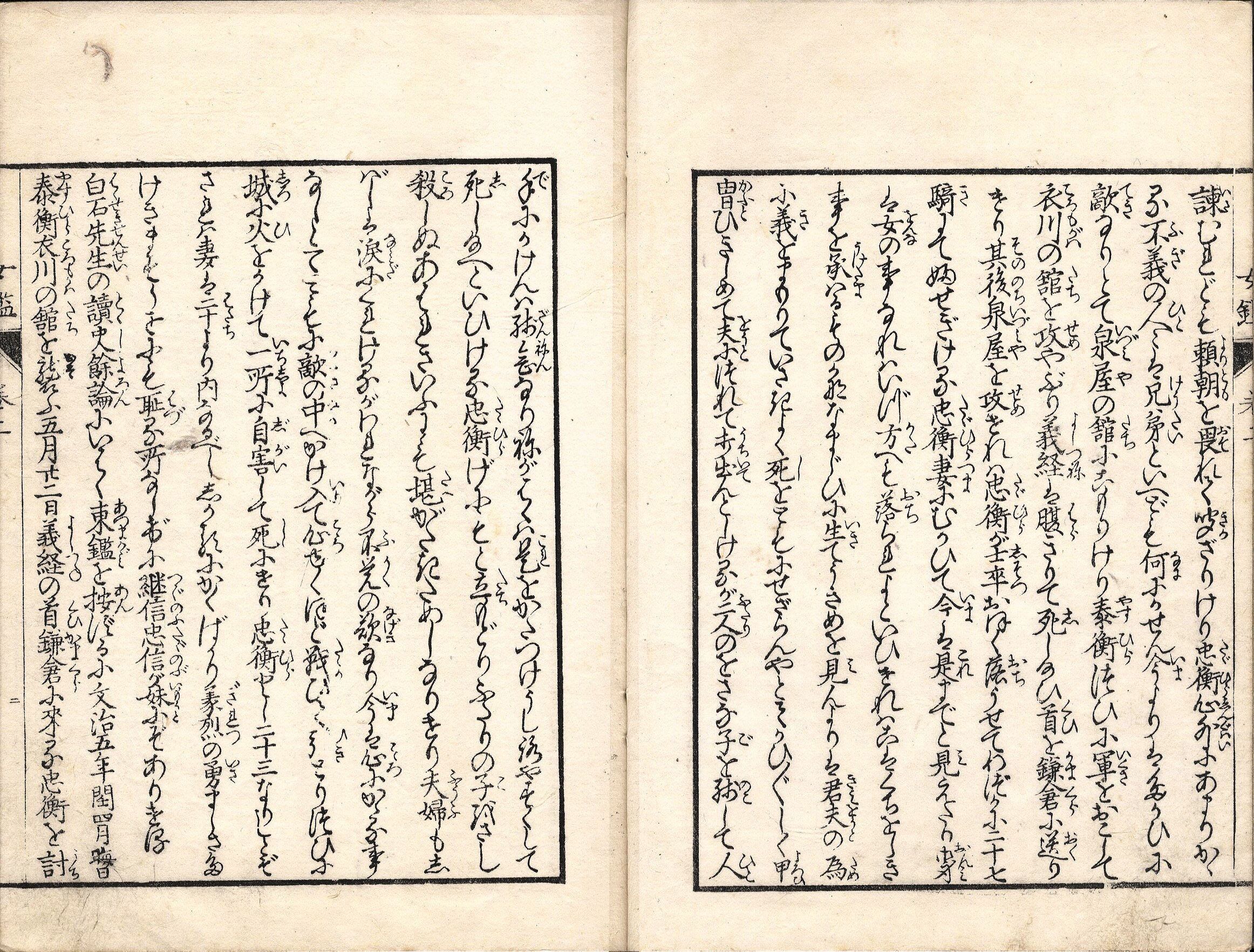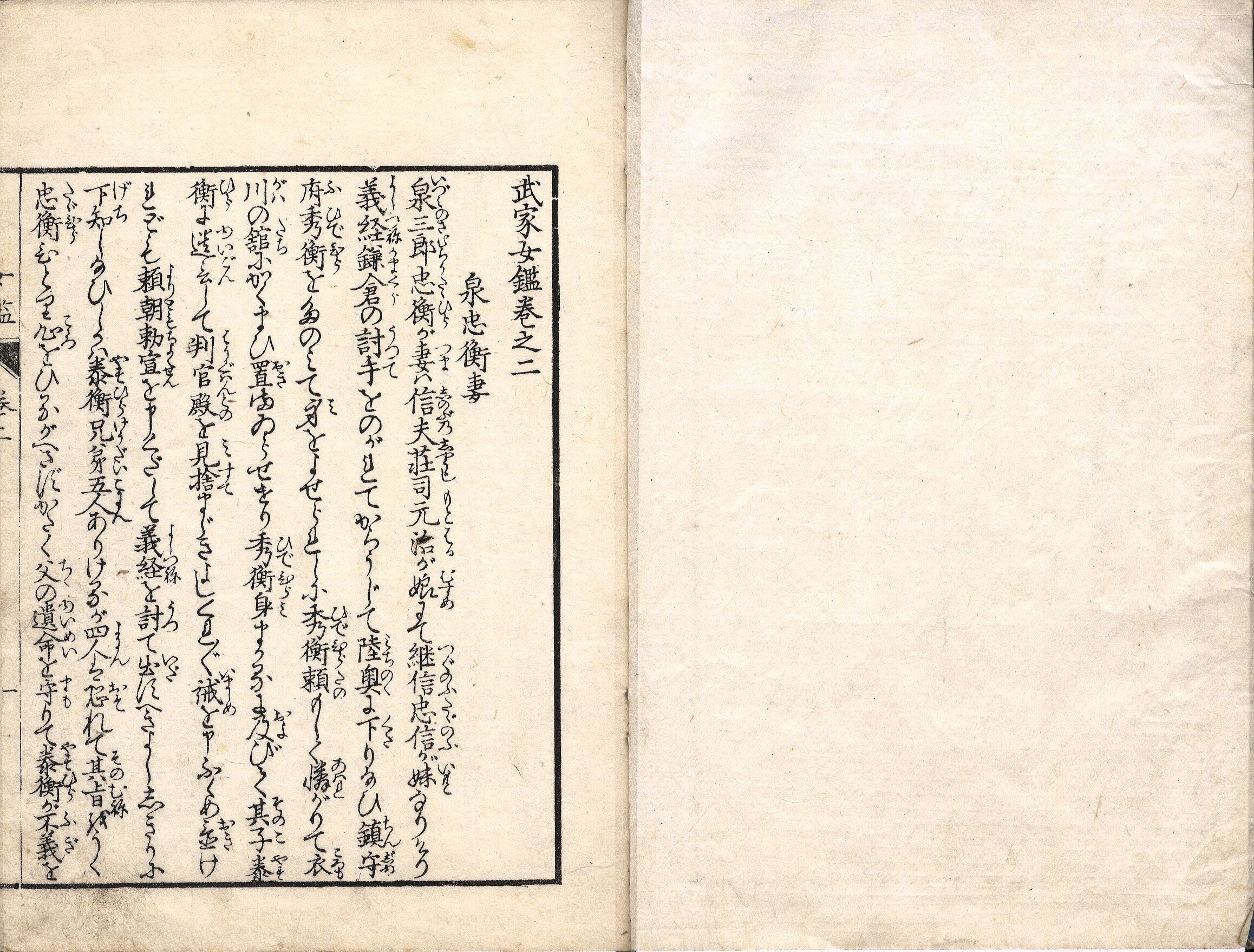 【備考】分類「往来物」。『武家女鑑[武家女可々美・〈教訓〉女鑑]』は、日本古今の貞女・烈婦の略伝を集めた女子教訓。序文に「いにしへ今の節婦・賢女のものがたり、世のものゝふの妻の身をてらす鑑にも成なん事ども…」とあるように、日本古今の貞女・烈婦の略伝を集めた女子教訓。本文をやや小字・10行・ほとんど付訓で記す。序文では本書が女性のみならず、男性にとっても「鑑」であることを述べる。巻之一に棚津媛(たなづびめ)・上毛野形名(かんづけのかたな)妻・安倍則任(あべののりとう)妻・源為義継室など11人、巻之二に泉忠衡妻・仁田忠常妻・毛利西阿(さいあ)妻・北条時頼母など12人、巻之三に那須資友(すけとも)母・山名氏清(うじきよ)女・大内義隆妻・今川氏親(うじちか)妻など11人の計34人の小伝や逸話を紹介する。うち、14人については見開き挿絵を掲げるが、いずれも「形名の妻、夫をいさめて力戦する図」「奈良義成の妹、家兄の敵・貞光久左衛門尉を討て自殺の図」のように、名場面を劇的に描く。なお、本文の所々に伏せ字が見られる。