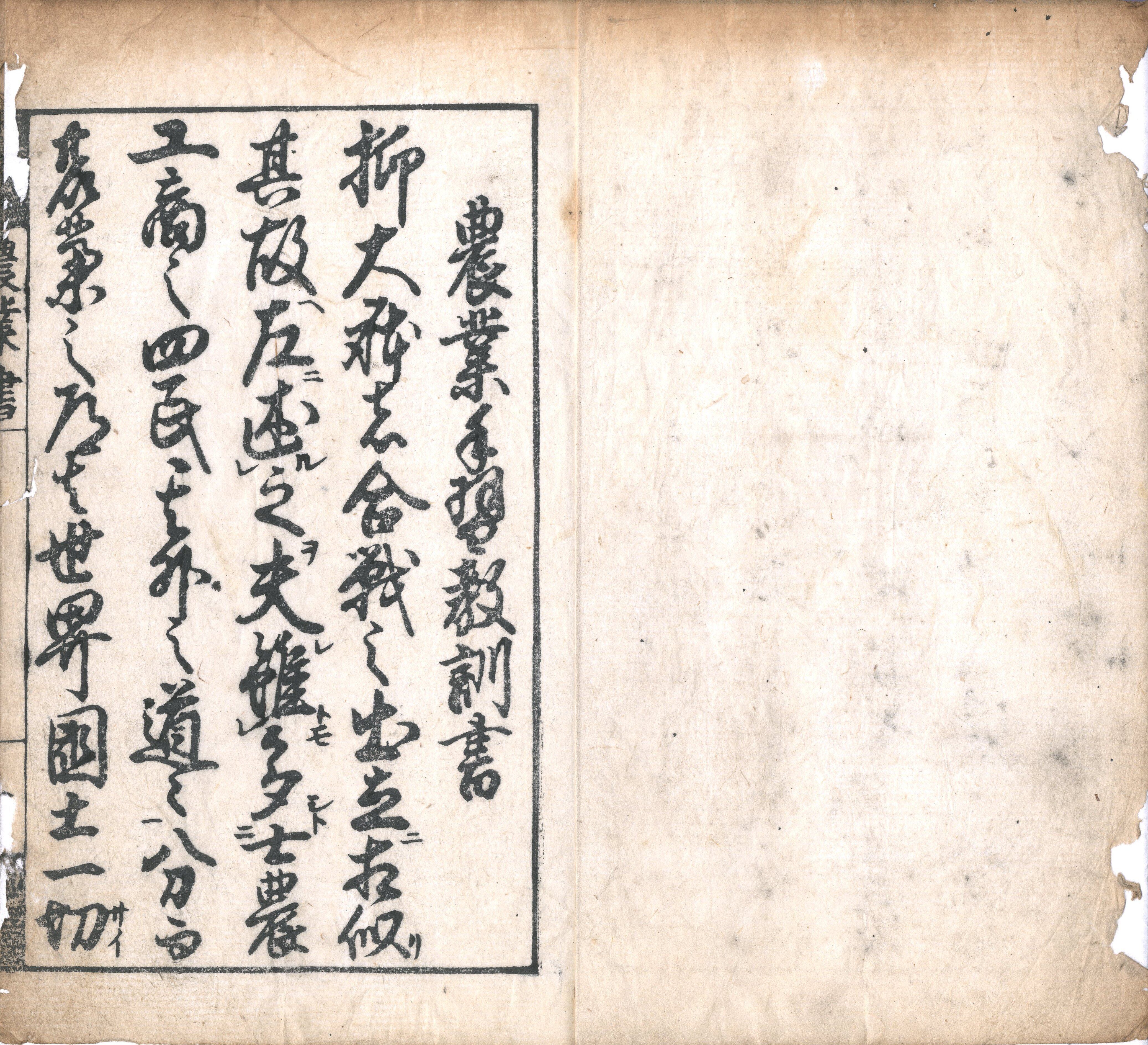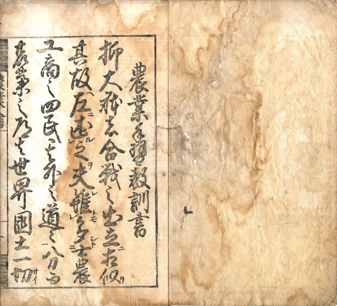 【備考】分類「往来物」。西村明観作、文政5年刊『農家手習状』とは別内容。江戸初期から普及した『初登山手習教訓書(手習状)』を模倣して農業心得を記した往来物。「抑、大躰者合戦相似。其故左述之。夫、雖多士農工商之四民其外之道々、分而農業之道者、世界国土一切万端之可成根本…」と筆を起こし、まず田畑耕作が「国下(家)一大事」たることを述べ、続いて、武具に匹敵する農具の重要性、さらに、一年間の耕作上の注意や農民生活の心得、人倫五常の道などを説く。本文を大字・5行・無訓で記す。羽州村山郡成生(現・山形県天童市)出身の僧・栄岳が、天明飢饉に際して寺子や檀家の人々の救済のために著し、私財を投じて上梓し、施本とした点で貴重。なお、出版地の普済禅院は、現・米沢市窪田町小瀬70番地の曹洞宗持院、普済寺と推定される(『山形県立博物館ニュース』76号)。