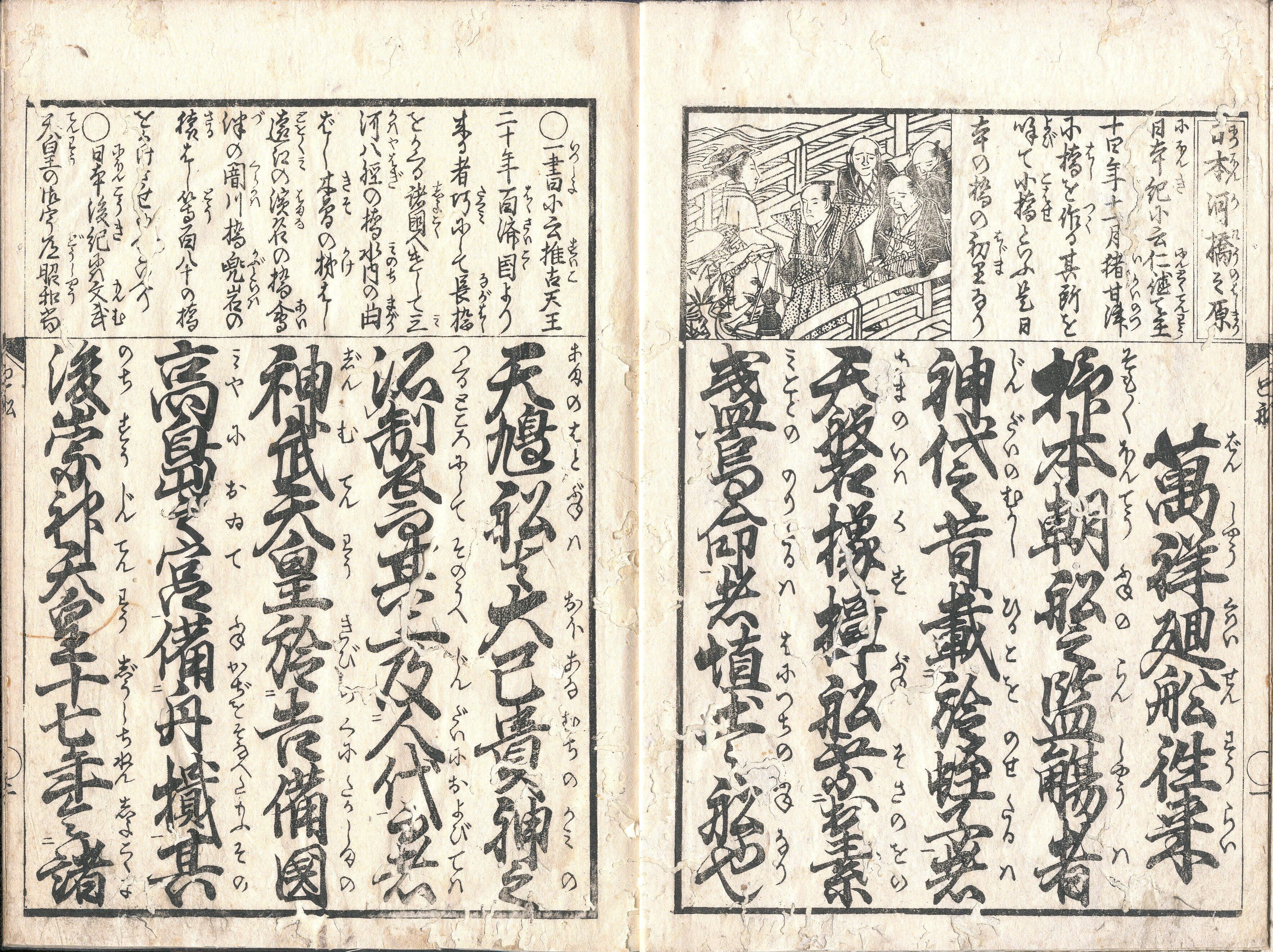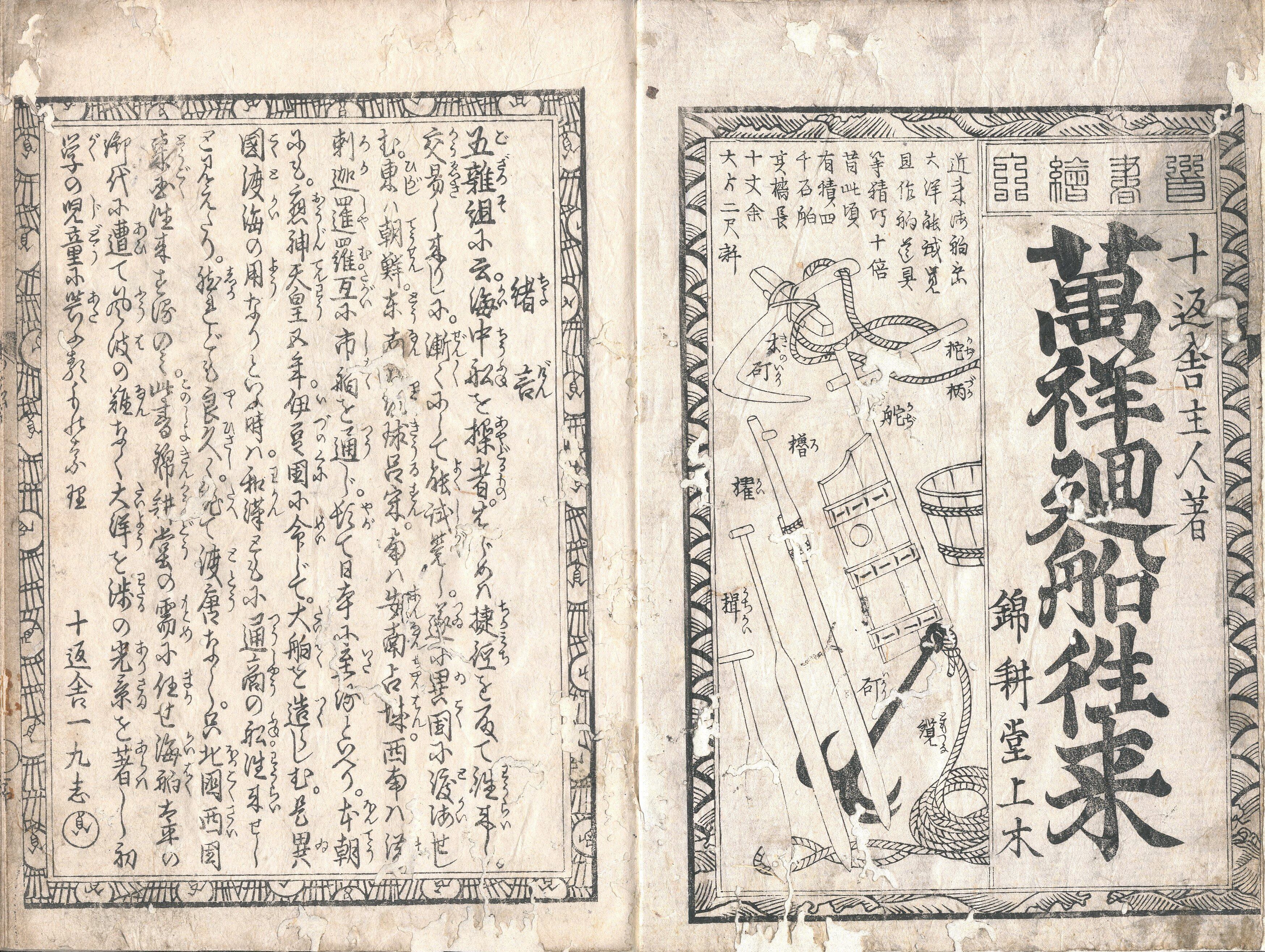 【備考】分類「往来物」。題簽は国会本の画像により複製。日本における船の歴史、船舶の種類と用途、および各部の名称と機能・材質、さらに船の守護神である住吉大明神などについて記した往来。本文を大字・5行・付訓で記す。神代以来の日本の船の濫觴や、貴人の船首に竜や青鷁(せいげき)を描く理由などに触れた後、廻船・上荷船・茶船・游艇(はしぶね)から渡船、一枚棚など10数種類を紹介し、さらに舳・艫・舵・櫓・櫂・柁・纜(ともづな)・帆・檣(ほばしら)等を説明し、最後に廻船の積載量について500-600石以下が普通だが、天和・貞享頃から千石船も登場したことなどを述べる。だが、本書の多くは『和漢三才図会』巻34「船橋類」「船之用」に基づくものであり、「遊山船」の条で隅田川の屋形船や、遊廓通いに用いられる猪牙舟など、江戸の人々に親しみのある舟を提示するあたりに若干の独自性を見出すことができよう。表紙見返の用具類の絵や緒言も『和漢三才図会』をそのまま利用している。なお、頭書には「日本河橋の原(はじまり)」や「江戸より大坂海路」「大坂より西国舟路」「室積より九州舟路」など国内諸国への海路についての記事などを掲げる。
