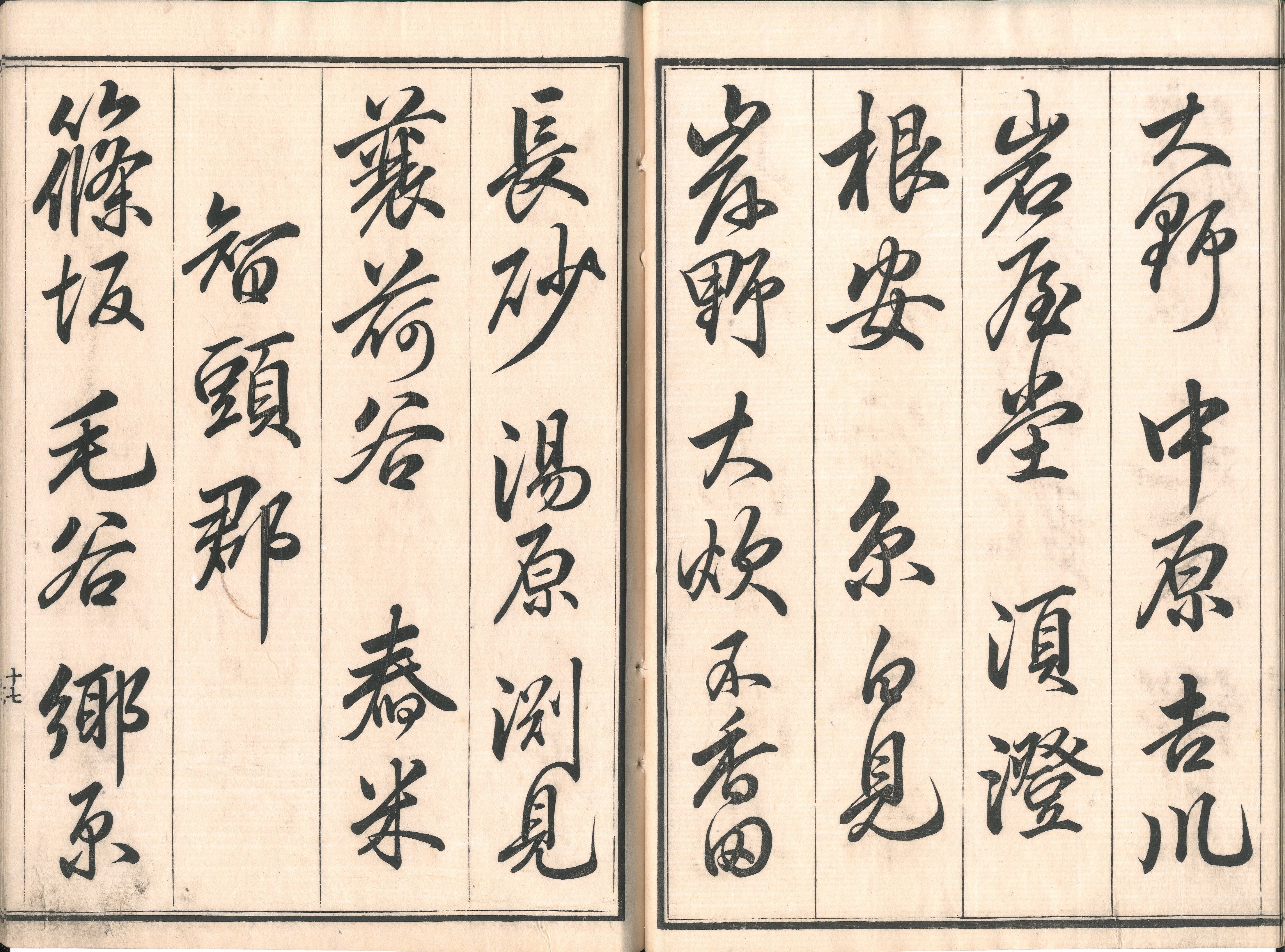 【備考】分類「往来物」。因幡国の郡名・町村名・寺社その他地名を、邑美郡・岩井郡・法美郡・八東郡・智頭郡・八上郡・高草郡・気多郡の順に列挙した手本。大字・4行(1行約6字)・無訓で記す。表紙共紙の刷り表紙に簡易な大和綴じ。