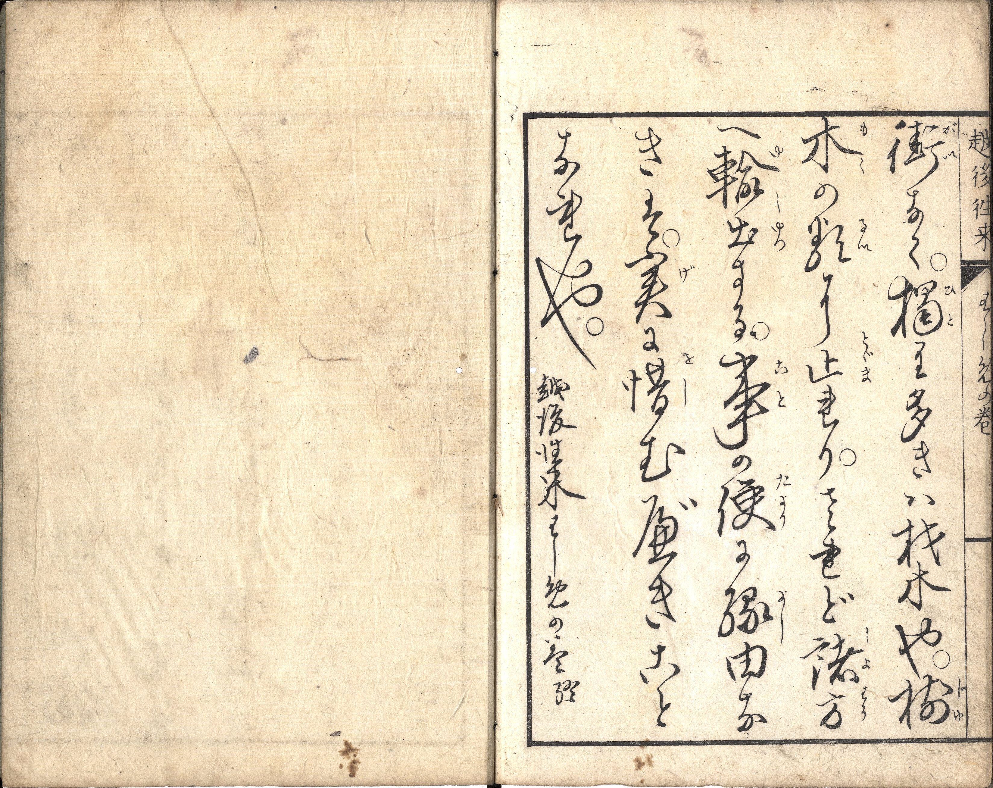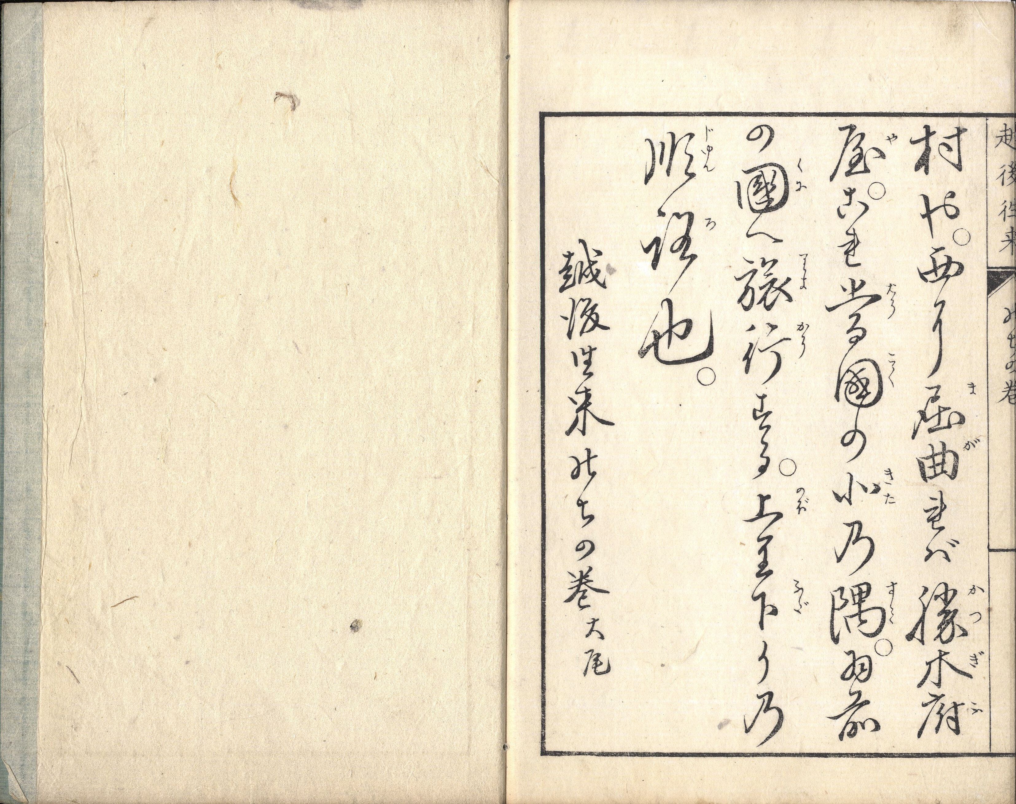 【備考】分類「往来物」。嘉永板2種と、口絵を差し替えた後印本の3種を収録した(差替本については別途、軽量の全冊画像も収録)。『駅路往来』は、主として本陣・旅宿の子供の教育向けに、道路交通に関する常用語を綴った往来。「夫、道中筋、駅路泊宿、本陣、問屋、役人、宿場、年寄、馬借、月行事等、日夜不致油断、諸事廻深慮、麁略無之様叮嚀第一也…」と起筆して、東海道中の状況、旅行用具、旅宿の注意等、旅行に関する注意を詳細に記す。本文を大字・4行・付訓の手本様に記し、本文中に挿絵2葉を掲げるほか、巻頭に「三都諸方行程附(みちのりづけ)」、巻末に「大日本国尽」を収める。なお、序文に代えて「菅公肖像」などの色刷り口絵を付した後印本もある。刊記に「天保四年己十月官許」と記すが、刊行年代と20年も離れており、既に死去していた竜章堂の遺筆を何かの事情で後年に刊行したものであろう。