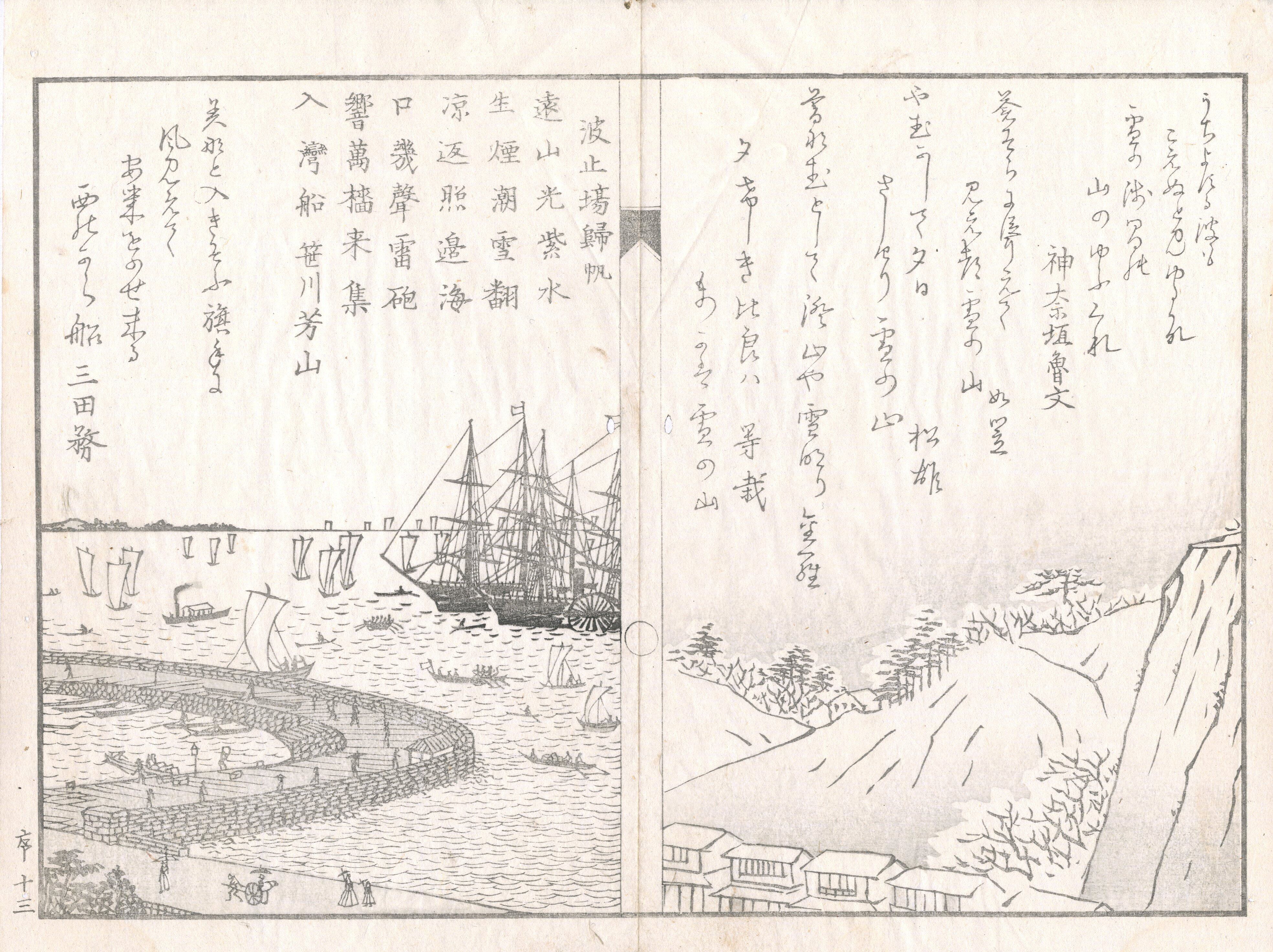 【備考】分類「往来物」。2種を全冊収録(1本は袋綴じ展開収録(見開き図再掲)、もう1本は通常収録)。『横浜地名案内』は、「明けく、治る御代の春の日の、豊かにつゝく横浜の、市の衢(ちまた)は縦横に、甍並へて錐か立、処も見えす本町の、北に南に仲通…」で始まる七五調の美文体で、伊勢山秋月・本牧晴嵐・浅間山暮雪・波止場帰帆・公園夜雨・鉄橋夕照・吉田落雁・北方晩鐘の「横浜八景」を中心に、横浜周辺の主要地名や産業・風趣などを紹介した往来。本文を大字・5行・付訓で綴る。また、題字・序文・跋文と「横浜八景」を呼んだ詩歌・俳句と色刷り挿絵から成る前付・後付記事に、本文よりも多くの丁数を割くのも特徴。
