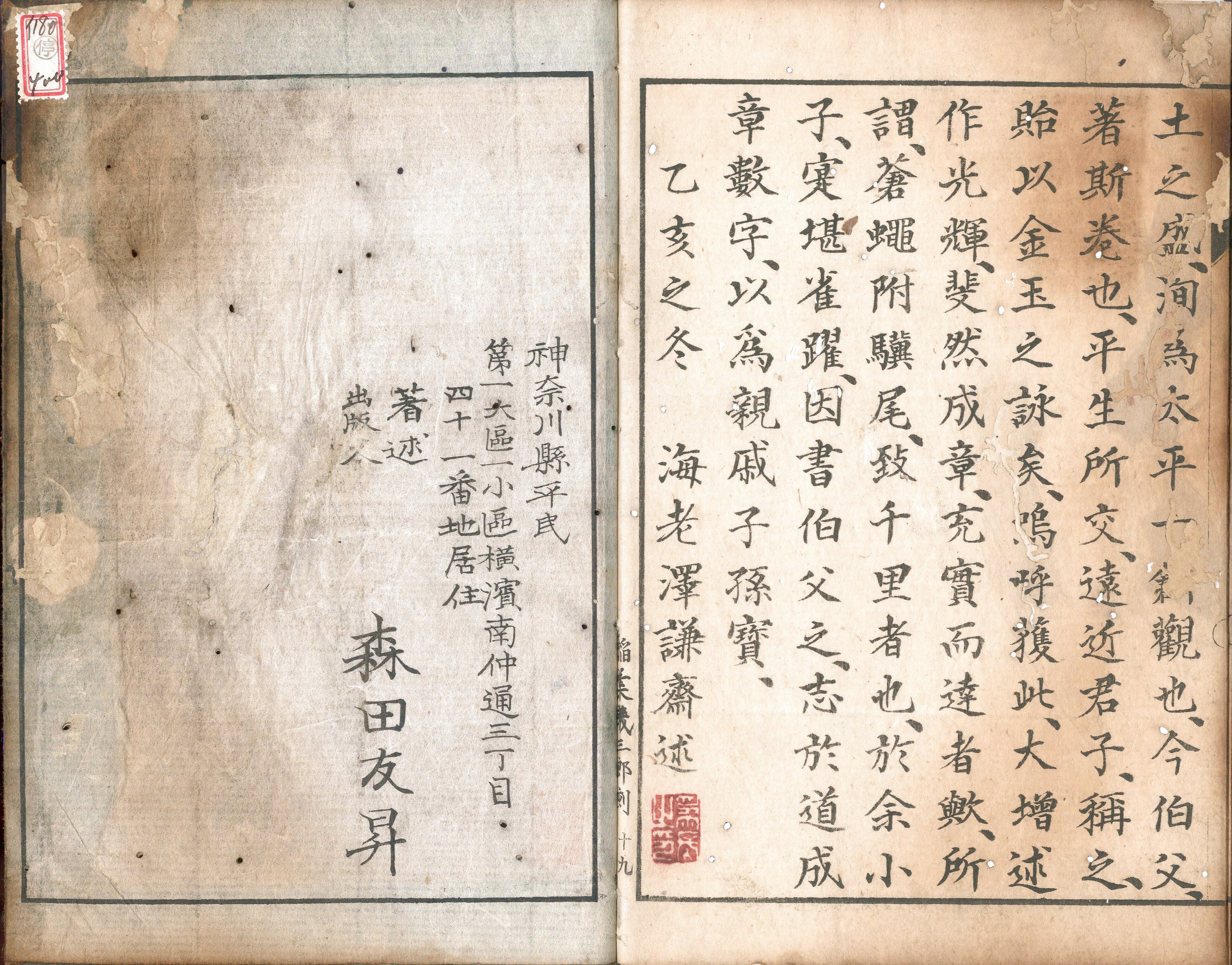 【作者】森田友昇(嘯月)作・序。三森三木雄書。山東直砥・平家真宝(梅花)・加藤祐一序。三島外史・海老沢謙斎跋。