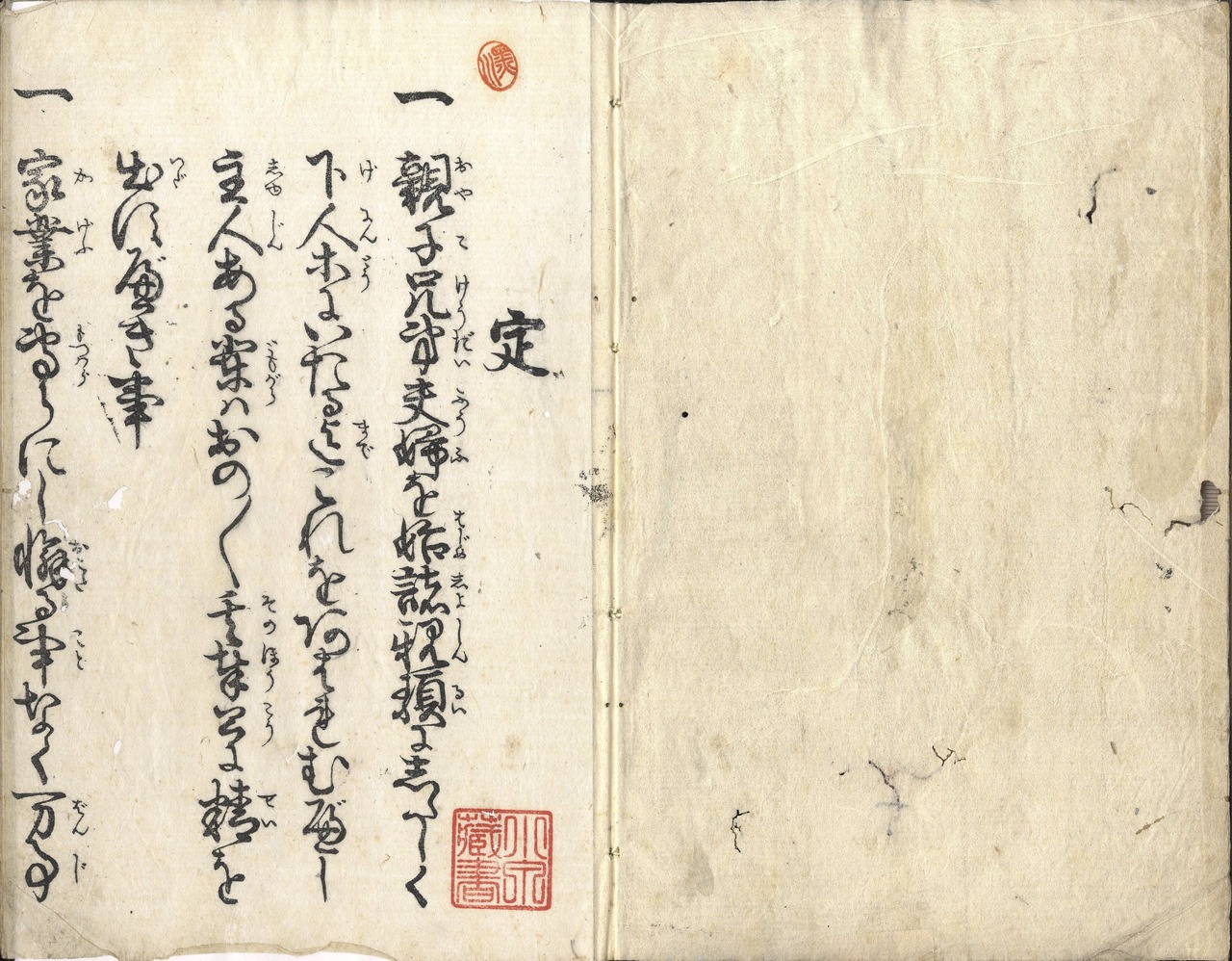【備考】分類「往来物」。「一、親子・兄弟・夫婦を始、諸親類にしたしく、下人等にいたる迄、これをあはれむべし…」で始まる正徳元年5月の7高札、また明和7年7月と天保13年7月の高札など、合計9つの高札を集めた往来物。本文を大字・6行・付訓で記す。
