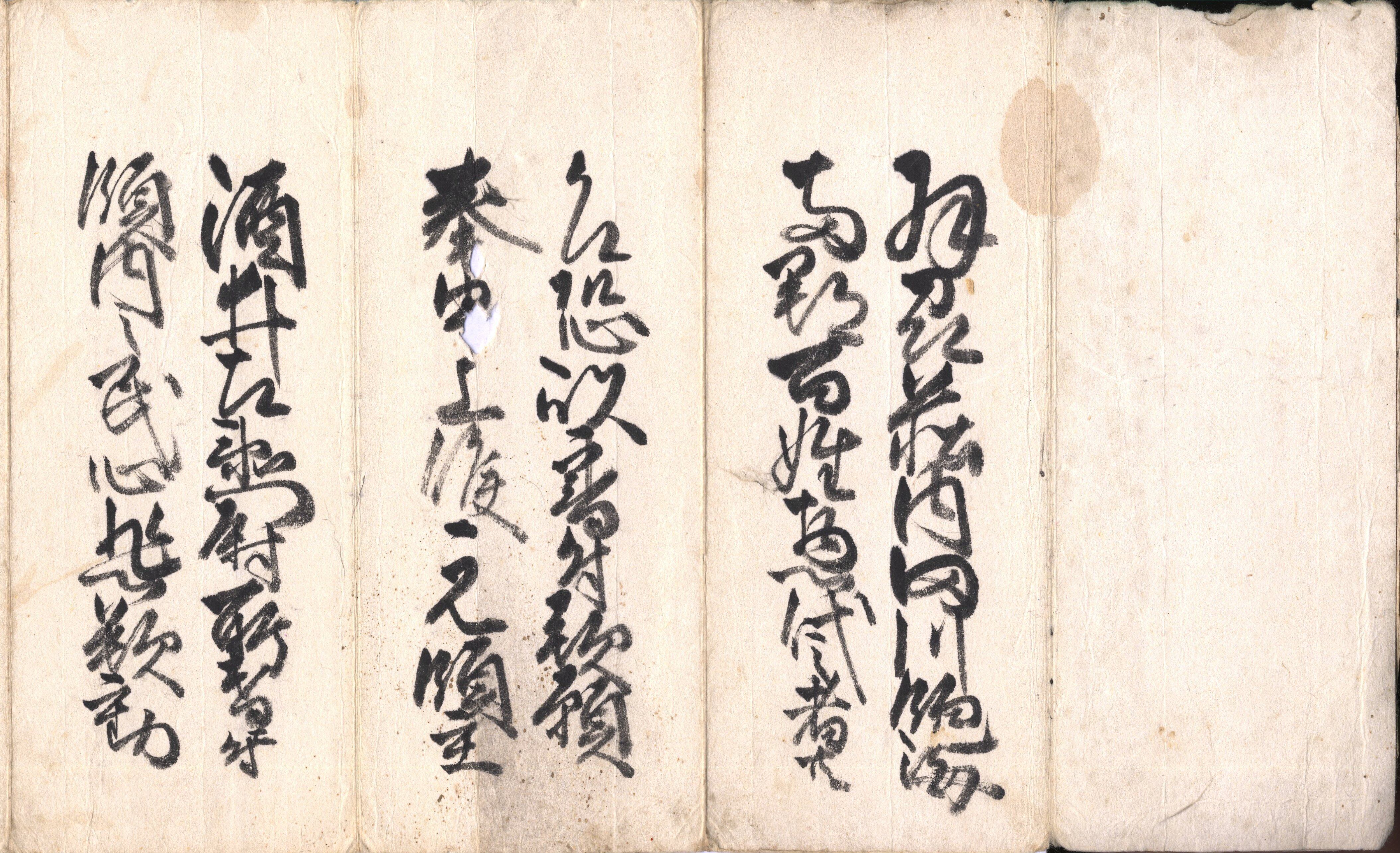 【備考】分類「往来物」。羽州庄内田川・飽海両郡の百姓惣代である田川郡本郷村・久兵衛と田川郡名川村・荘右衛門の名前で庄内藩を従来通り左衛門尉酒井家の支配となることを歎願した書。折手本の手習い用に作り、目安往来物の一種と見られる。慶応4年5~9月の奥羽越列藩同盟は一時は30藩を超える大同盟となったが、官軍の進攻で寝返りする藩や大敗・降伏する藩が相次ぎ、5カ月で瓦解した。明治元年9月末に庄内藩も恭順したが、最後まで自領に新政府軍の侵入を許さなかった。明治元年12月、庄内藩は公地を没収され、11代藩主酒井忠篤は謹慎処分となり、弟の忠宝が12万石に減封の上、陸奥会津藩へ、翌明治2年6月には磐城平藩へと転封を繰り返した。本間家を中心に藩上士・商人・地主などが明治政府に30万両(当初は70万両の予定だったが揃わず減額が認められた)を献金し、明治3年、酒井氏は庄内藩へ復帰した。本書は、このような趨勢の中で義民として活躍した人々の働きを伝えるべく綴ったものであろう。